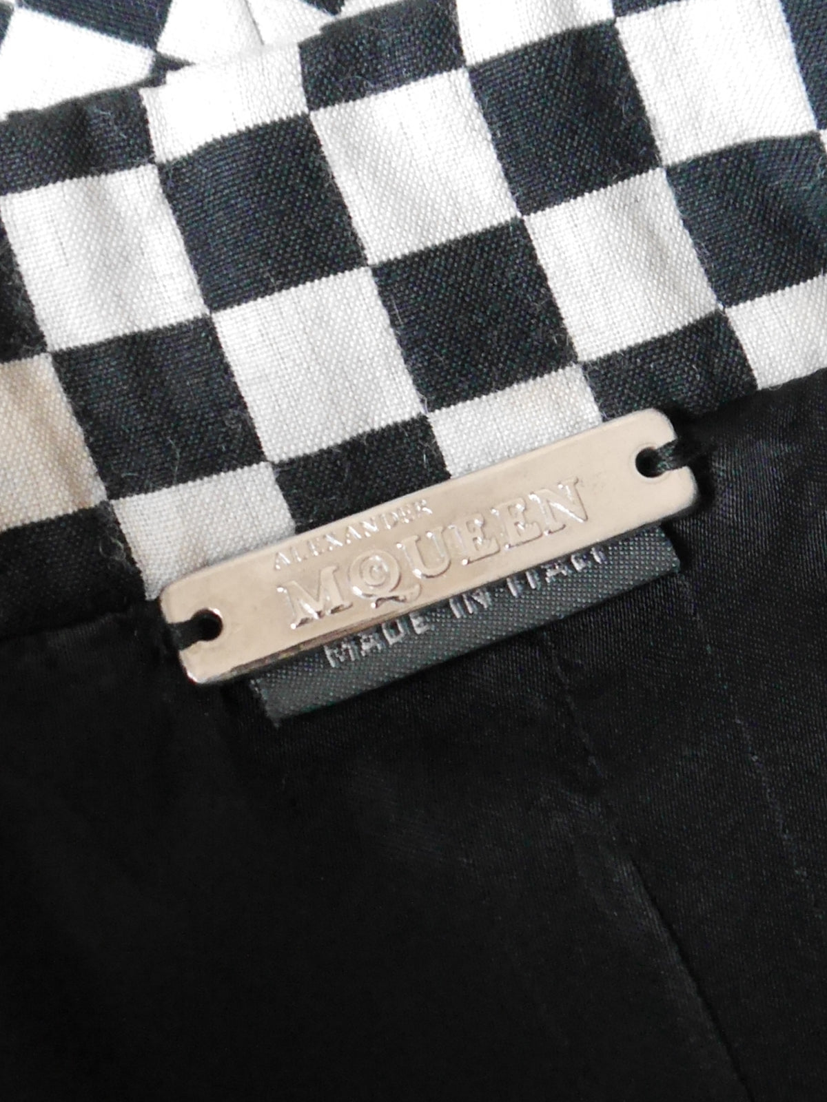From his Fall 2003 'Scanners' collection, this rare vintage Alexander McQueen jacket is crafted from a cotton-virgin wool blend with a striking black and white graphic check pattern. It is masterfully tailored and features a razor-sharp cut that traces the lines of the body. The intricately set and lightly padded fabric enhances this sculptural look and feel to create an op-art appeal. The jacket has a stand-up collar, front pockets and a zipper closure. The collar closes with a concealed snap button. Made in Italy.