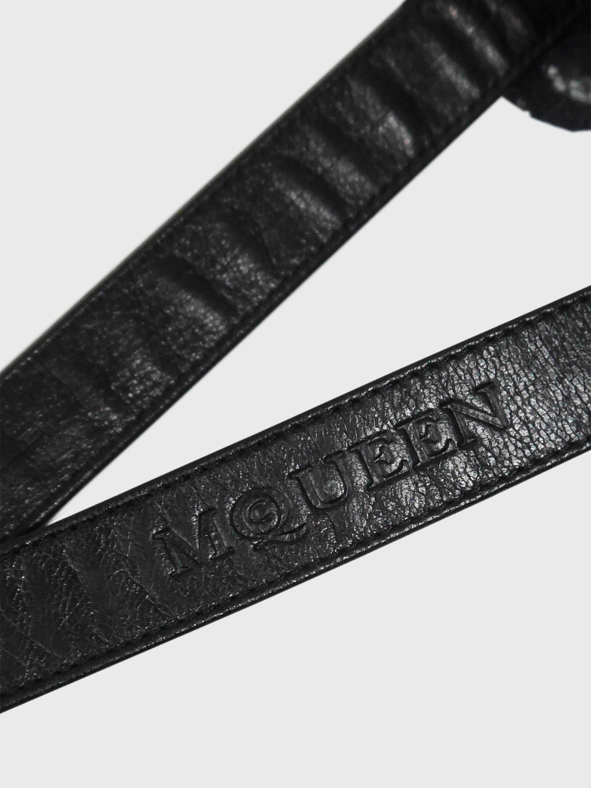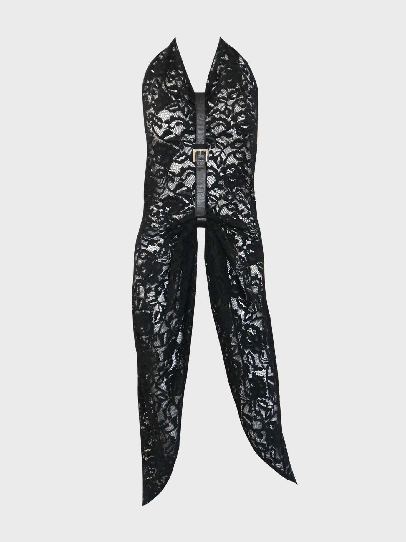 This rare vintage Alexander McQueen dress or tunic from the iconic "No. 13" spring 1999 collection is made of black lace and features a halterneck bodice with an open back and a flared, hi-low skirt that ends between knee and calf length. The dress can be worn with or without the original black leather belt with silver metal buckle. It is this belt that makes this dress so special, as it is worn vertically and runs through loops on the front that gather the fabric into a tailcoat hem, creating a sort of harness or bondage effect. The dress closes with a back zipper and hidden snaps at the neck. No material label, unlined. Made in Italy.