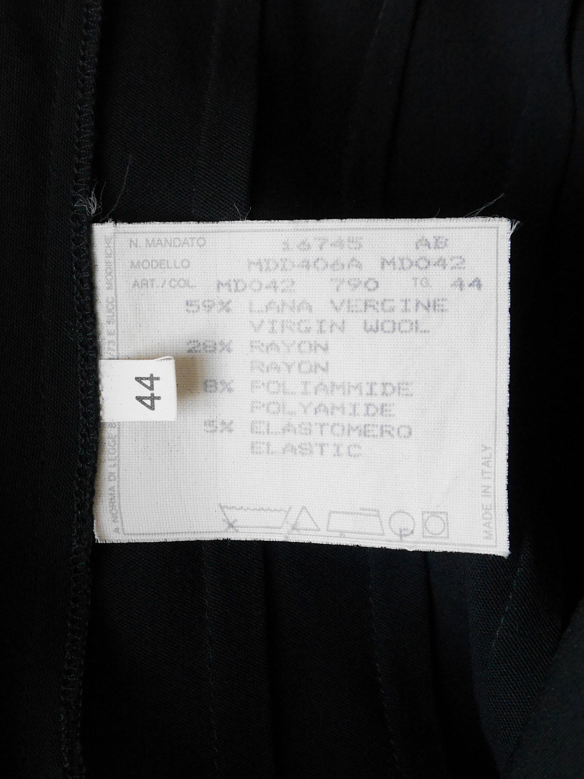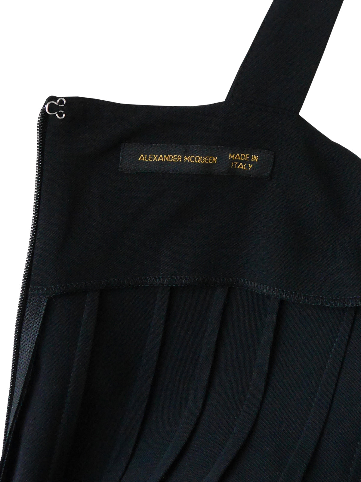 This rare vintage Alexander McQueen dress from his Spring 2002 "Dance of the Twisted Bull" collection is made of a black virgin wool mix and features a characteristically sharp cut with a fitted sleeveless bodice with a scooped neckline and a widely flared pleated skirt that is actually longer at the front than the back, but is tied upwards at the front with straps and silver buckles for an avant-garde high-low effect, and you can play with the length. The dress closes with a back zipper and a metal hook. Made in Italy.