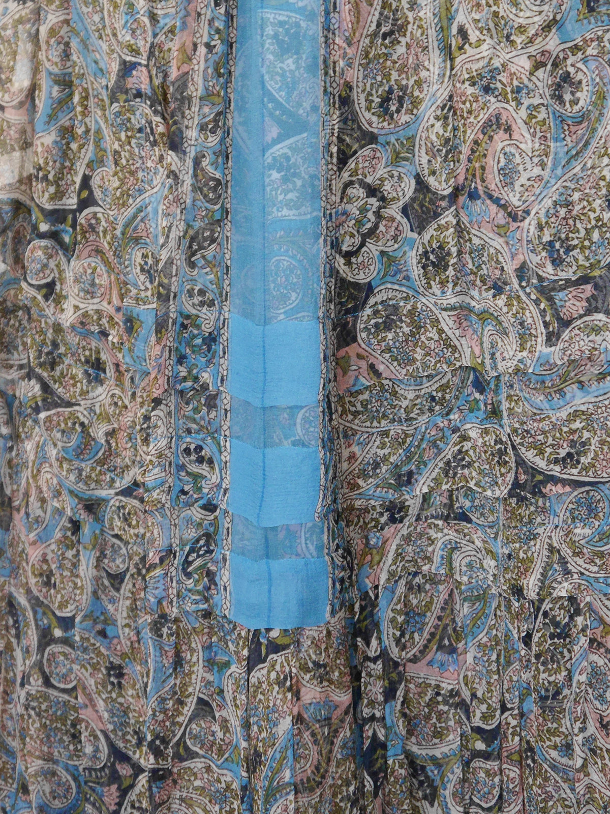 It has a relaxed and flowing A-line cut that makes it a perfect summer vacation dress. It is made of two airy layers of fine silk, with the bottom layer made of fine silk satin and the top layer made of slightly sheer silk crepe georgette. Both layers are printed with a very beautiful, detailed, colorful paisley and ikat print as well as plain sky blue sections. The transparency of the georgette, together with the shiny satin underneath, creates a very appealing visual effect.