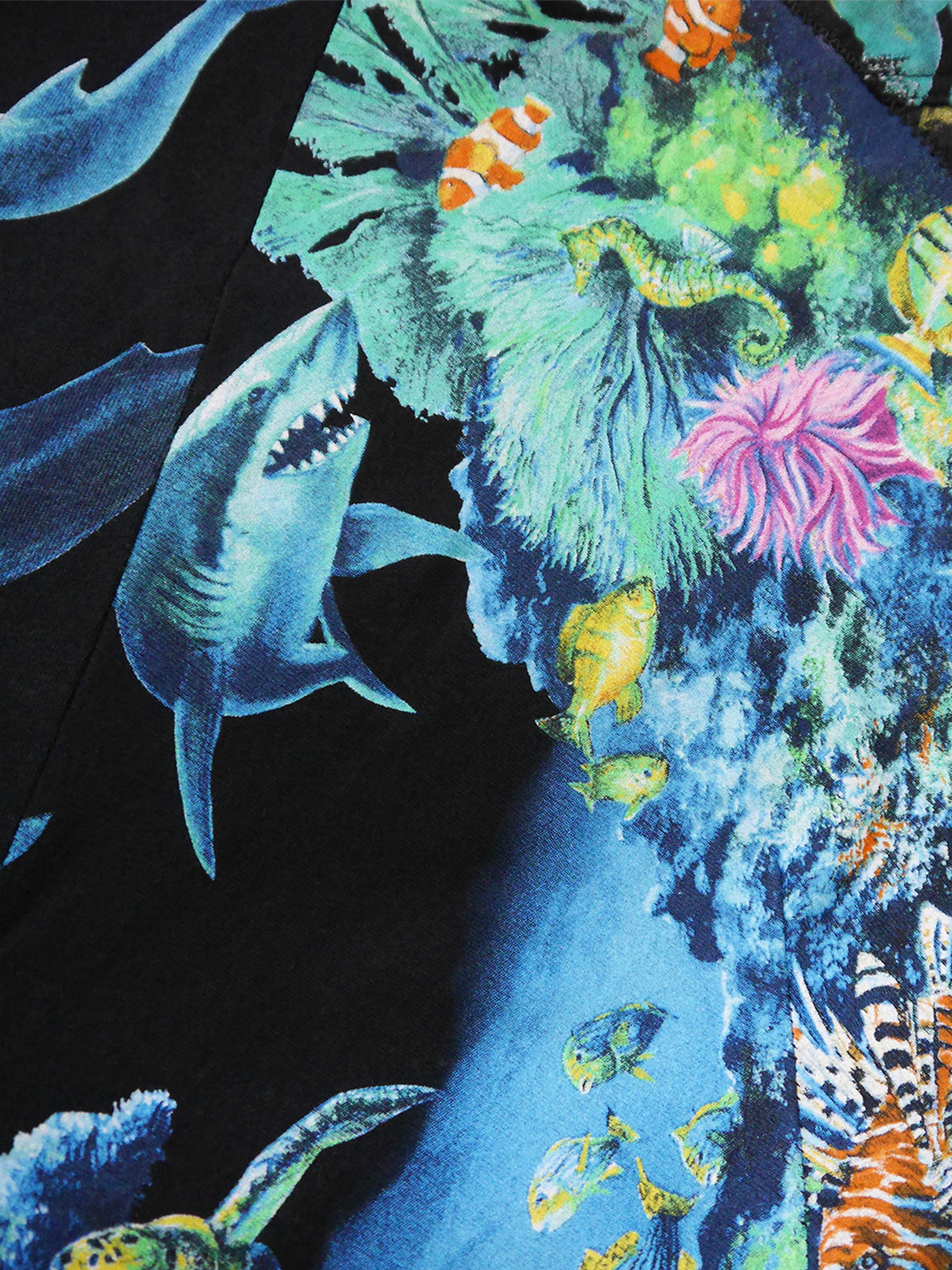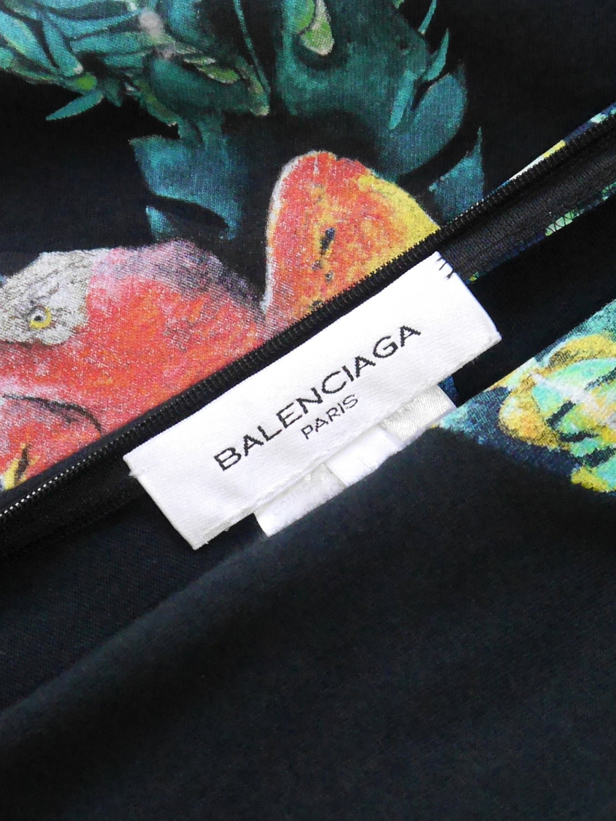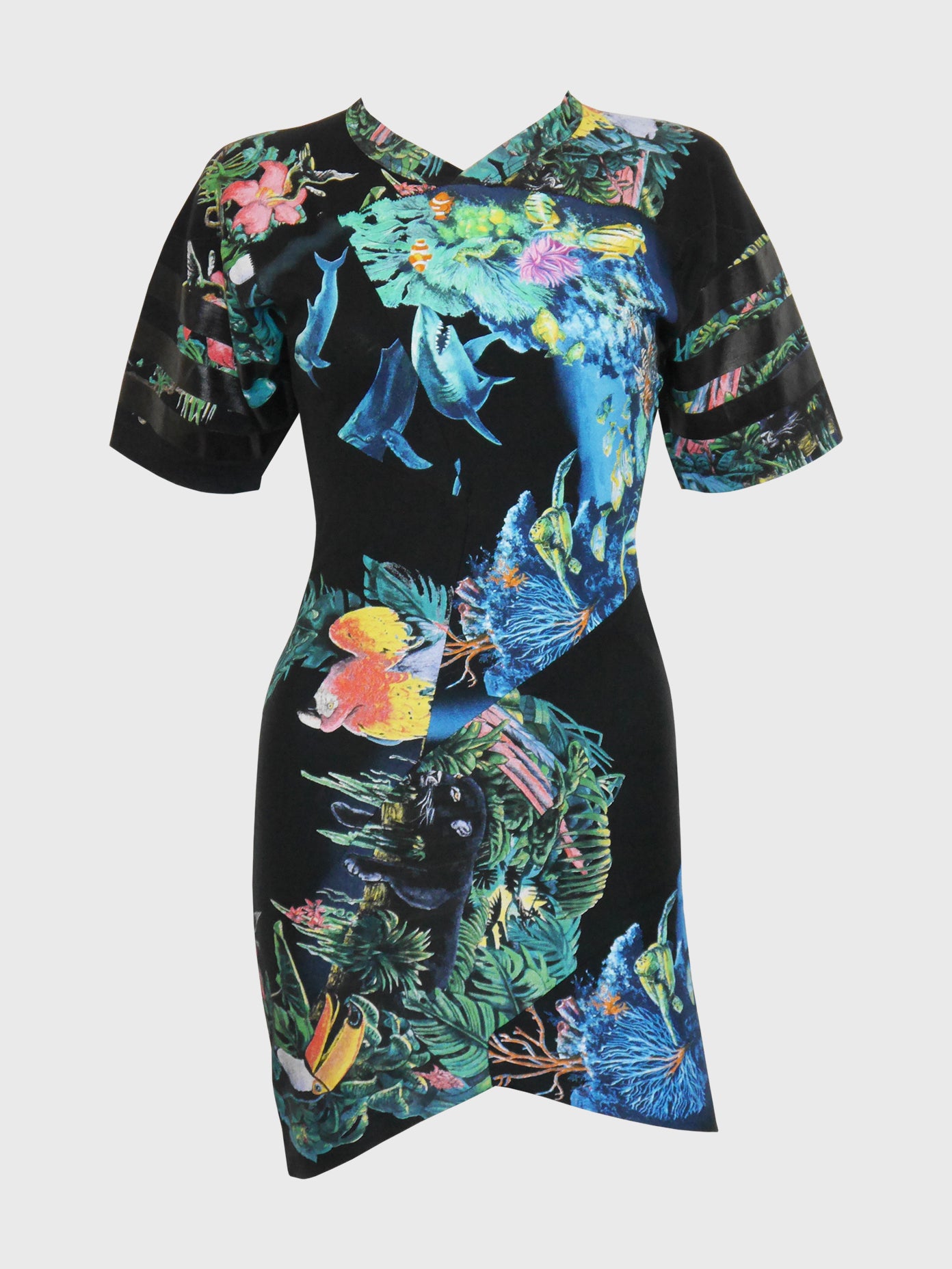 Designed by Nicolas Ghesquière for Spring 2003, this iconic and instantly recognizable Balenciaga Scuba dress is made of black cotton jersey with a rich underwater and jungle motif print in bright colors and black Scuba stitching. The dress has a seemingly simple but very sophisticated fitted bodycon cut with a small V-neck, wide elbow-length sleeves with black vinyl stripes and an asymmetrical mini length hem. Side zipper closure. 100% cotton, unlined. Made in France.