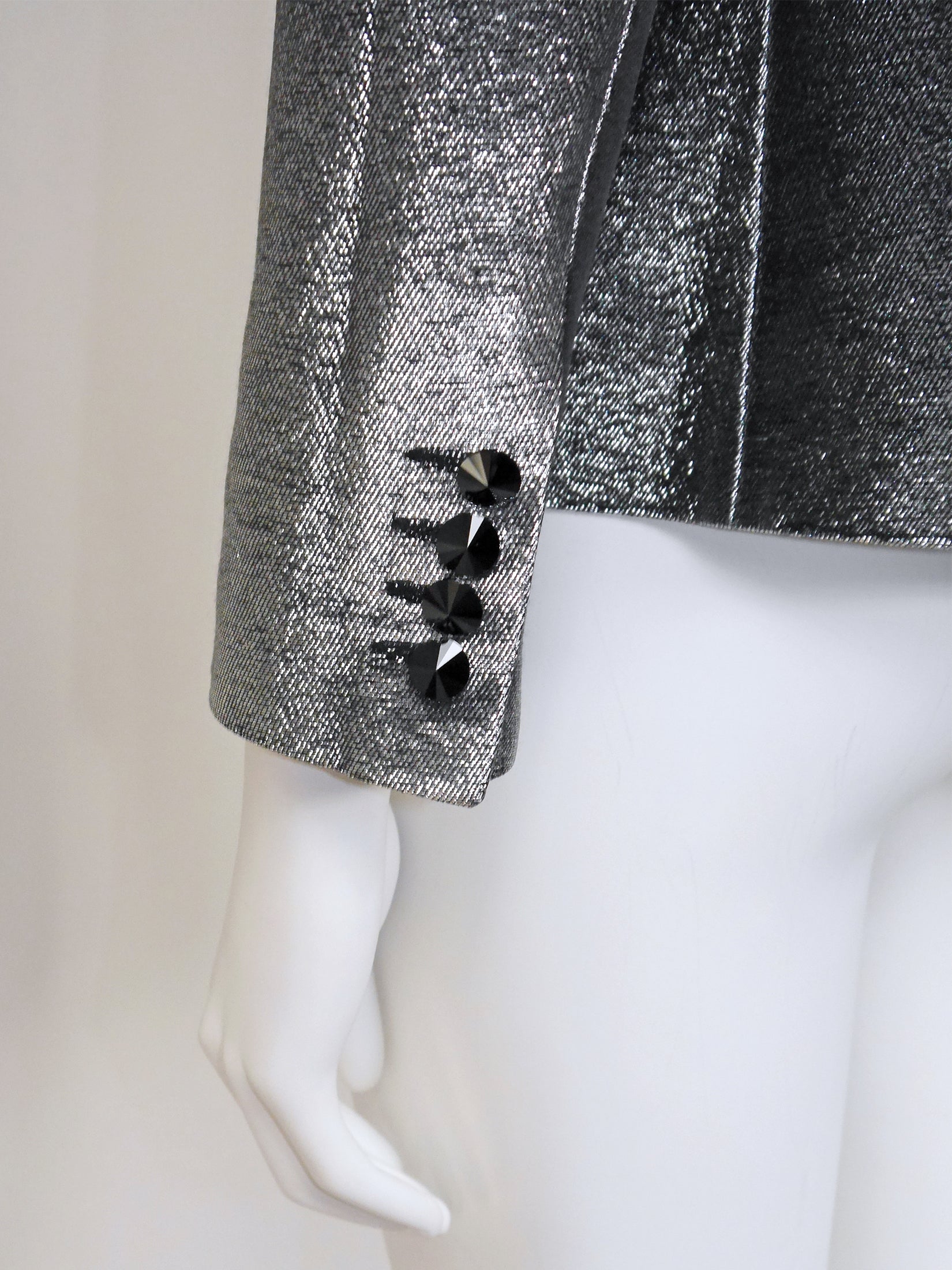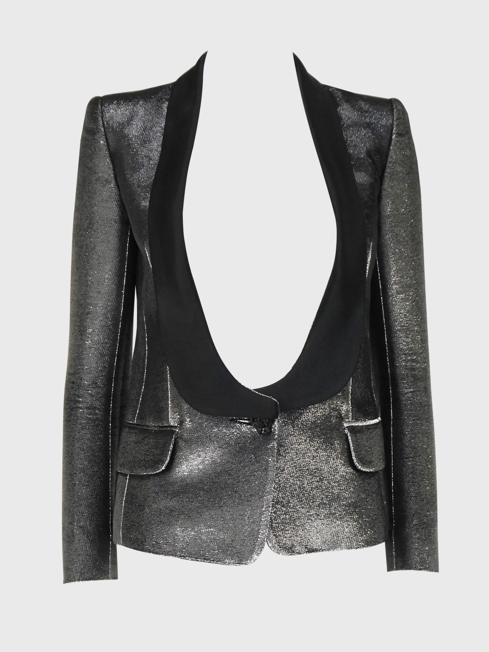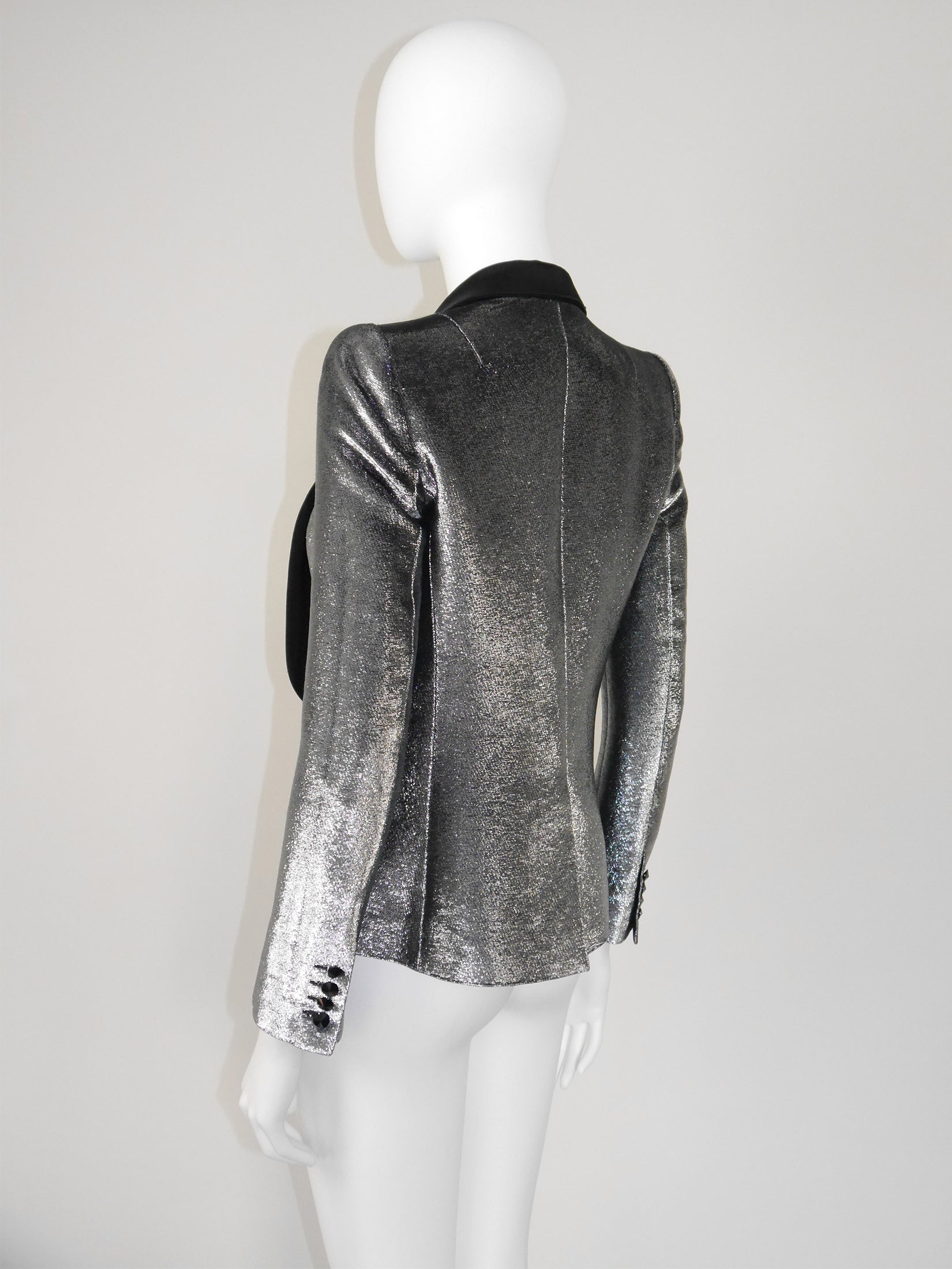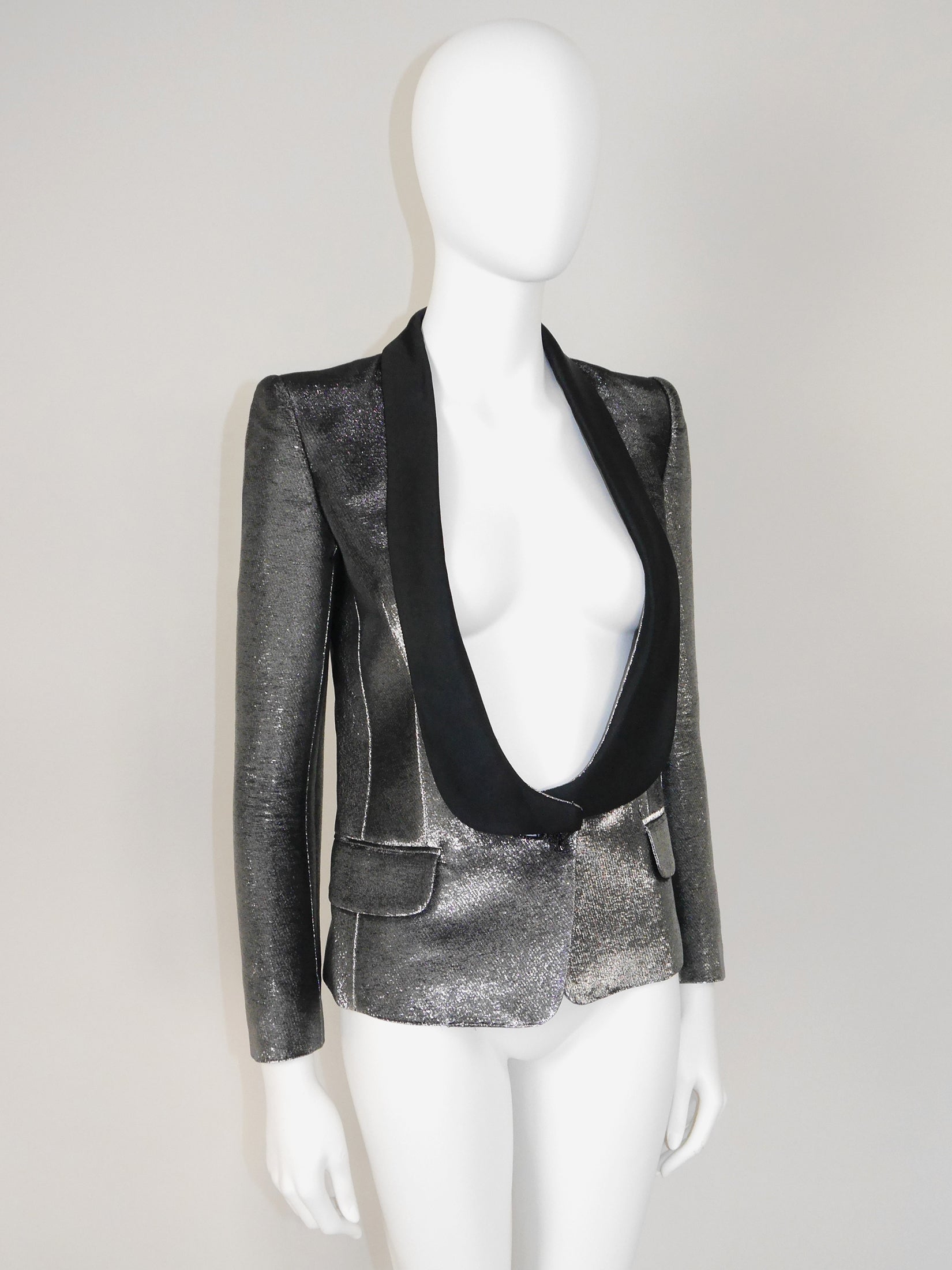 Expertly tailored for a razor-sharp, form-fitting silhouette, it features sculpted shoulders with light padding, a daringly deep neckline framed by luxurious black silk lapels, and sleek, narrow sleeves with four cuff buttons each. It closes with a single ornate button at the front. Crafted from black fabric that is densely shot with metallic silver threads, the jacket catches the light beautifully, shimmering with every movement for a truly show-stopping effect.