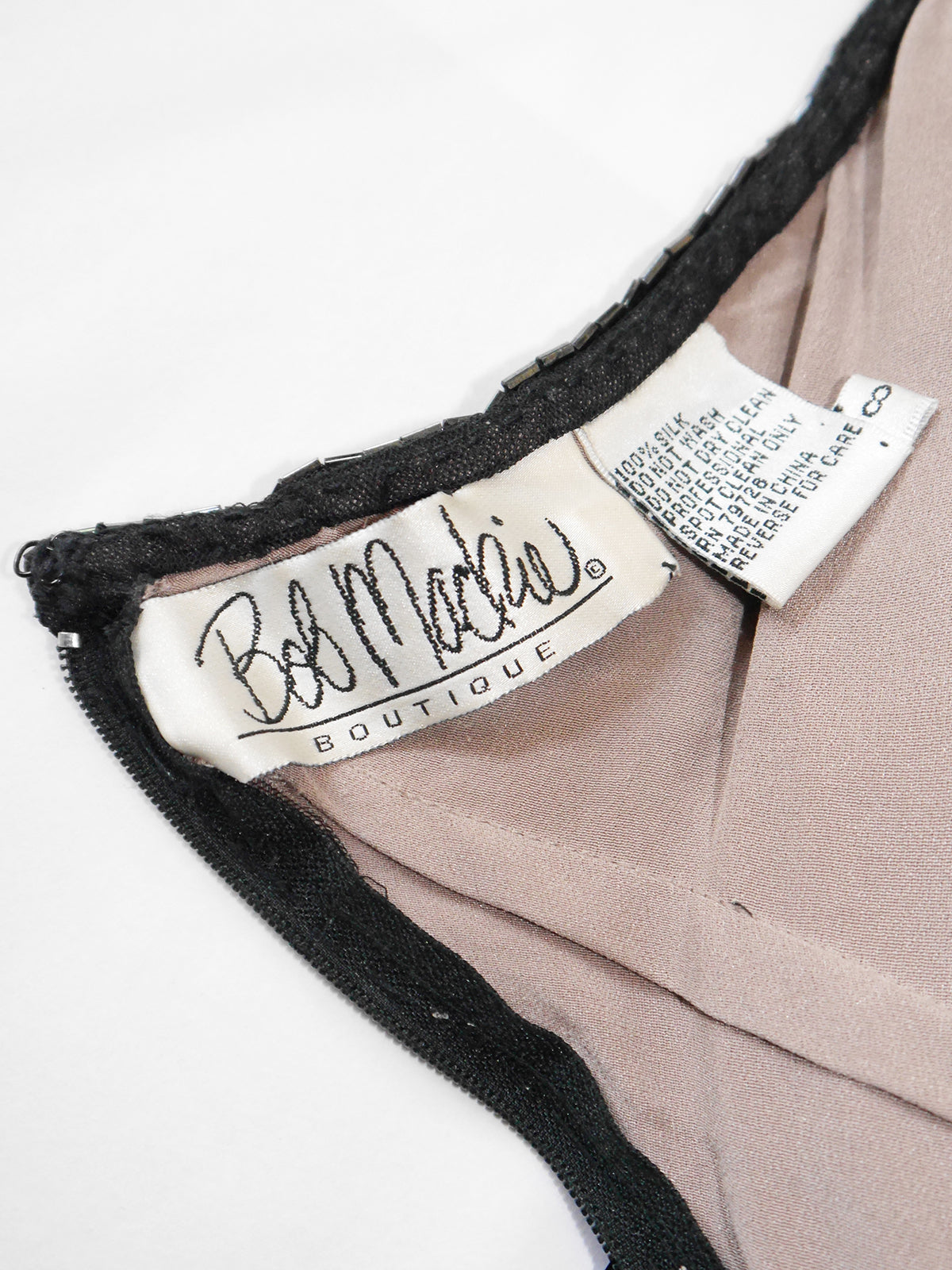 This glamorous vintage evening dress by Bob Mackie circa 1991 is made of fine black mesh embellished with sparkling sequins, faceted beads and bugle beads - all in black with silvery sheen. Sexy cut with open back and ultra short skirt with curved hem and beaded fringe. Hook and eye closure at the neck and asymmetrical zipper at the back of the dress. The dress has lightly padded cups and is lined in premium quality nude silk. It has considerable weight due to the thousands and thousands of tiny glass beads and is mostly handmade.