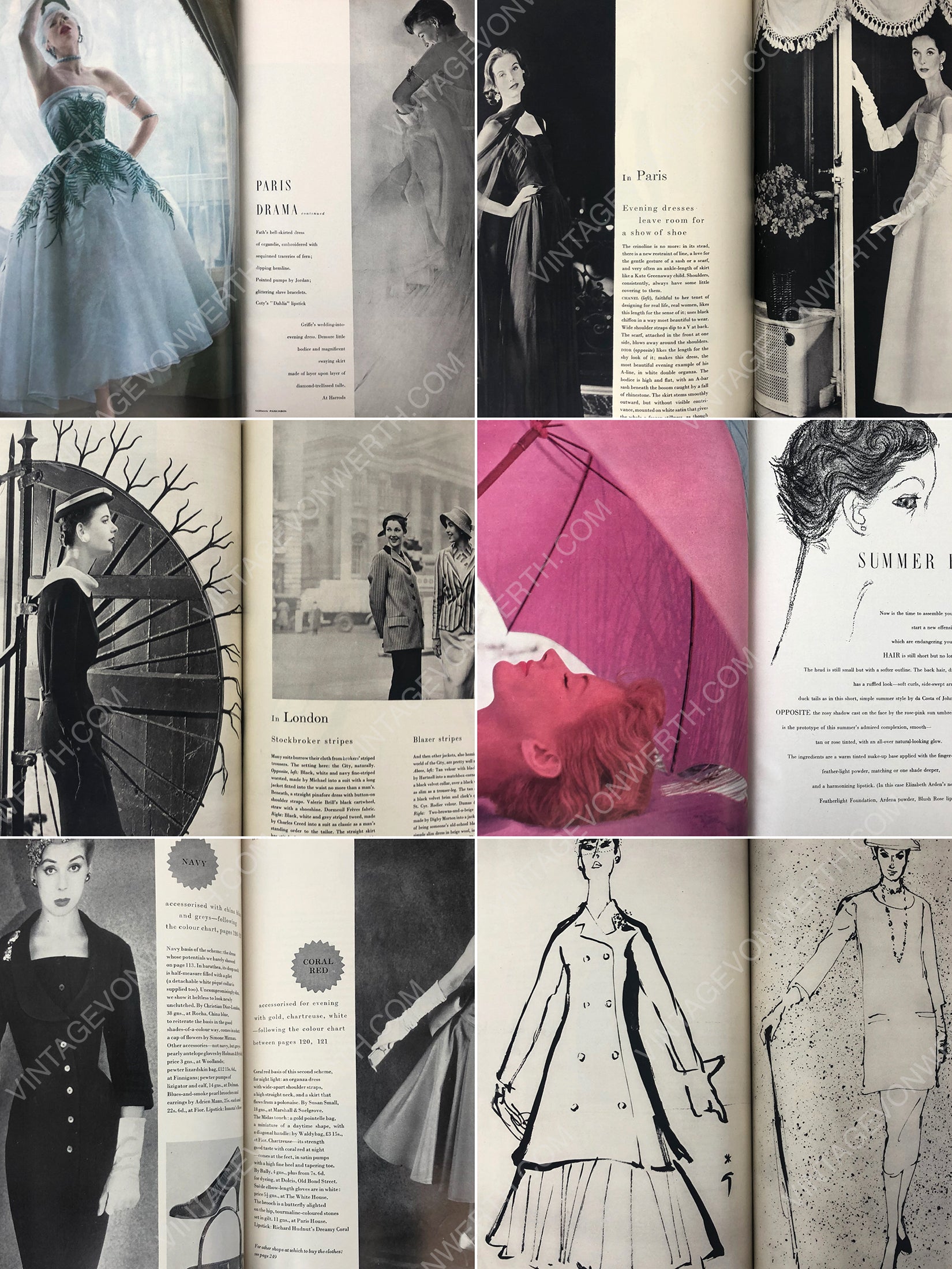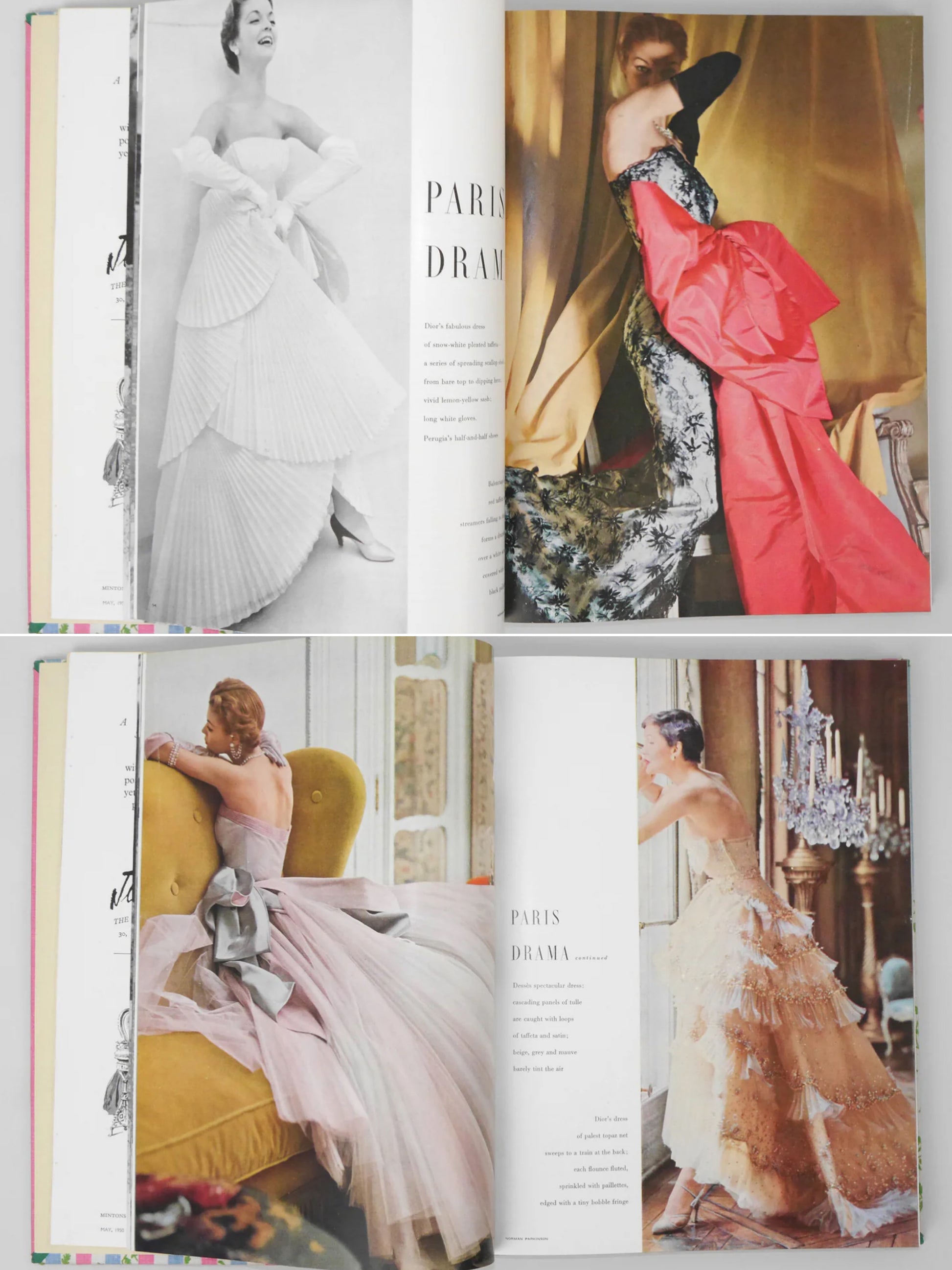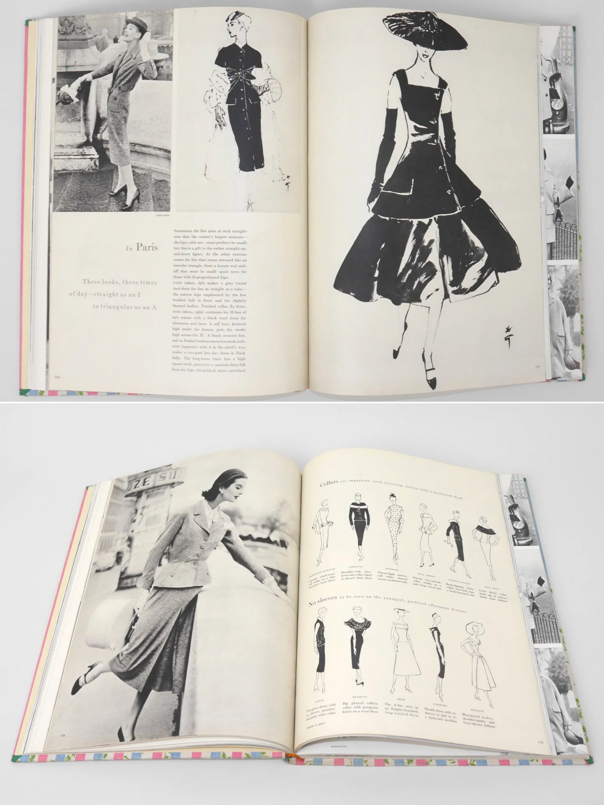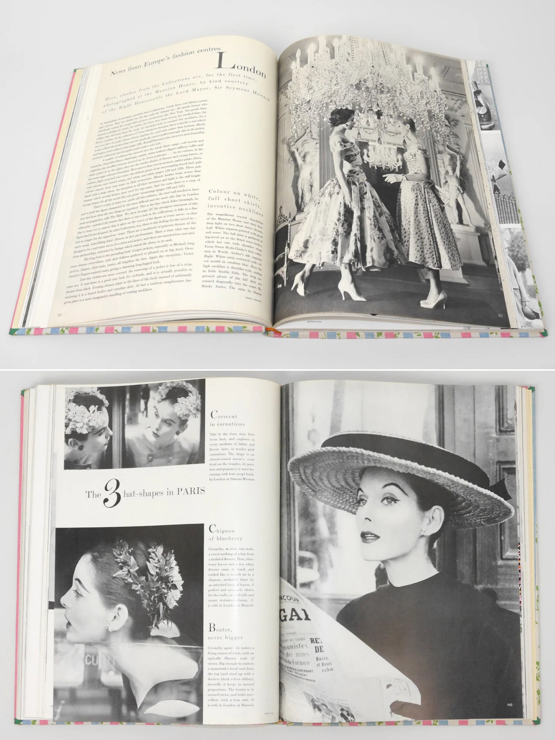 Notable photographers featured include Norman Parkinson, Irving Penn, Horst P. Horst, and Cecil Beaton. The volume also includes illustrations by René Gruau, adding a beautiful touch of artistry to the fashion content. Both the cover and the ad section before the editorial part have been removed from each issue, while the advertisements after the editorial section are still present.