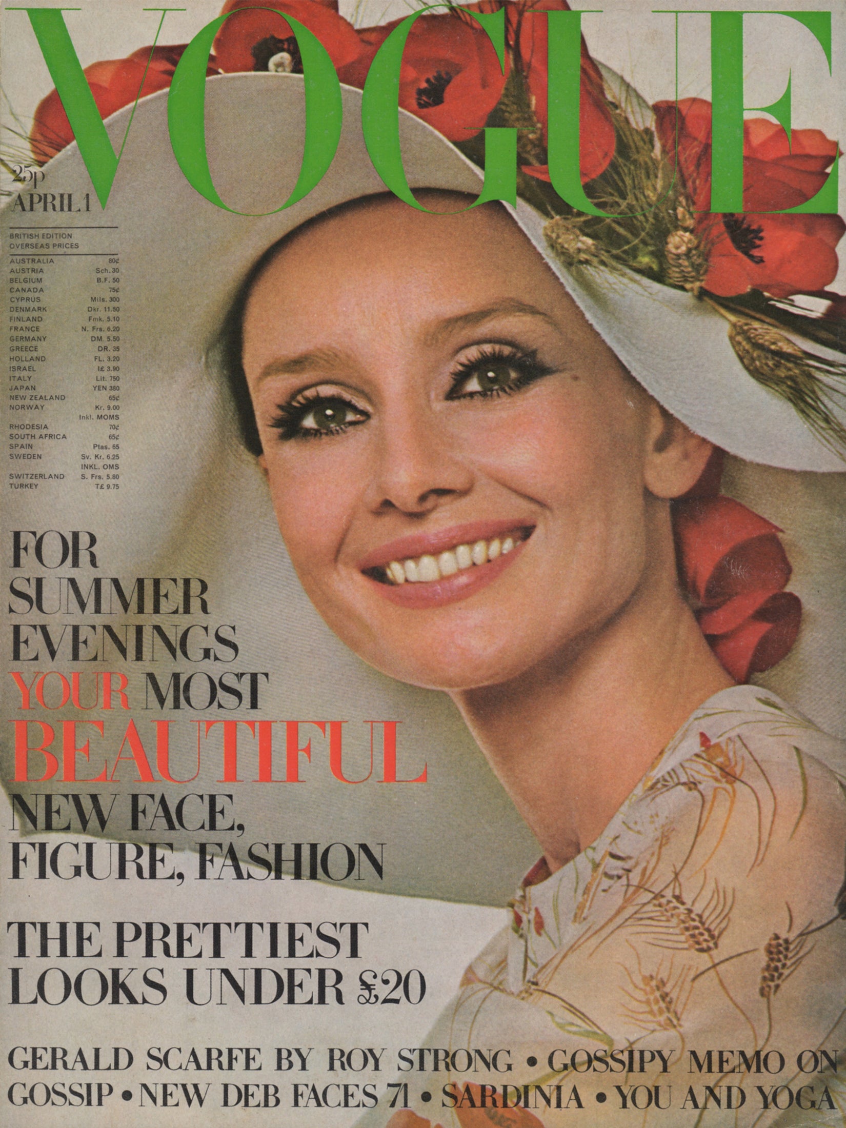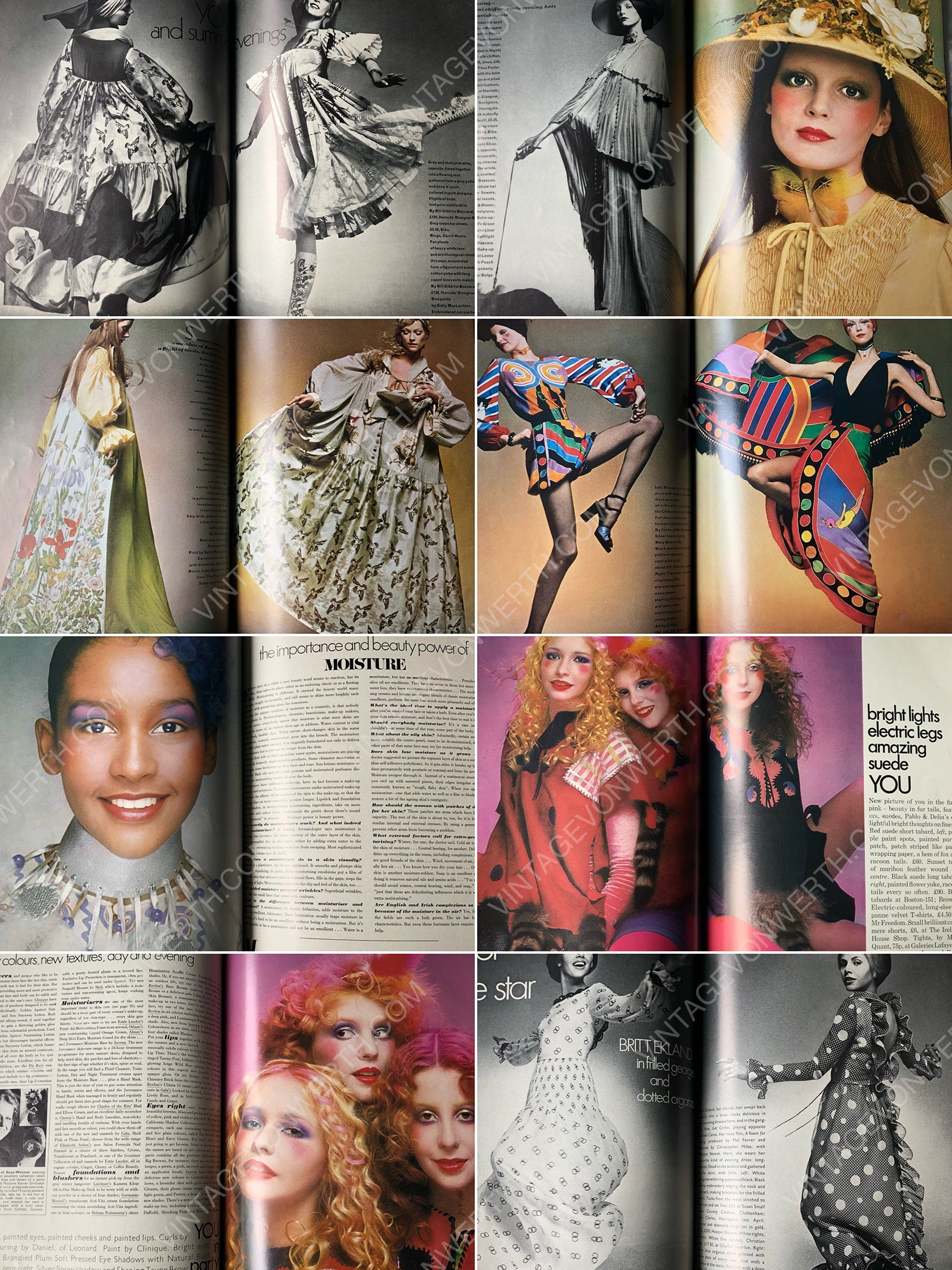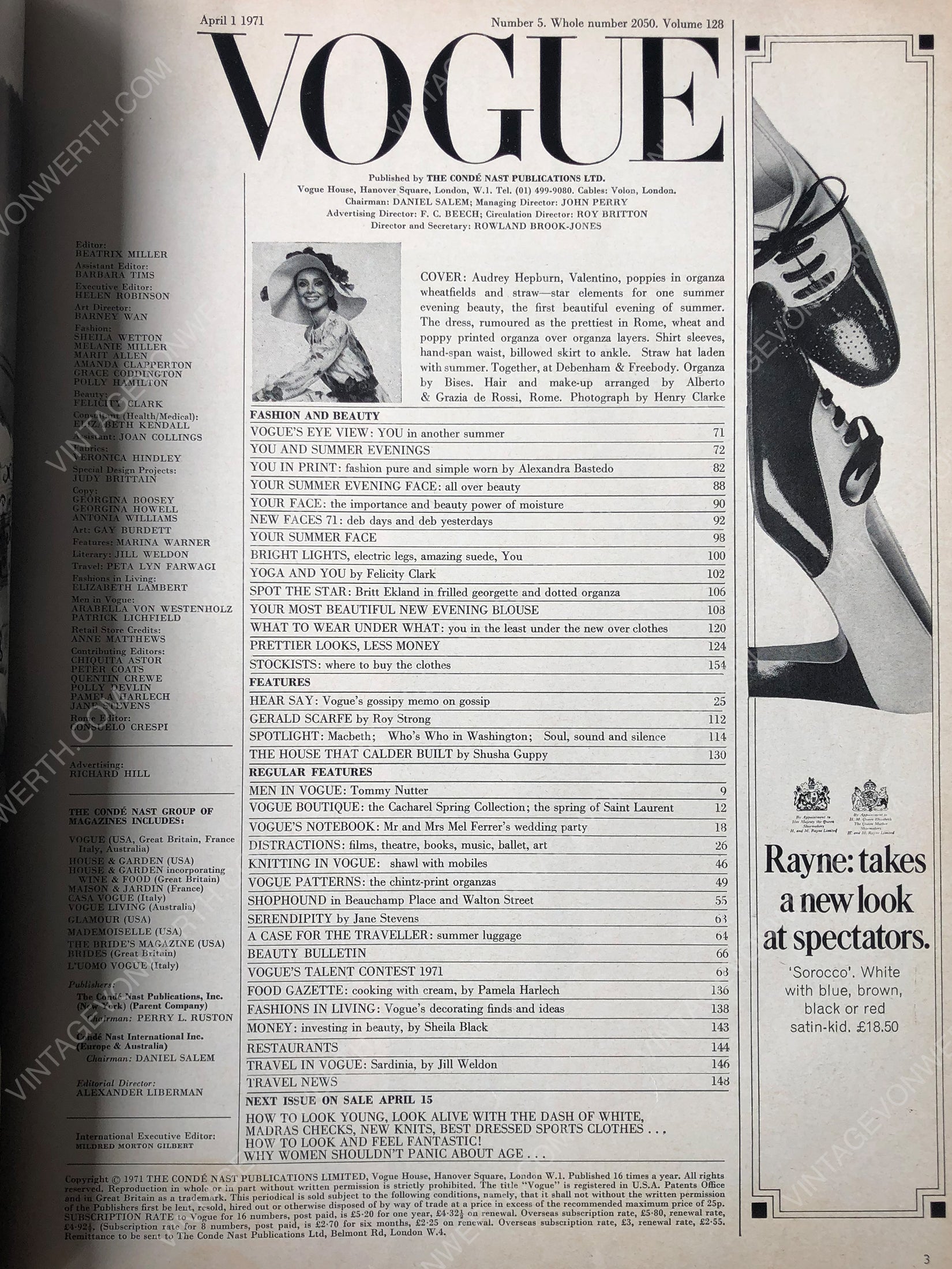 This rare and stunning Vogue UK issue from April 1, 1971 features an iconic Audrey Hepburn cover, amazing ads and iconic fashion photography by acclaimed artists such as Clive Arrowsmith (10 pages), David Bailey (6 pages with Alexandra Bastedo), David Montgomery (5 pages), Snowdon, Barry Lategan (11 pages), Patrick Lichfield (2 pages with Britt Ekland), and more. Among the models are Ann Schaufuss and Maudie James. 6 pages on Alexander Calder with photos by Henri Cartier-Bresson. The photos in this issue are exceptional and perfectly capture the vibe of the early 1970s. A superb edition of British Vogue and a coveted collector's item.