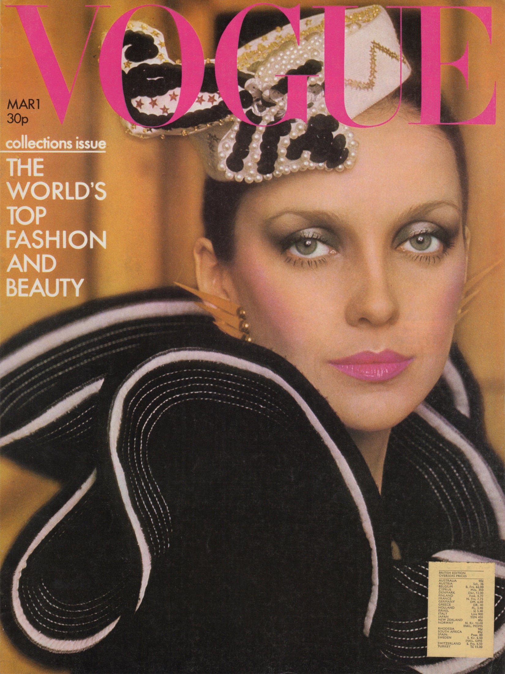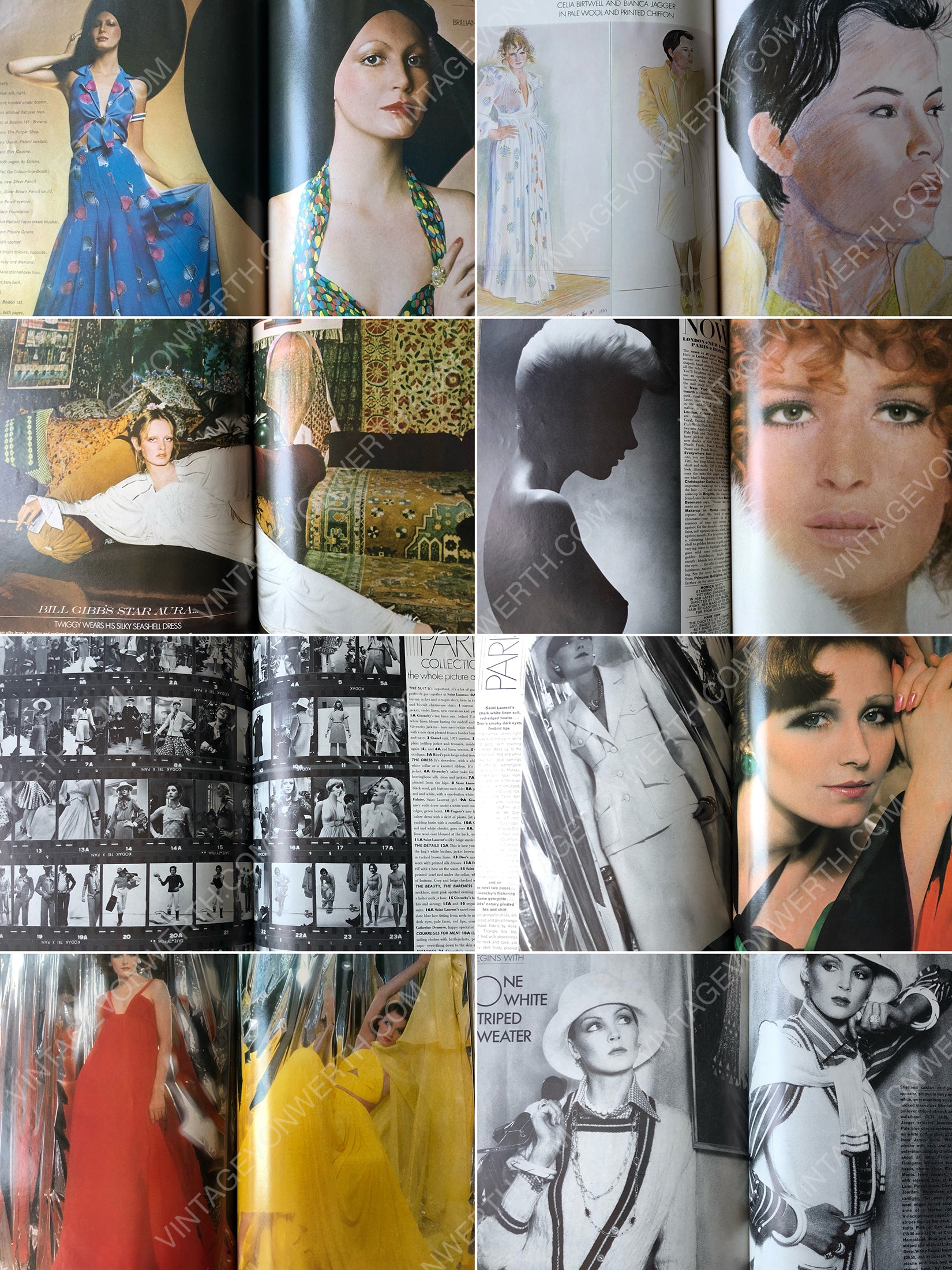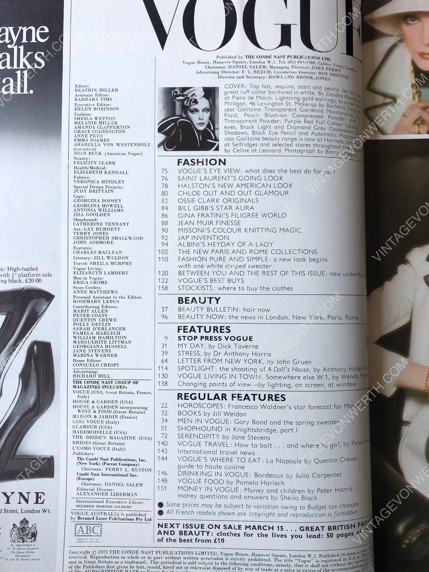 This stunning March 1973 issue of Vogue UK features amazing ads and iconic fashion photography by renowned artists such as Bruce Laurance (2 pages with Halston and Berry Berenson, 2 pages Chloé), Barry Lategan, David Bailey, Uli Rose, Jonvelle, Vittoriano Rastelli, and more. Among the highlights of this magazine are 2 pages with David Hockney's drawings of Celia Birtwell and Bianca Jagger. 2 pages with Twiggy in Bill Gibb. 6 pages Paris fashion report with photos by David Bailey. This vintage issue of British Vogue perfectly captures the spirit of the early 1970s in its pages and is a sought-after collector's item.