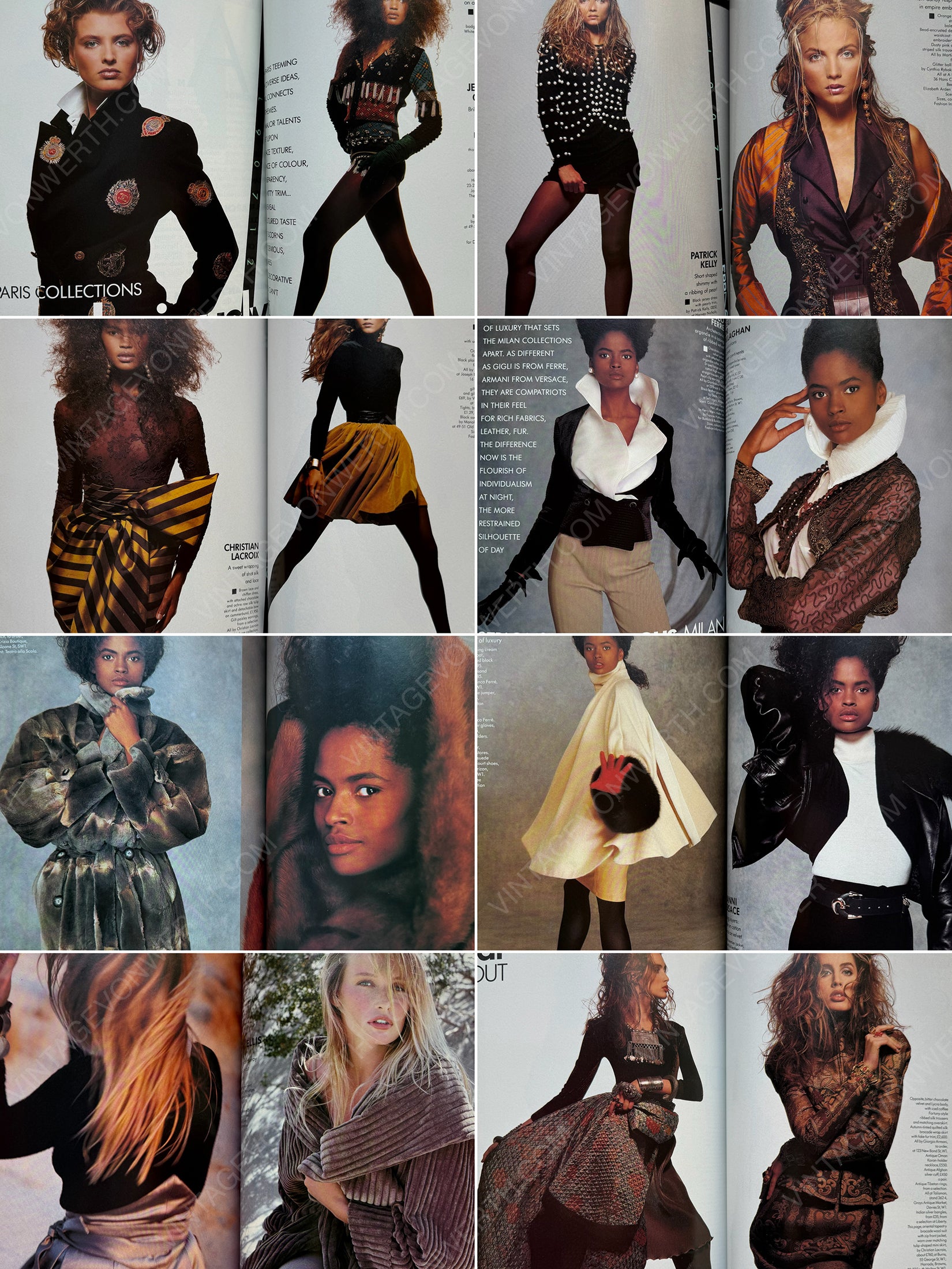 It features a stunning Paulina Porizkova cover and striking campaigns from all major labels, including Gianfranco Ferré, Chanel with Ines de la Fressange, Louis Vuitton, Karl Lagerfeld, Claude Montana, Yohji Yamamoto, Callaghan with Kirsten Owen, Sonia Rykiel, Issey Miyake, John Galliano, Yves Saint Laurent with Naomi Campbell, Christian Dior, Escada, Emanuel Ungaro, and Norma Kamali, among many others.