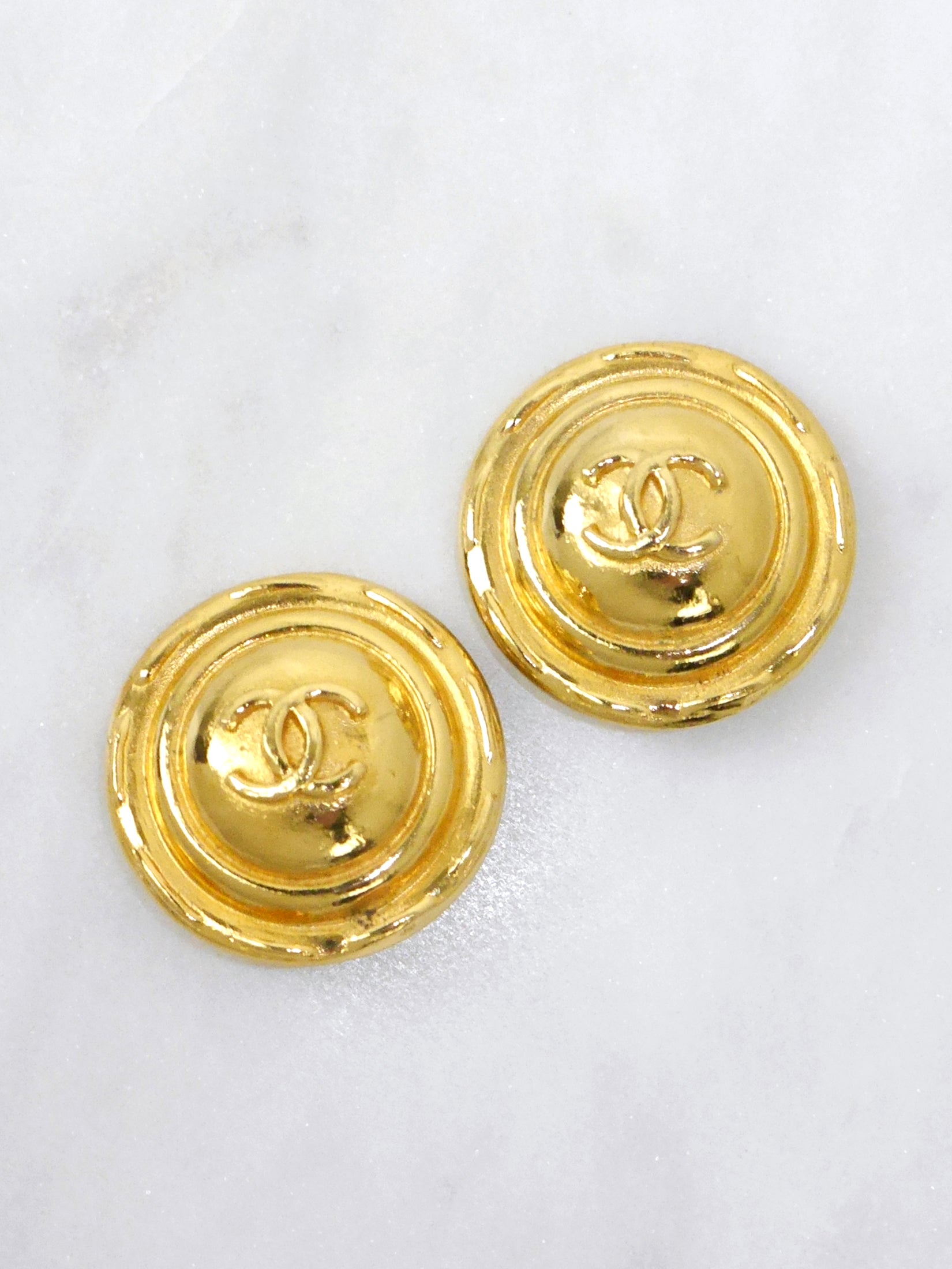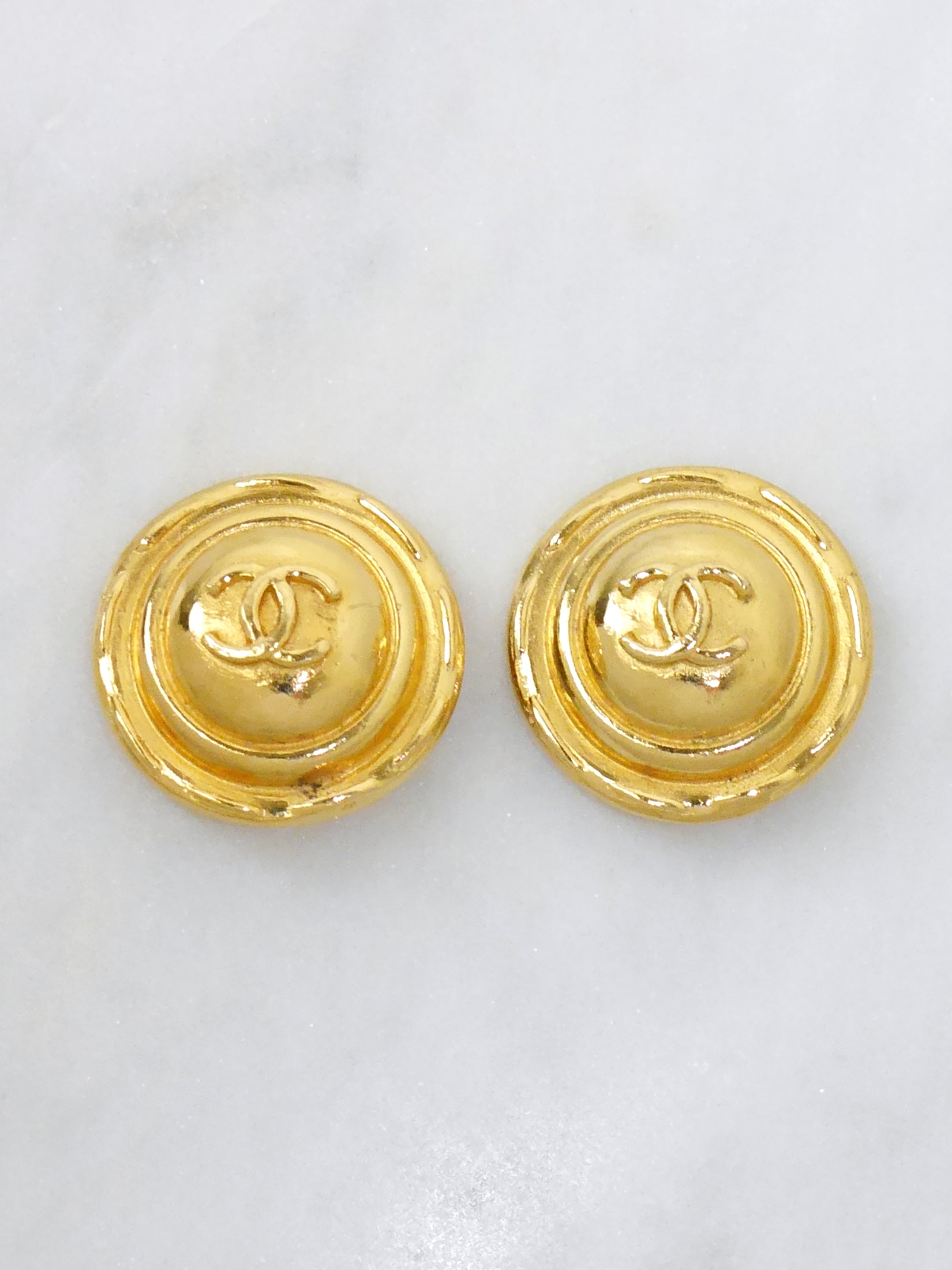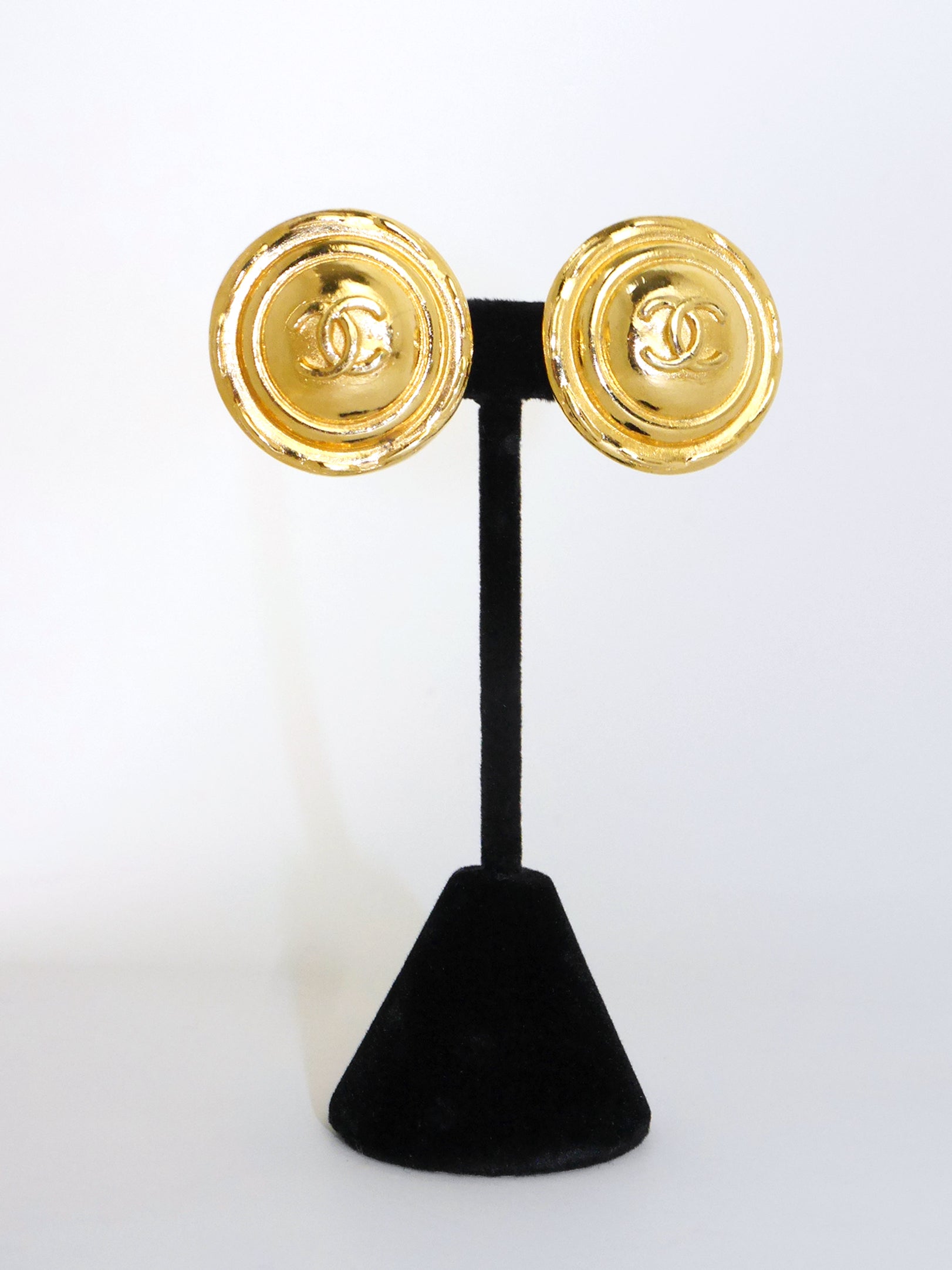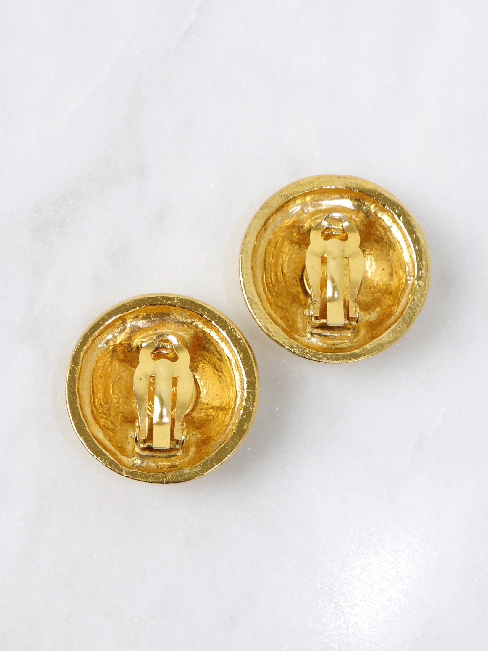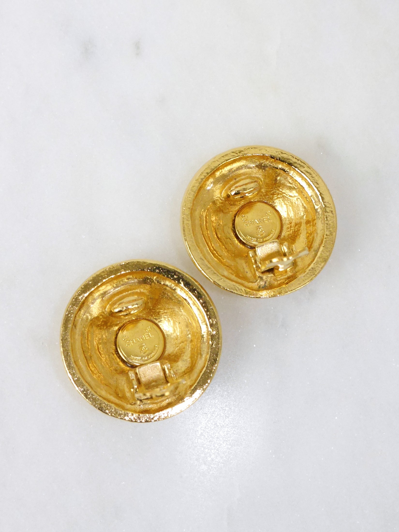 These exquisite vintage Chanel clip-on earrings from the 1980s are a timeless classic. Crafted from gold-tone metal, they feature an elegant round design with a large CC logo. The earrings close with clips and are signed on the reverse. Made in France.