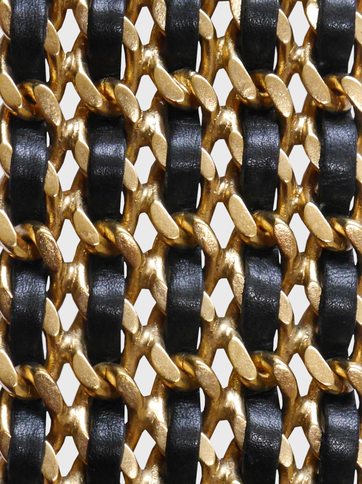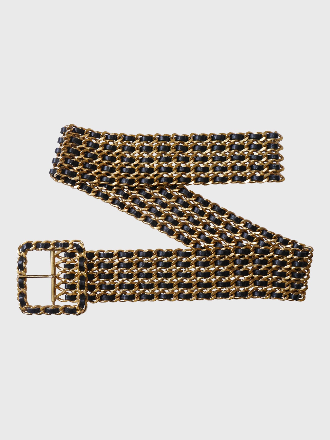 This Chanel statement belt from Spring 1993, modeled by Kate Moss on the runway, is made of five strands of the classic gold-colored metal chains fused together, intertwined with black leather, and a rectangular metal and leather buckle signed on the back. The belt has a considerable weight (869 g) and is infinitely adjustable. The buckle closure is reinforced with an additional hook closure.
