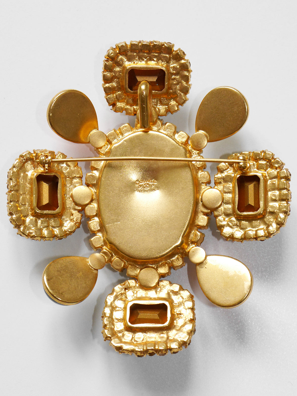 This iconic, large Chanel brooch from Spring 1995 is made of gold-tone metal and studded with colorful cast glass, cast stones and sparkling rhinestone elements. The brooch can also be worn as a pendant and is signed on the back. Made in France.