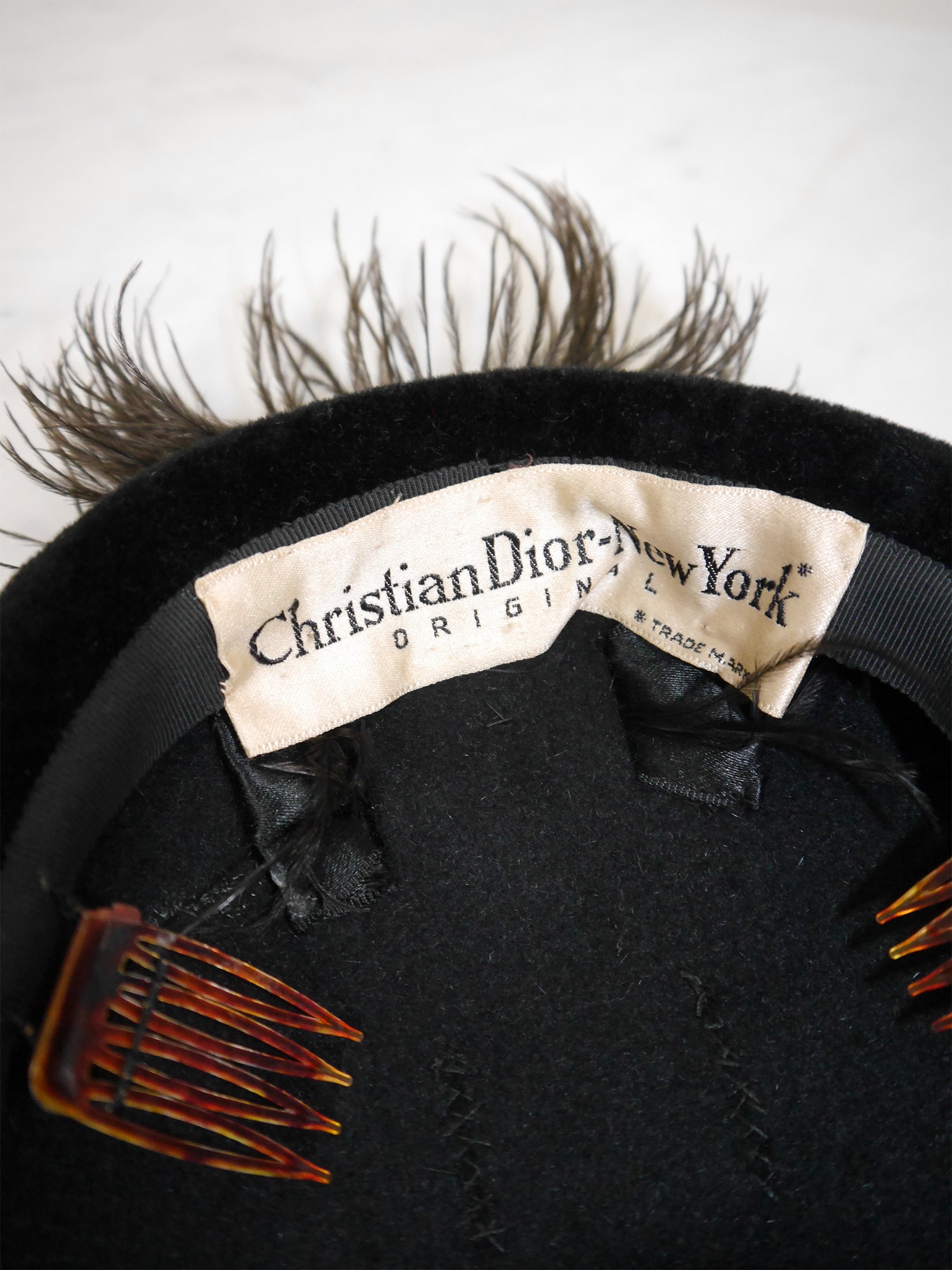 CHRISTIAN DIOR 1940s 1950s Vintage Dark Brown Velvet Hat w/ Ostrich Feather