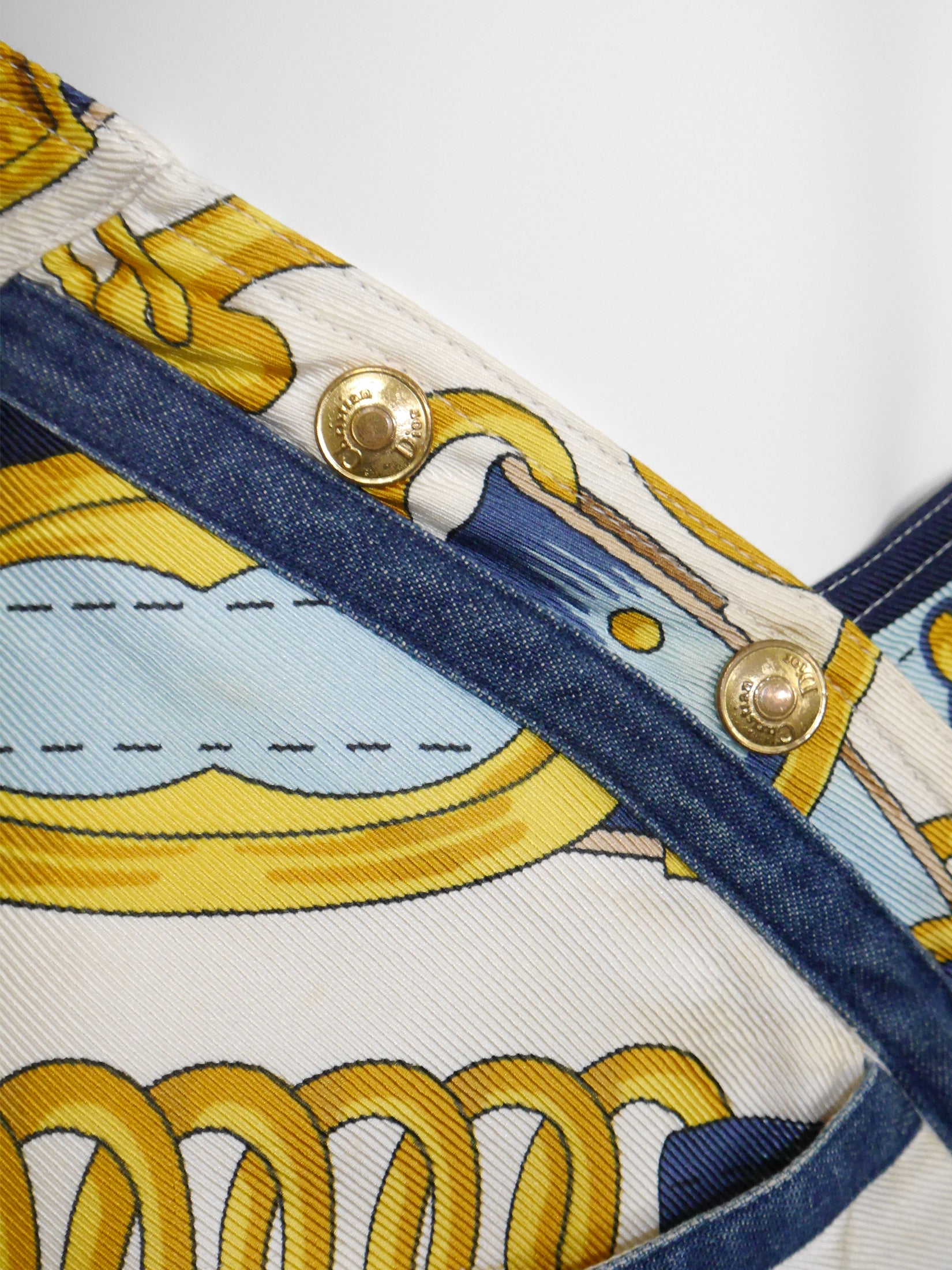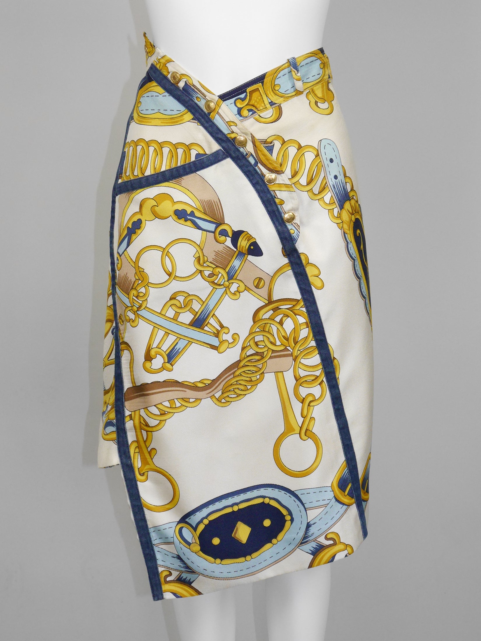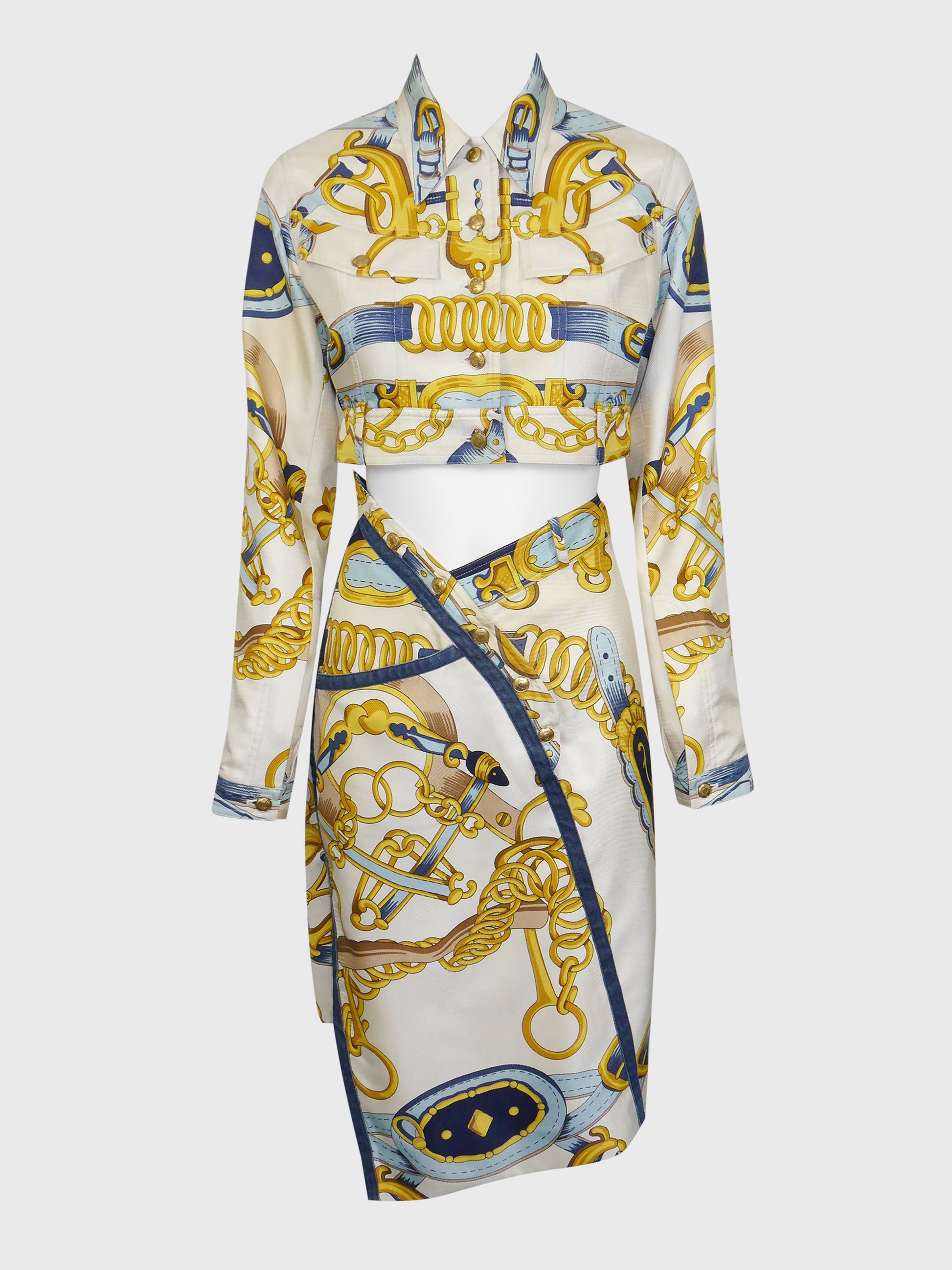 This incredible vintage skirt suit from Christian Dior by John Galliano from Spring 2000 is made from a beautiful cream silk twill with an equestrian print in golden yellow, brown and shades of blue. The suit consists of a fitted cropped jacket with buttoned breast pockets, long sleeves with buttoned cuffs and a front button closure, and the matching skirt that features a crazy asymmetrical design with a large front pocket and buttons to close. All buttons (13 on the jacket, 6 on the skirt) are gold-tone metal signature buttons. 100% silk, fully lined with fine silk. Made in France.