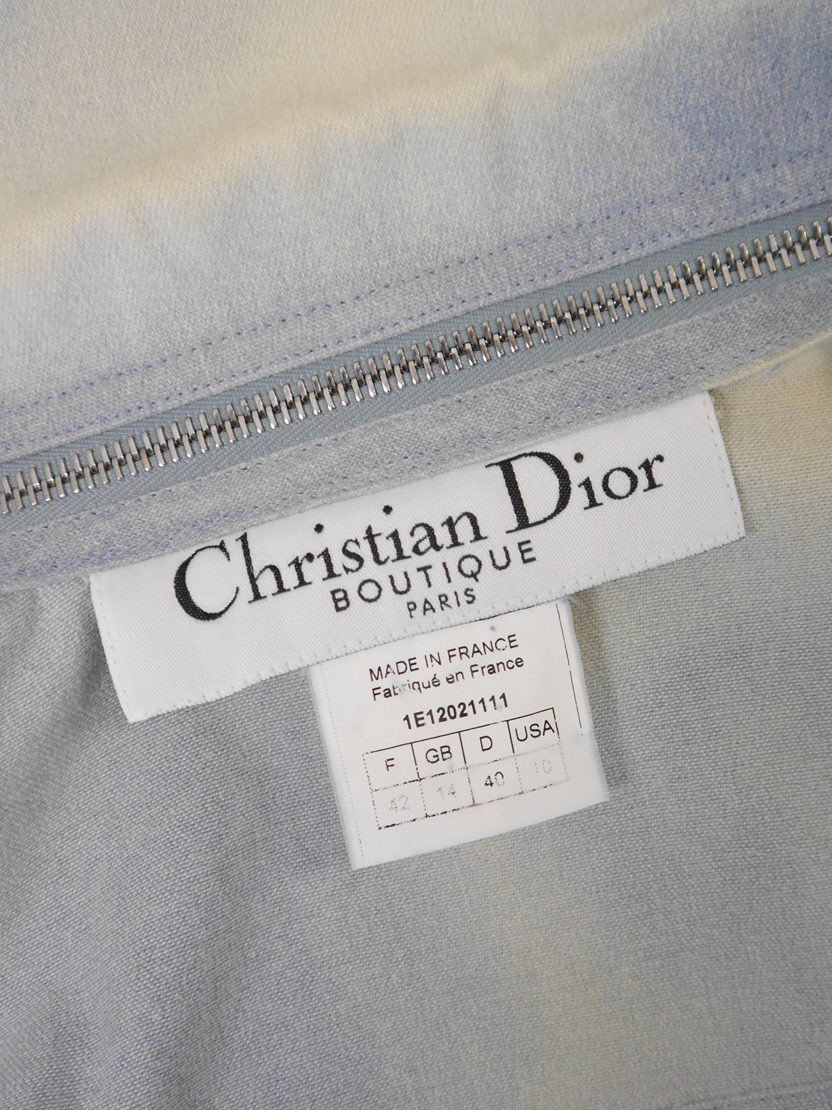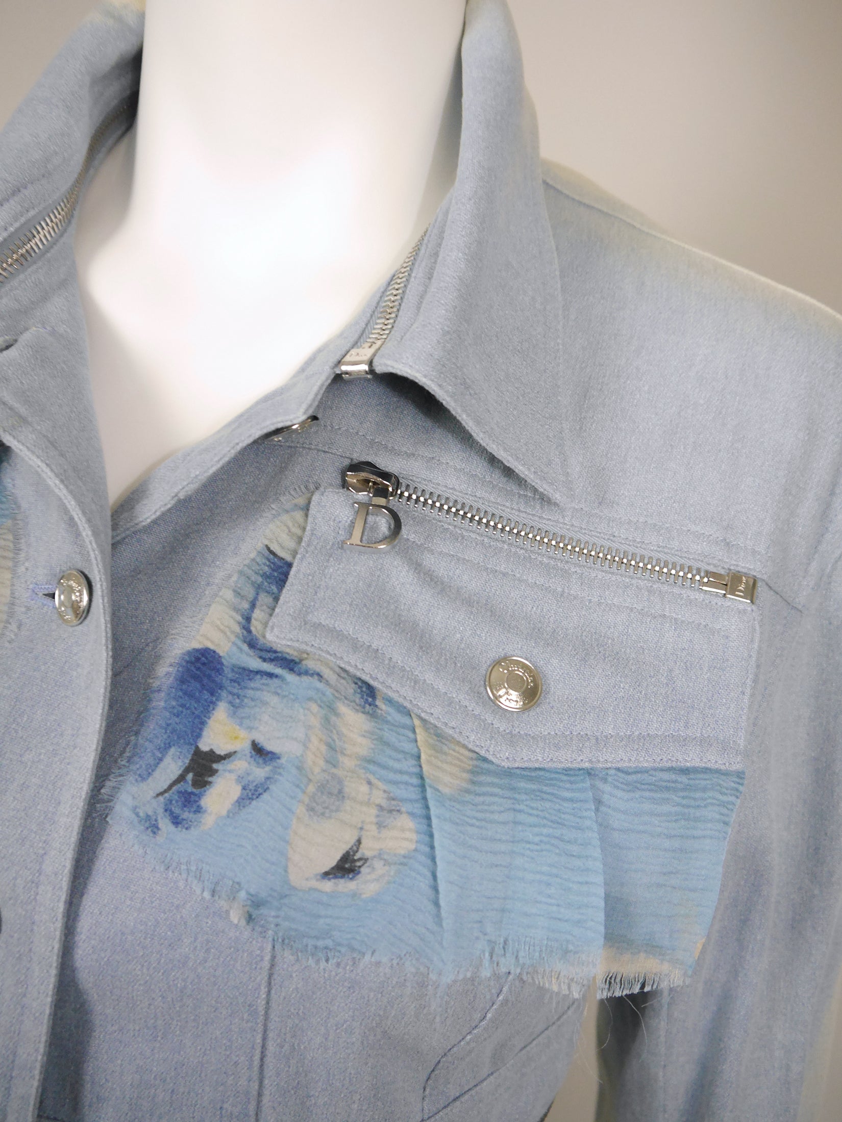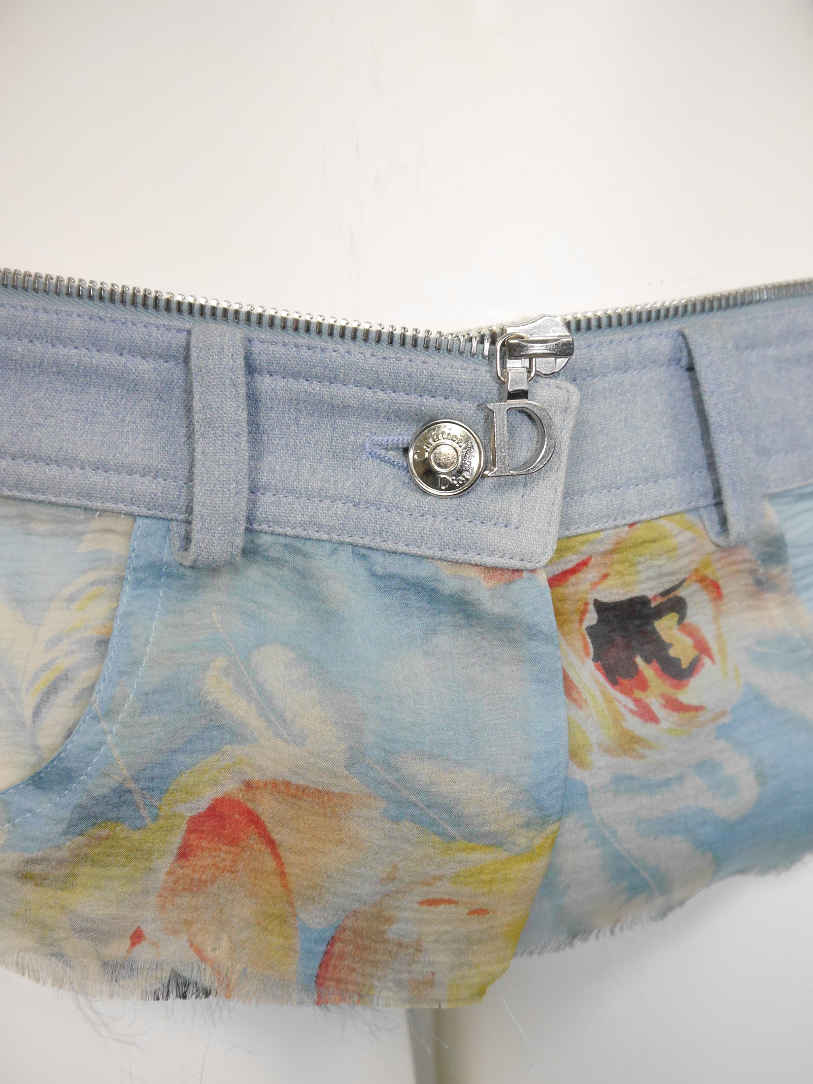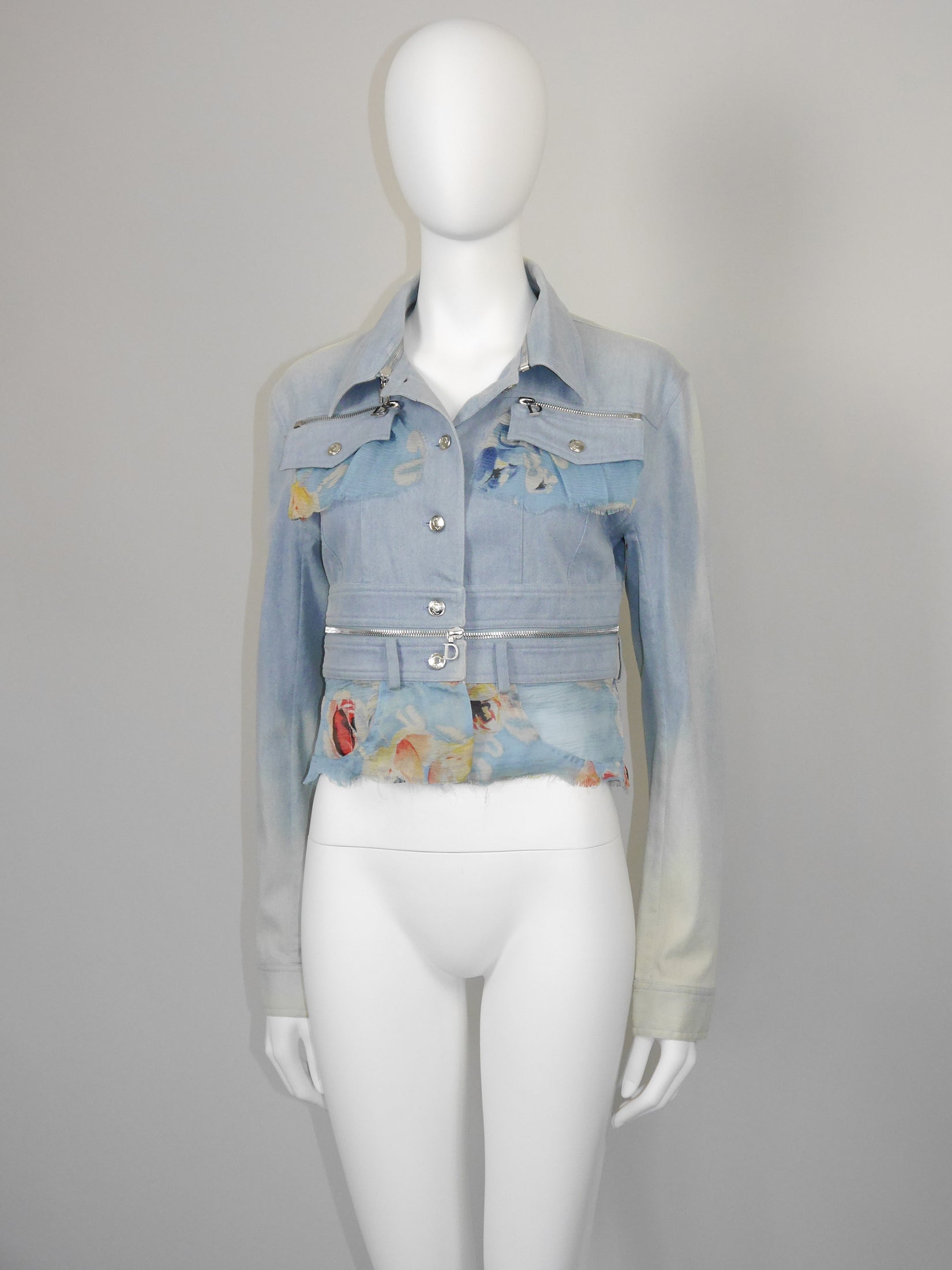 This rare vintage Christian Dior jacket hails from John Galliano's iconic Spring 2001 collection for the French fashion house. A key element of that collection were the eye-catching zippers, which can also be found in this amazing design. The jacket is made of lightweight acid wash denim and floral silk chiffon trims with raw edges. It has a fitted cut with buttoned breast pockets, long sleeves and a front button closure. The highlight of this design is the detachable collar and, more than anything, the detachable bottom of the jacket that can be worn separately and mimics the waist of a pair of jeans - complete with belt loops and hinted pockets! As always, all silver-tone metal hardware features the Dior logo. The large zippers with "D" logo are especially charming. 100% cotton and 100% silk, unlined. Made in France.