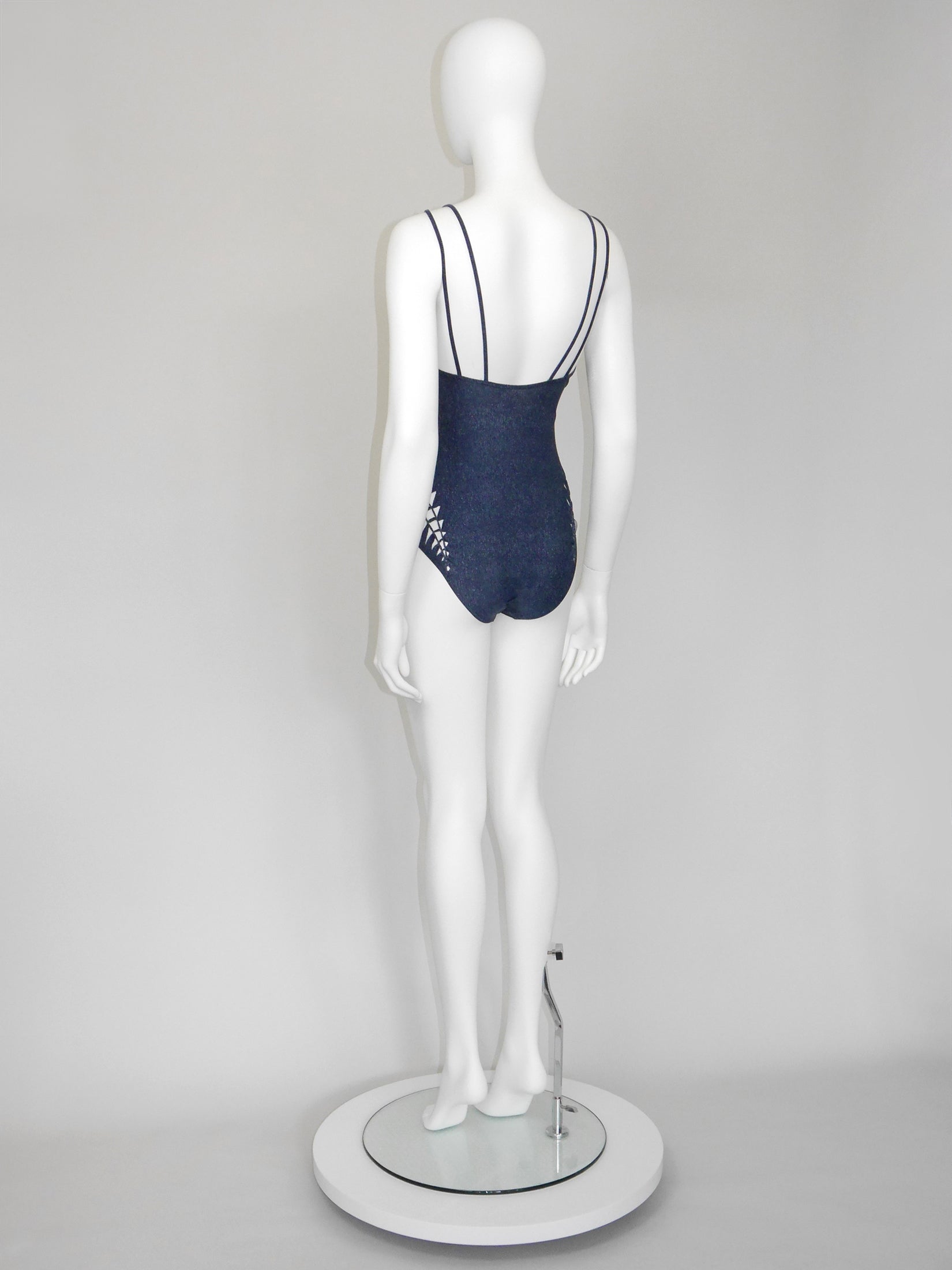 This ultra rare vintage Christian Dior by John Galliano swimsuit is a runway design from the super sexy and groundbreaking Spring 2001 collection. It features a denim blue design with double straps and countless intricate and very sexy cutouts down the front and at the sides. 72% polyamide, 28% elastane. Made in France. Please visit Vogue Runway for photos of this breathtaking design on the catwalk (looks 26 & 27).