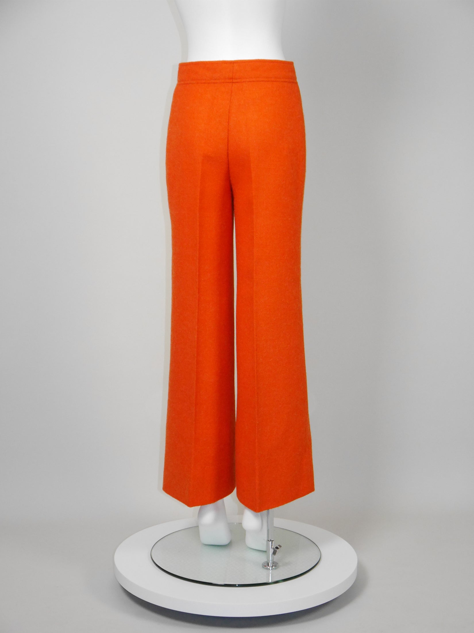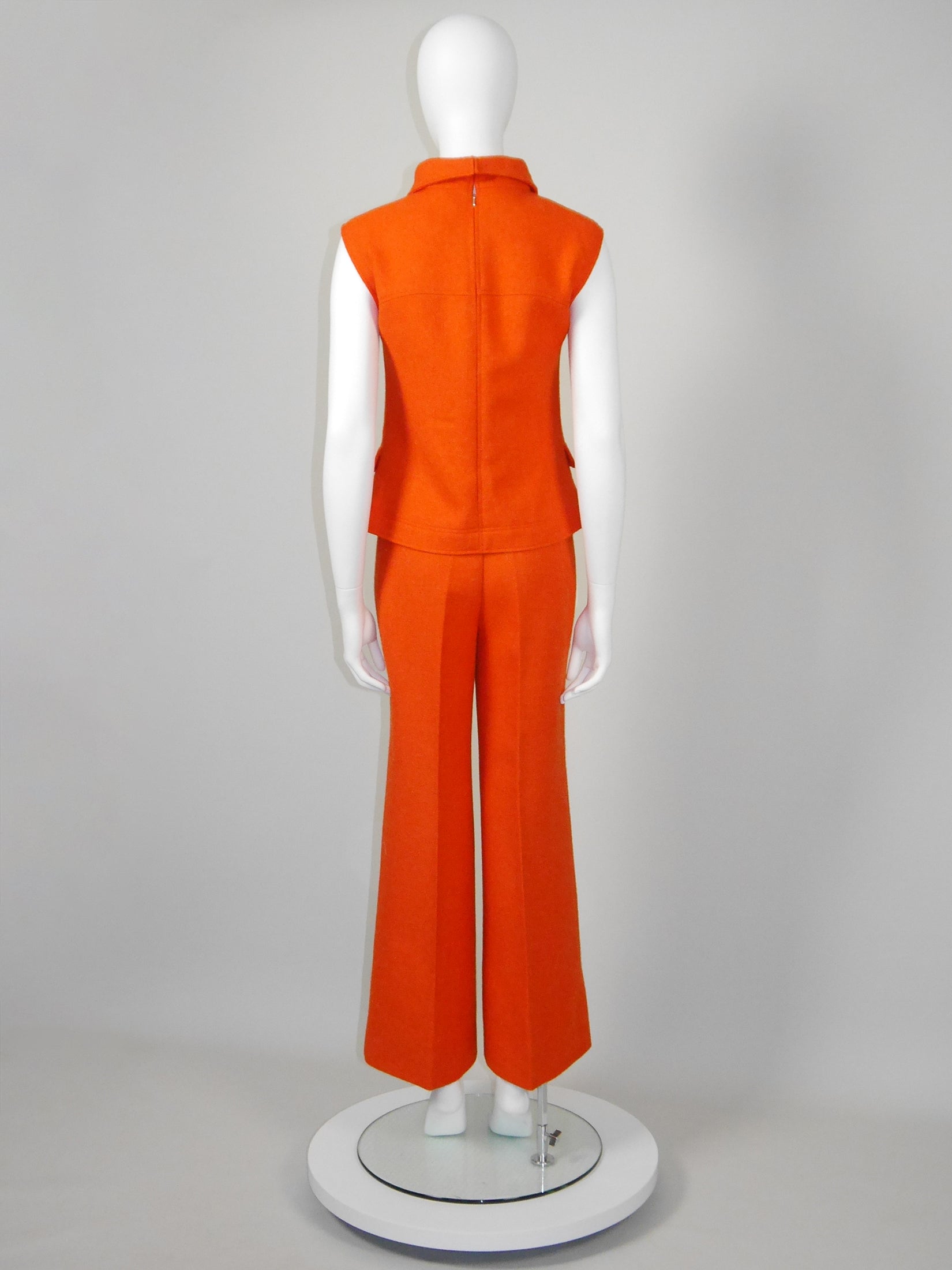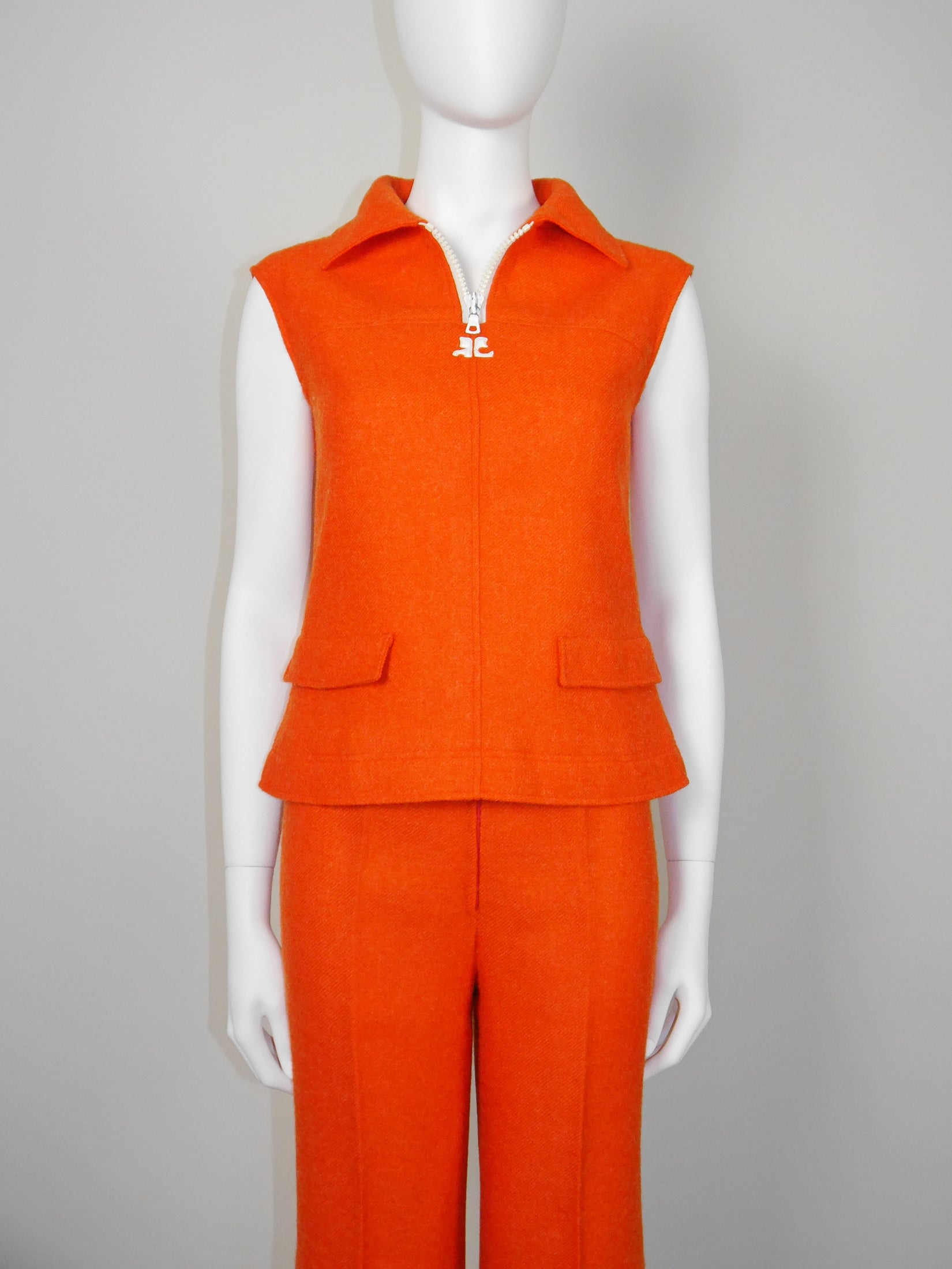 This iconic and instantly recognizable vintage Courrèges suit from the late 1960s or early 1970s is made from a warm wool fabric in a deep orange - a shade so characteristic of the designer's work. The set comprises a top with a bold white front zipper, a white Courrèges logo and decorative flaps, and flared pants with ironed pleats. The top fastens at the back with a zipper and two metal hooks and eyes, the pants with a zipper and a lacquered press stud at the front. Both pieces are fully lined in silky white lining. Materials: 100% wool, 100% polyamide, 100% saran. Made in France.