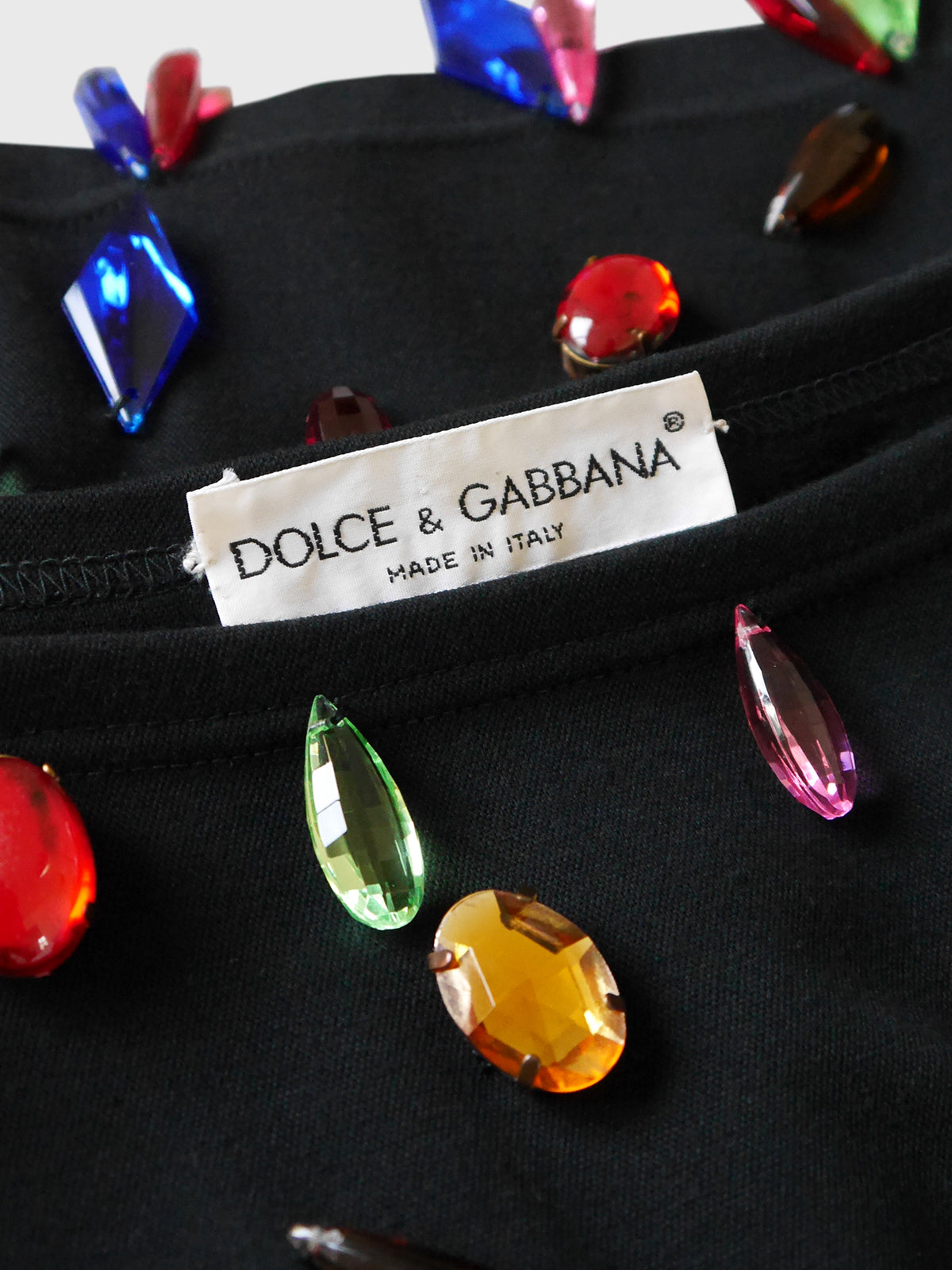 This rare and iconic vintage Dolce & Gabbana long-sleeved top from around Fall 1991 is sure to make a big impression with its heavy embellishments of about 200 dangling crystals or gemstones in various shapes and bold jewel tones. It is made of a thick and soft first grade cotton blend jersey in deep black and has a short fitted cut with a wide boat neckline and long fitted sleeves. Considerable weight. 90% cotton, 7% lycra, 3% nylon. Made in Italy.
