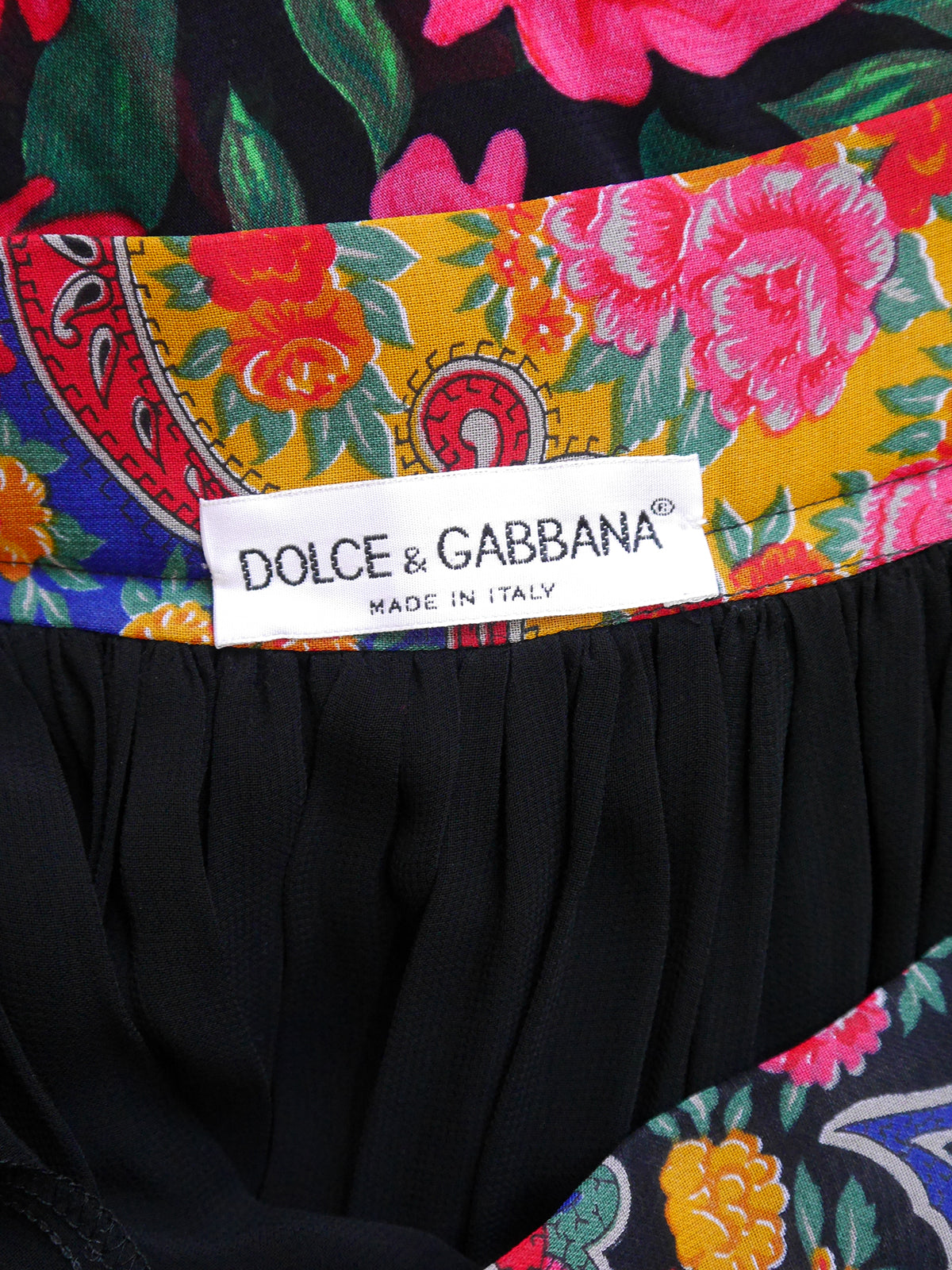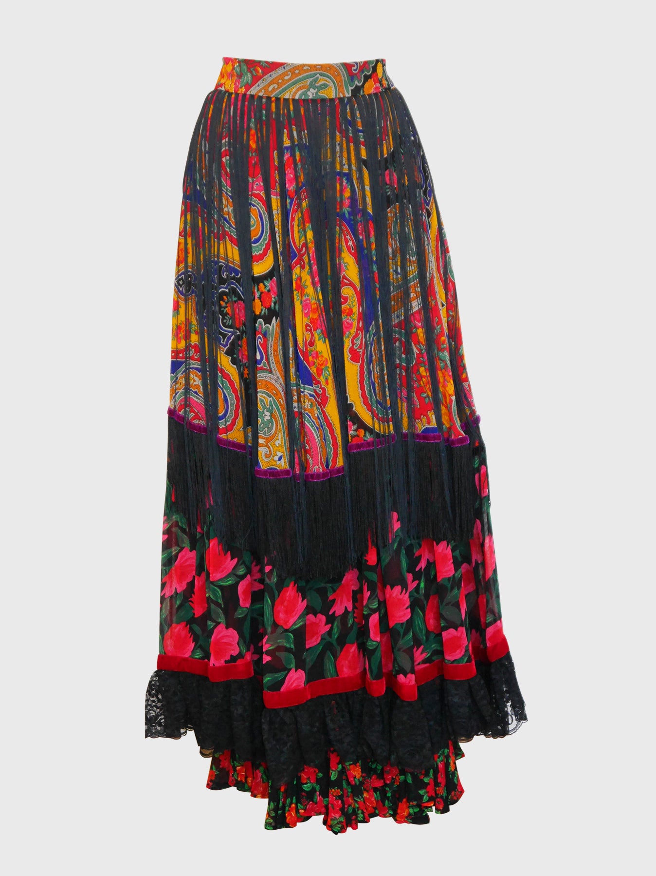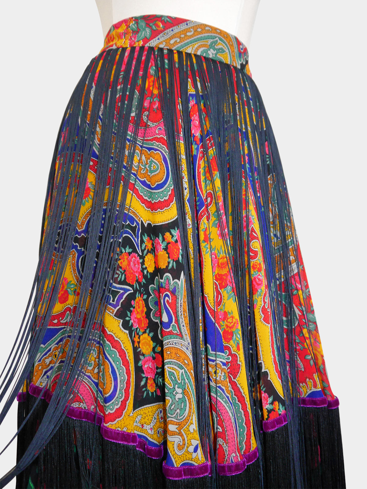 This incredible vintage maxi skirt by Dolce & Gabbana from the iconic hippie-inspired Fall 1993 collection is made of three layers of very full, densely gathered fabric with colorful floral and paisley patterns, velvet trim, a black lace ruffle and long silk fringes. Each layer is literally many yards of fabric - the skirt is perfect for dancing and twirling as it moves beautifully with each step. This abundance of fabric gives the skirt considerable weight and is pure luxury. The skirt closes with a zipper and a button on the side. 100% rayon. Made in Italy.
