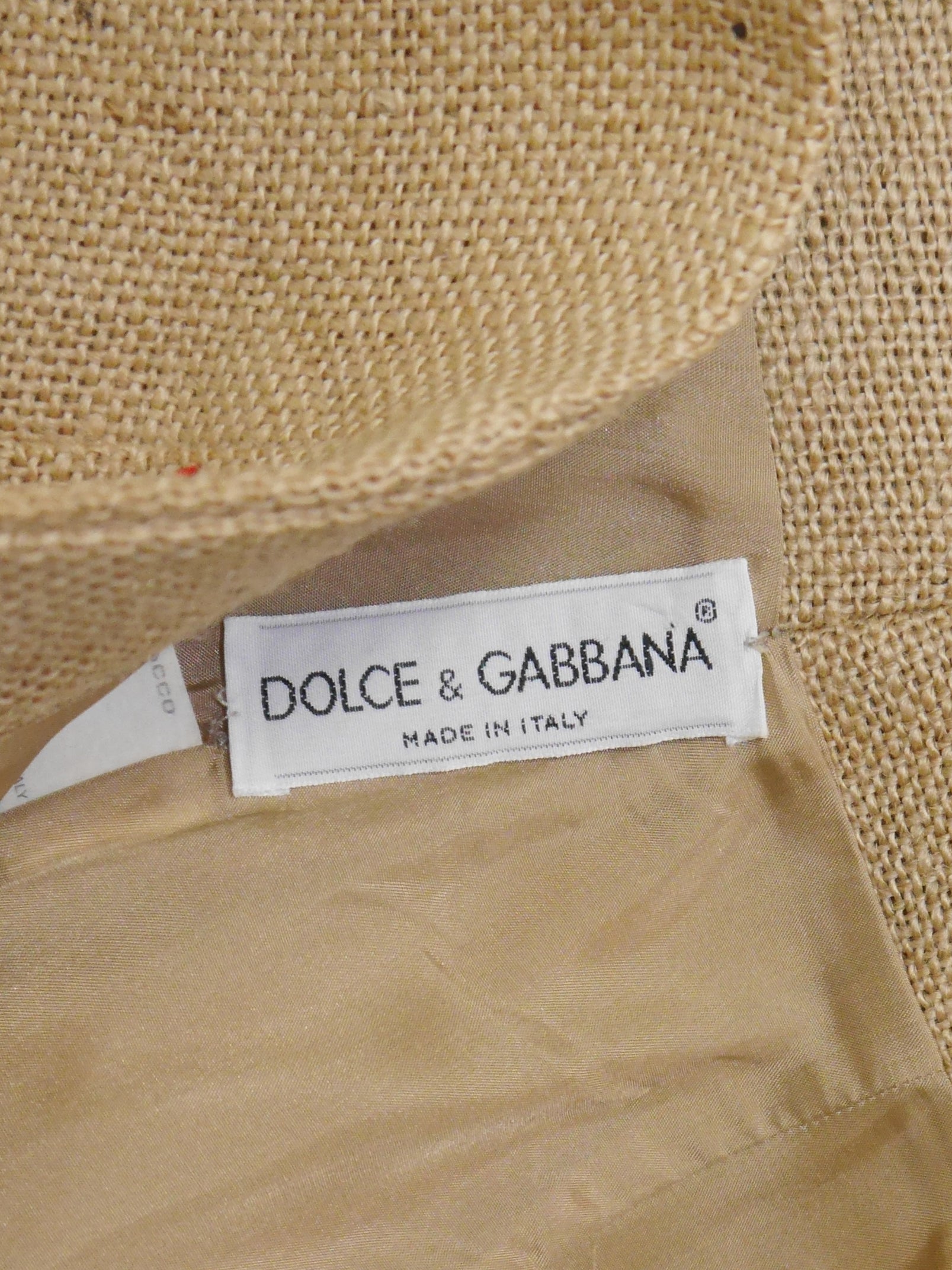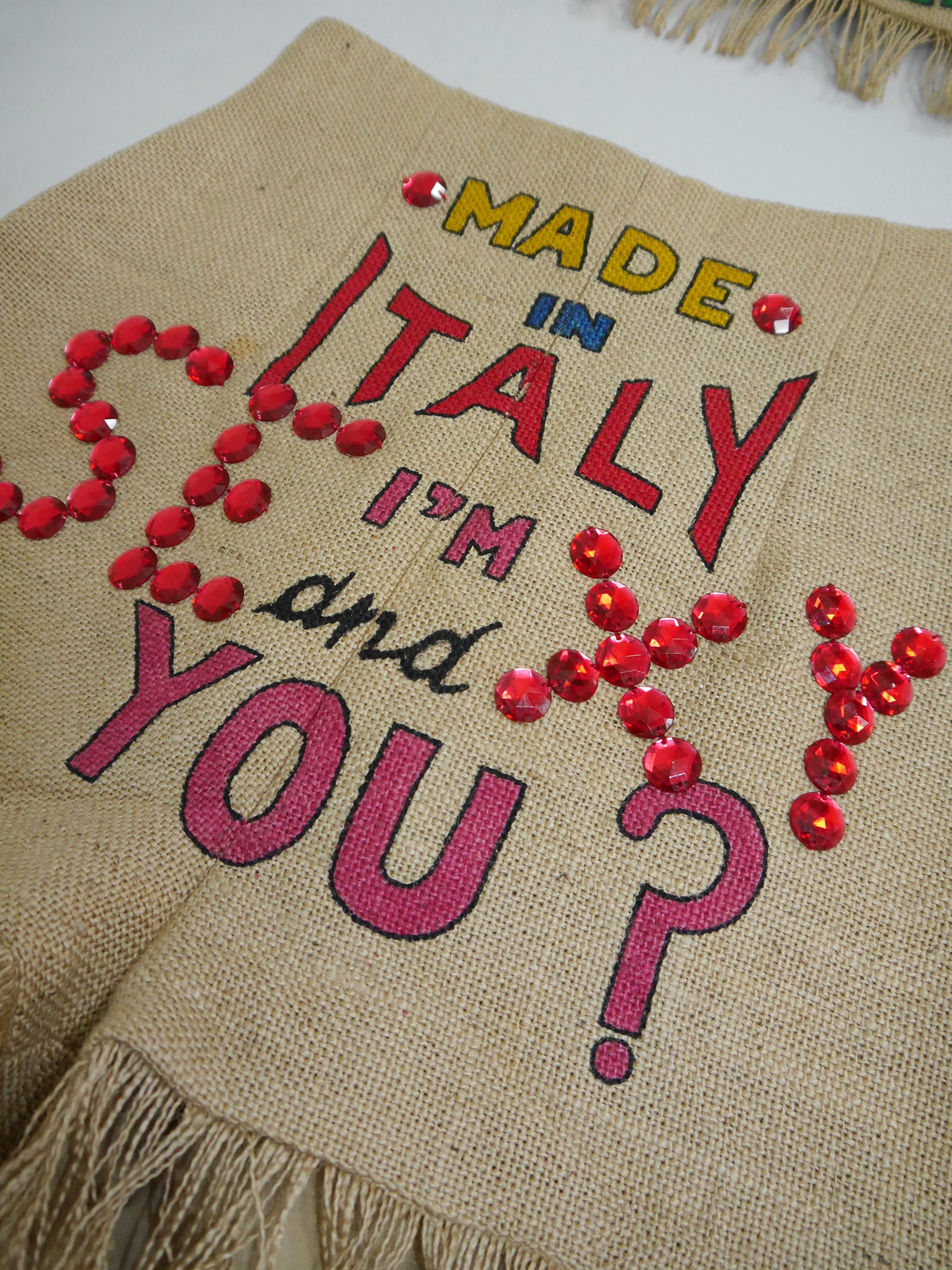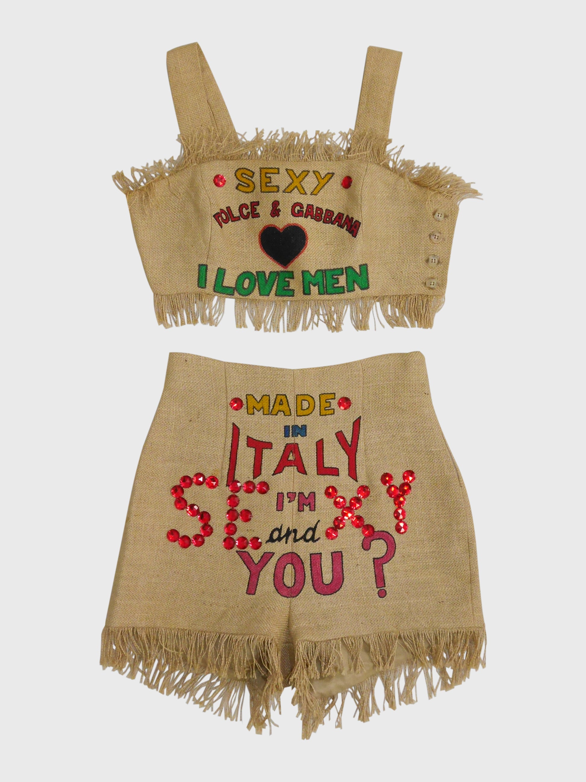 This iconic vintage Dolce & Gabbana Spring 1992 jute ensemble consists of a bustier top and matching hot pants, both painted with colorful sexy slogans and embellished with large red rhinestones. The top closes with a row of buttons on the side, and the pants close with a zipper on the side. Both pieces are made of 100% jute and fully lined. Made in Italy.