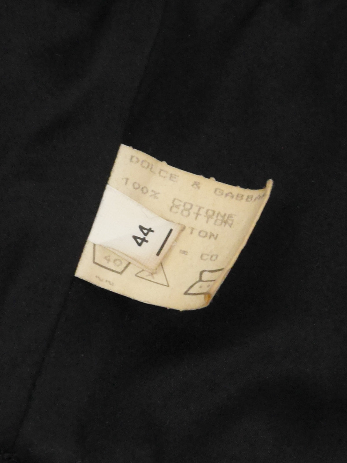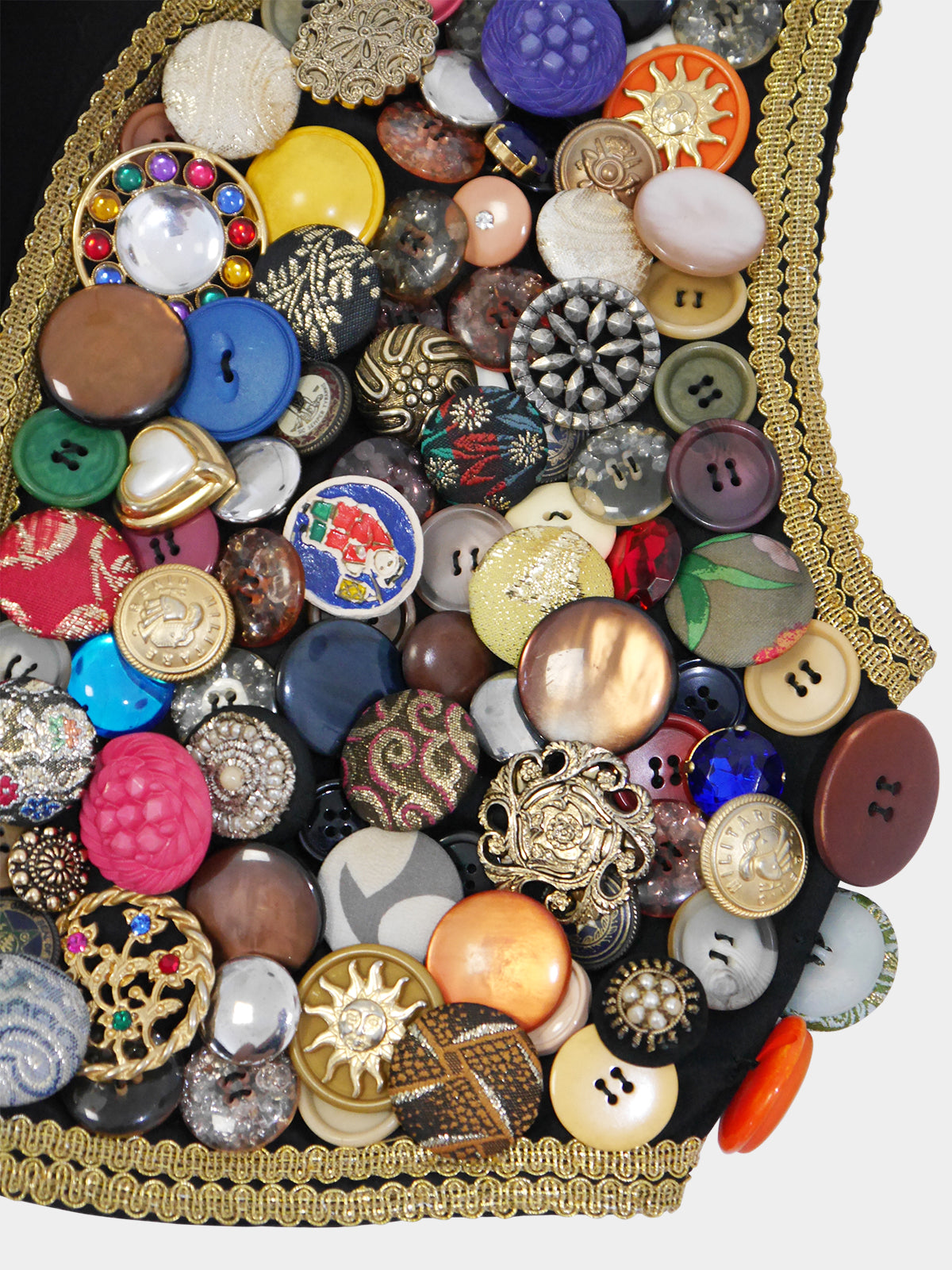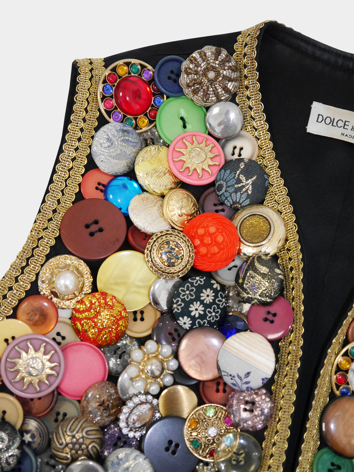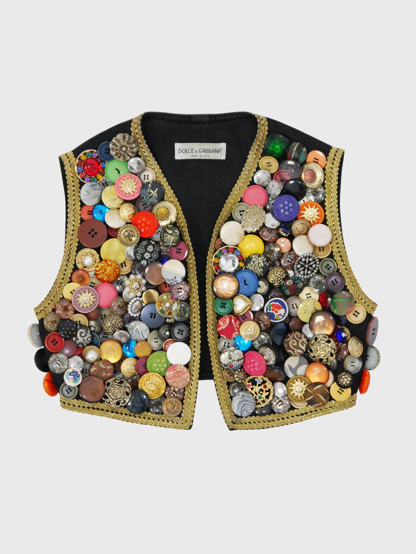 This rare and iconic vintage vest by Dolce & Gabbana from the hippie-inspired spring 1993 collection is a truly insane piece with high recognition value. It is made of black cotton decorated with about 200 handmade buttons in many beautiful shapes, colors and sizes. The fabric is tightly woven and sturdy enough to support the heavy weight of the embellishments. Gold brocade trim on the edges completes the eclectic aesthetic of this piece. Solid black back. The vest is designed to be worn open and has no closure. 100% cotton. Made in Italy.