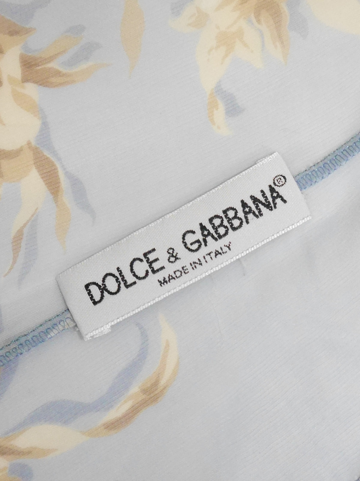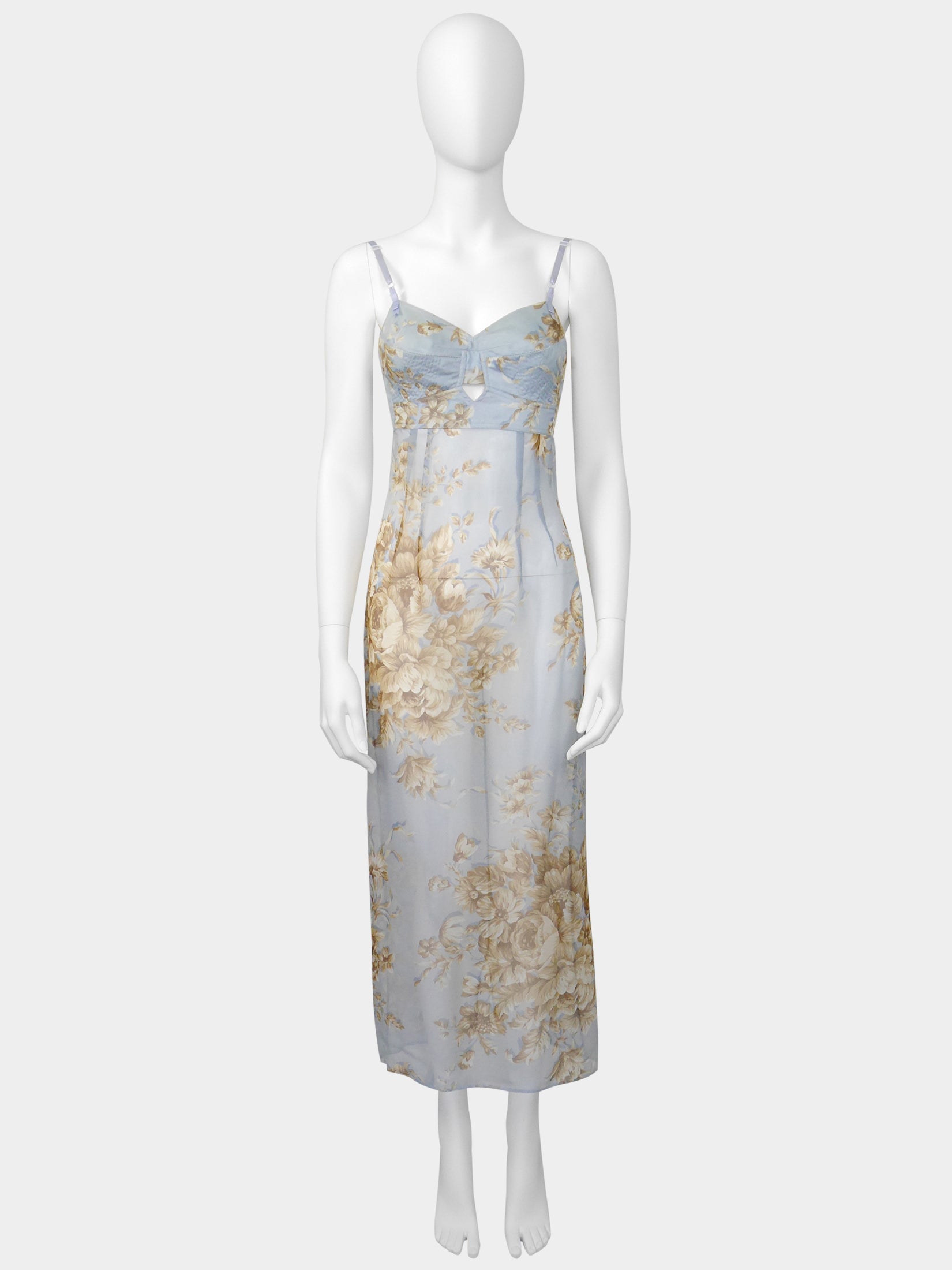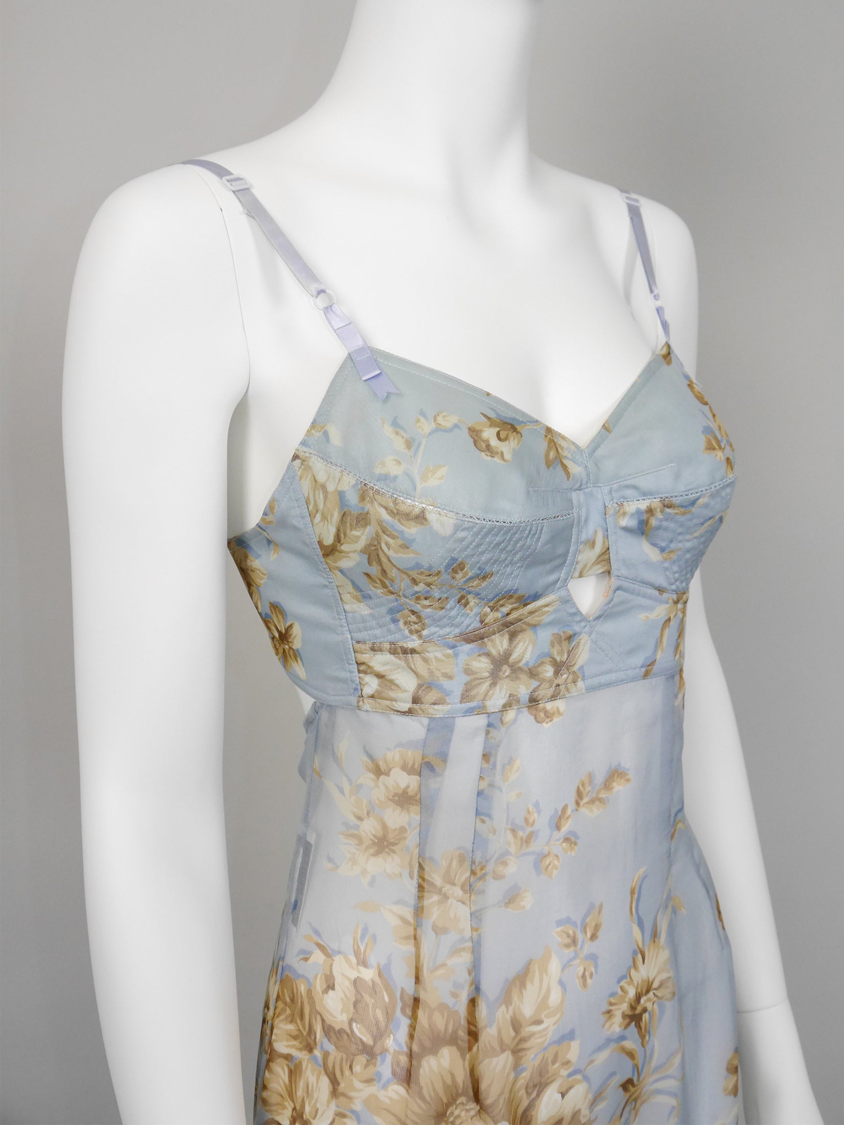 This amazing vintage Dolce & Gabbana lingerie dress from their Spring 1997 collection is crafted from the finest silk chiffon with a mesmerizing floral print in shades of beige and brown against a pastel blue background. The dress features a bustier bodice with adjustable straps and an adjustable hook and eye closure at the back and a sheer and feathery lightweight ankle-length skirt with a back zipper. No material tag, upper 100% silk. Made in Italy.