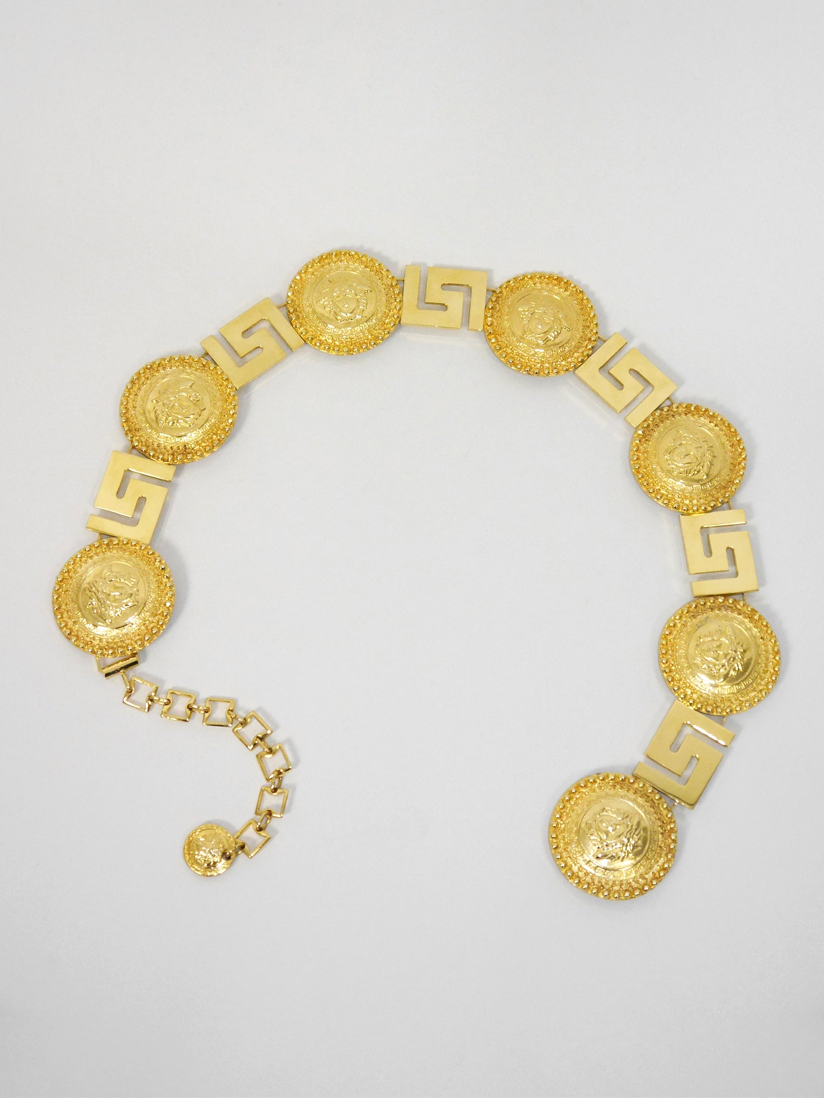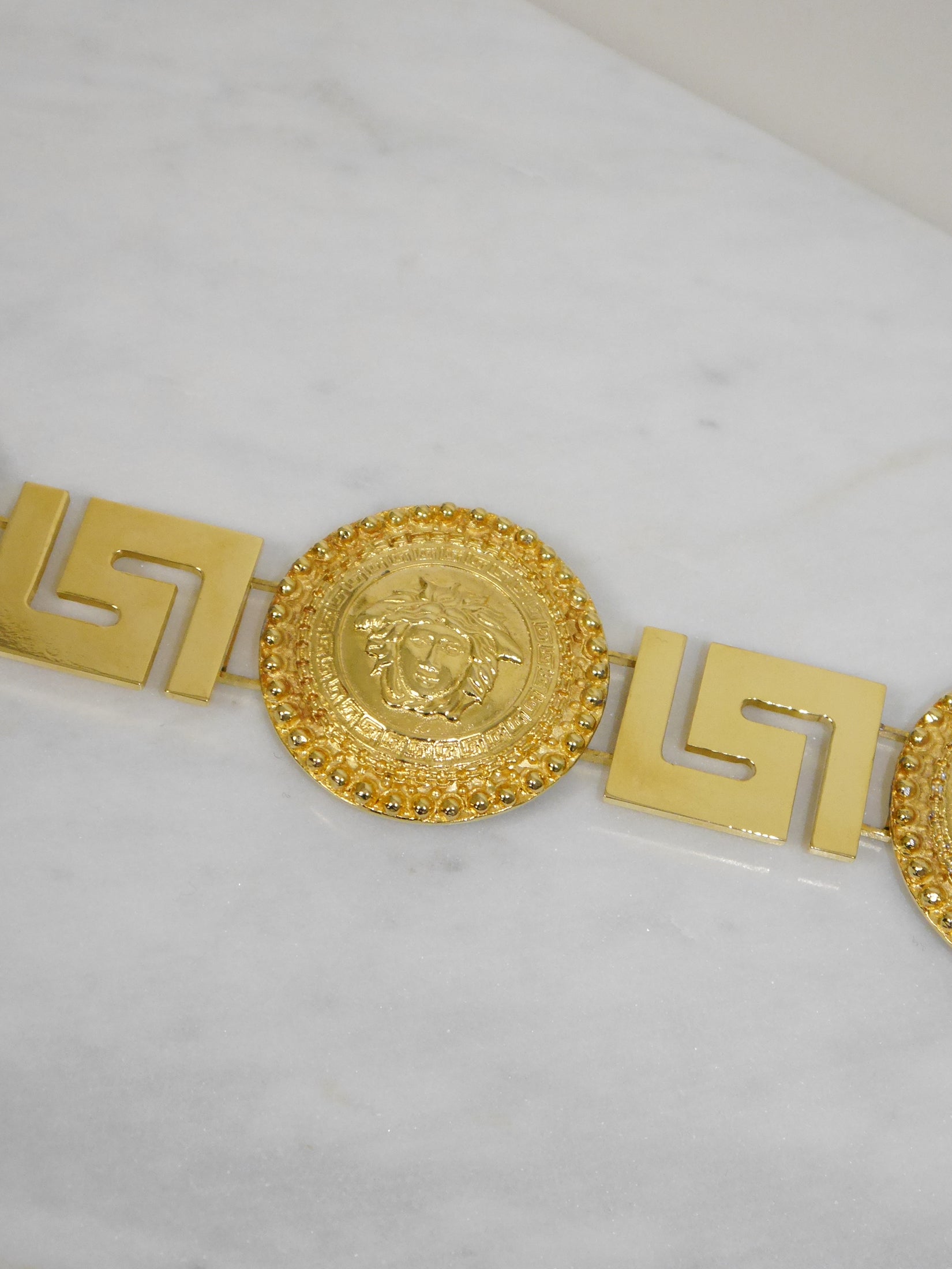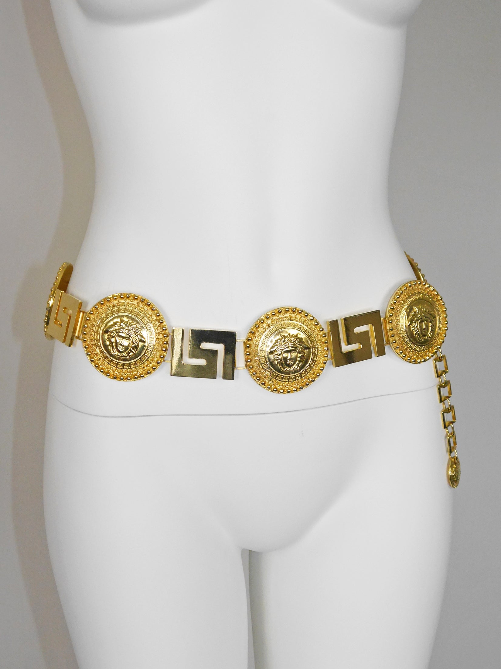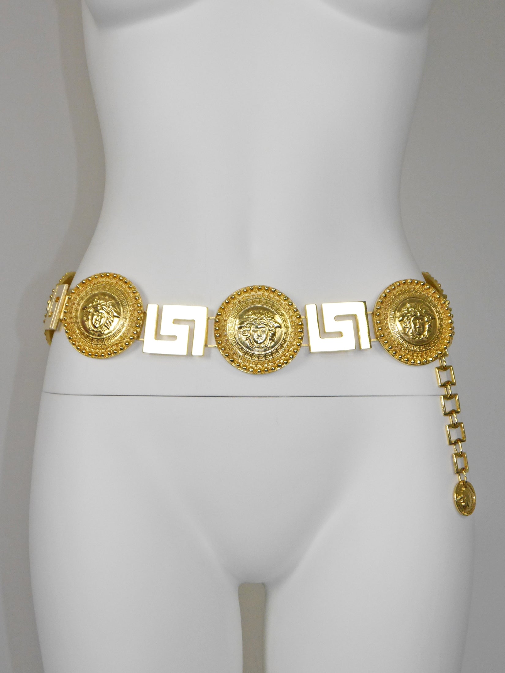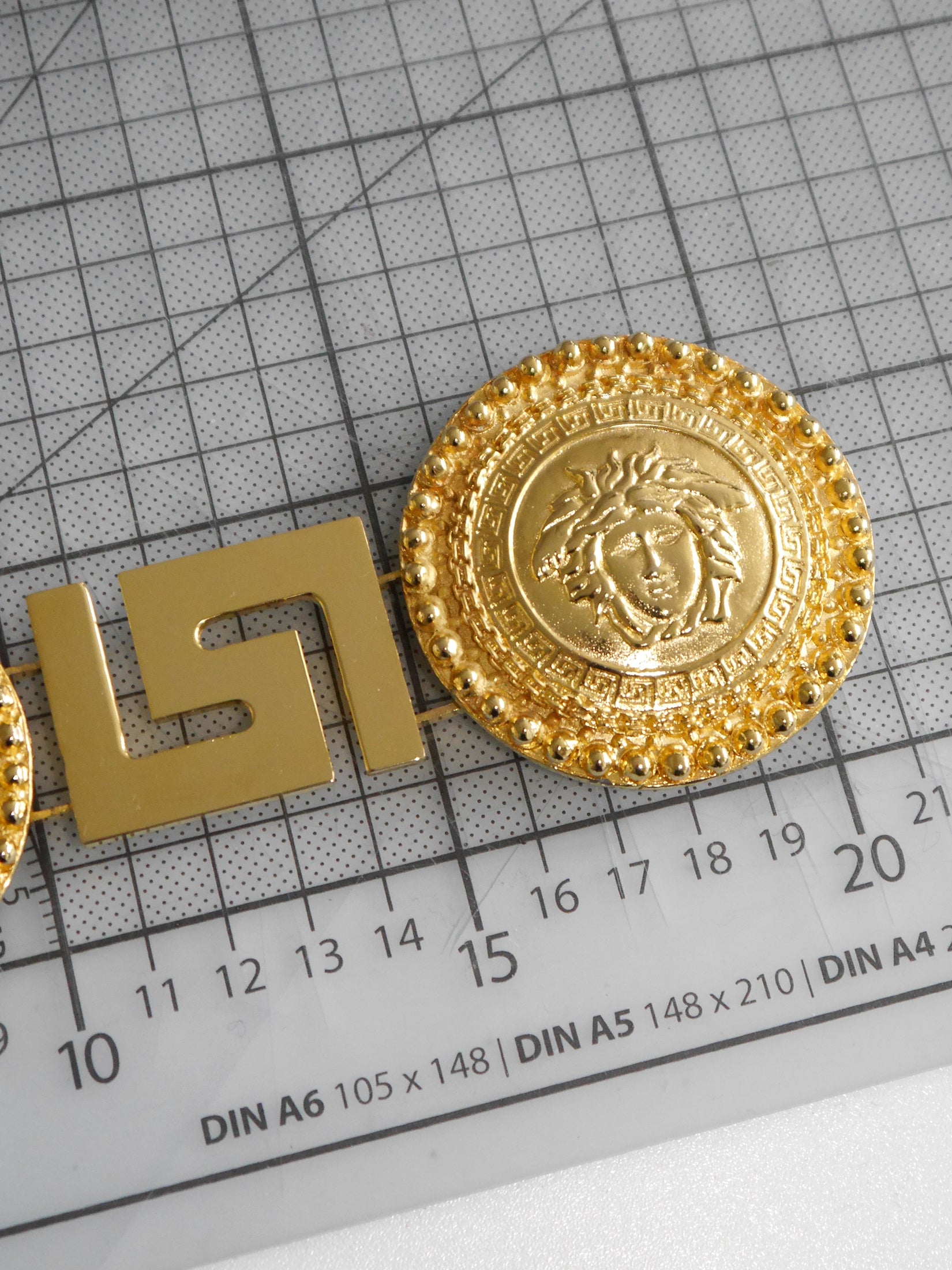This incredible vintage Gianni Versace belt from Spring 1993 is such a significant and iconic piece. Crafted from gold-tone metal, it features an instantly recognizable medusa head design with meander links and is literally oversized - each medusa head disc measures over 6,0 cm/2.36" in diameter! The belt is adjustable in length and is fastened with a hook and a chain with a small medusa head pendant. Substantial weight of 605,0 g. Signed Gianni Versace on reverse. Made in Italy.