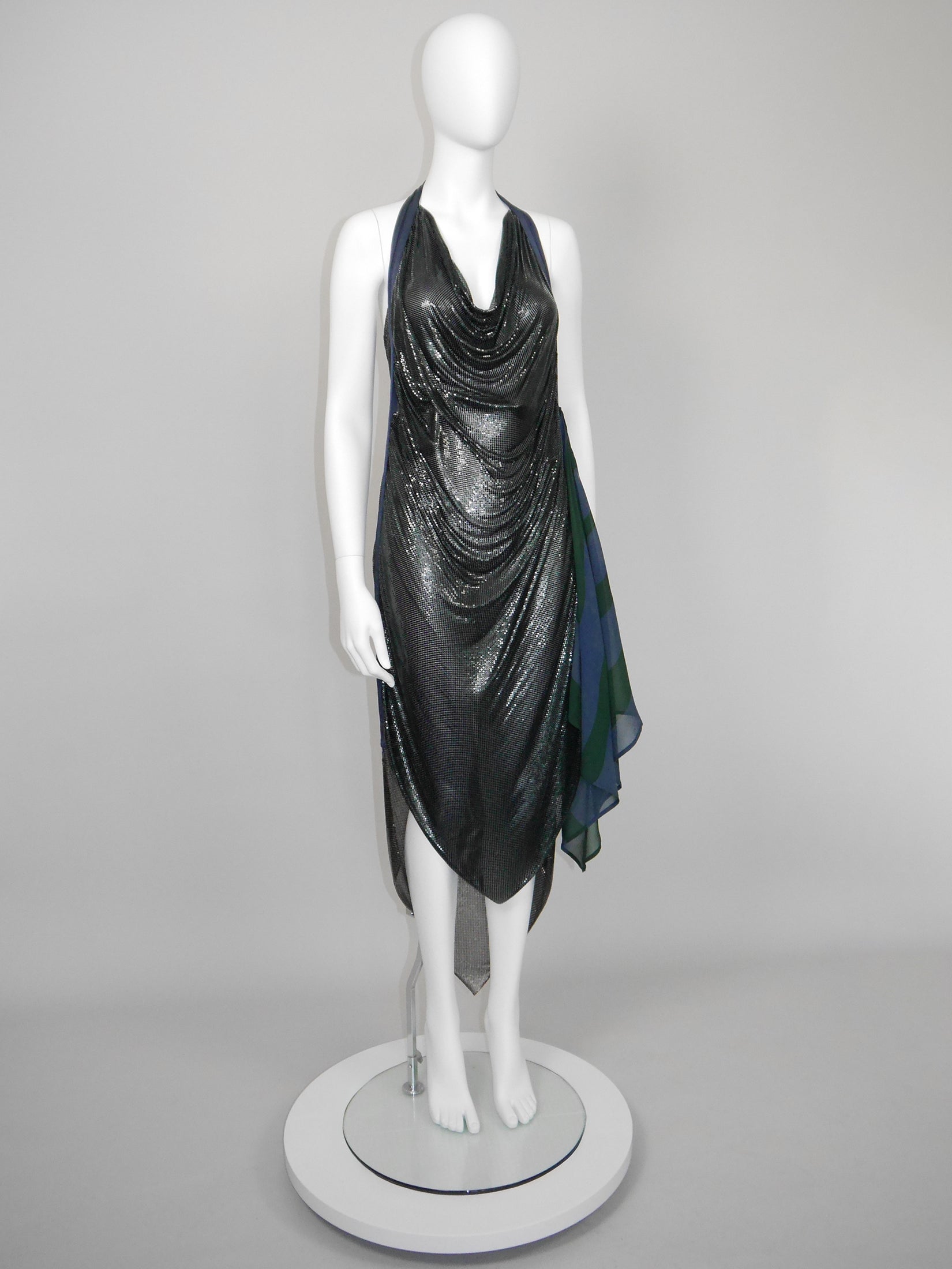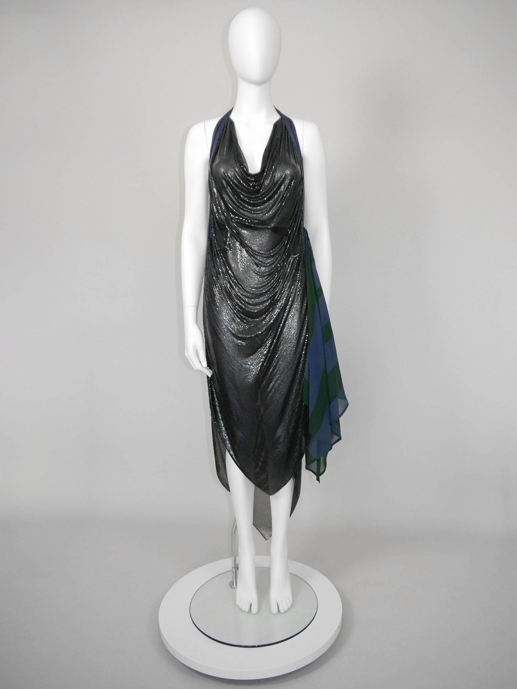 Presents beautifully, but has general signs of wear consistent with age as well as some smaller imperfections and two more substantial flaws as follow. Due to the heavy weight of the dress and its construction, there is a longer tear in the metal (about 4 cm/1.6") at waist level on either side, on the left side with the stitching of the silk unraveling in that area, on the right side right next to the velcro closure, as well as small damage at the neckline in the front and under the arm respectively. On the mannequin, these damages disappear in the drapes of the metal. A few minimal imperfections to the mesh overall. The silk has general signs of wear consistent with age (a pin hole, some color fading, etc.).