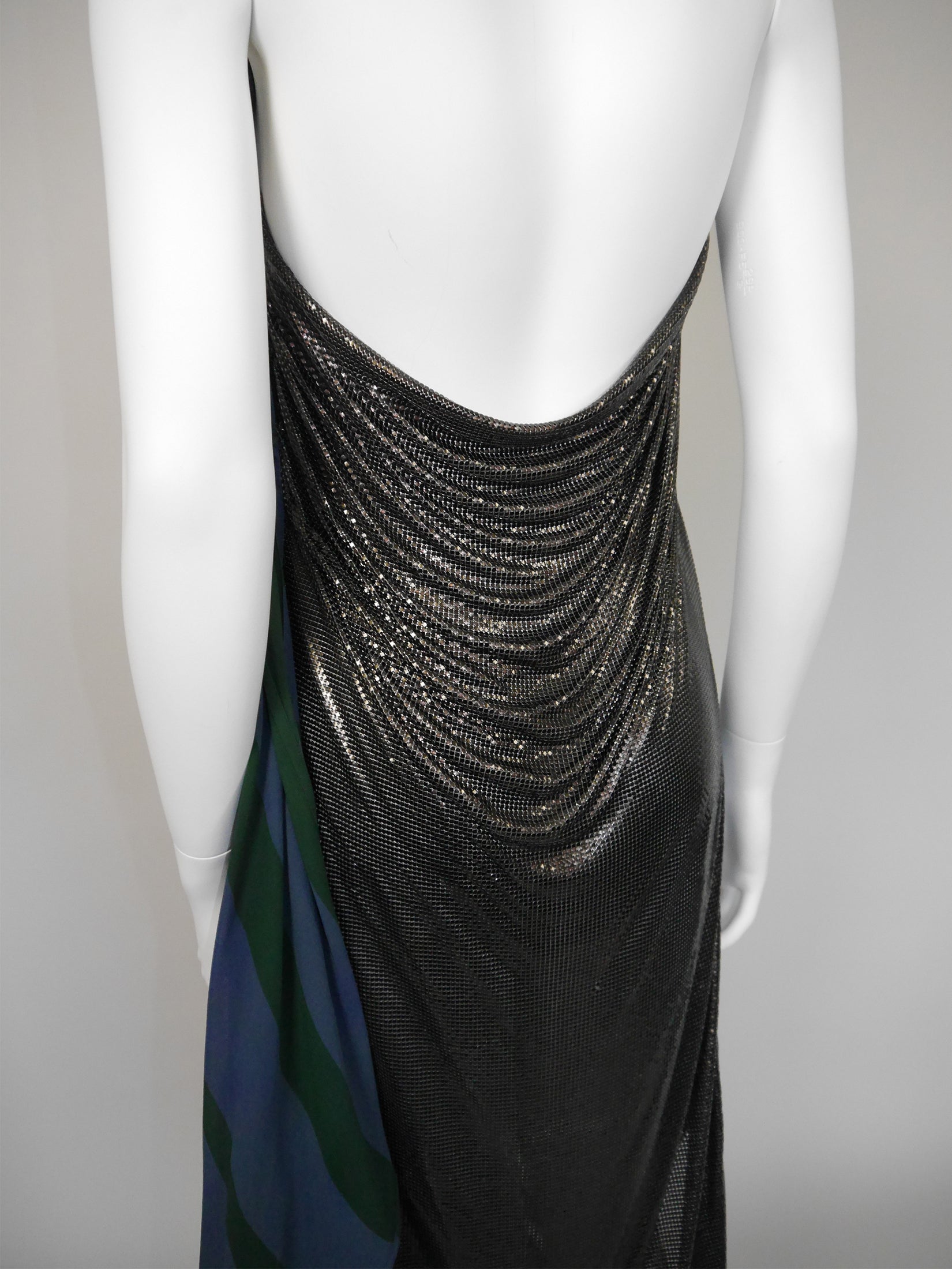 This incredibly rare and iconic vintage Gianni Versace dress from around Spring 1984 is made from the designer's emblematic Oroton metal, with a greenish ruthenium front and a brownish ruthenium back. The dress has a blue silk halter neck, a waterfall neckline on front and back with beautifully draped Oroton, and two blue and green striped silk panels at the side. Pointed hem, longer at back, side slit. The dress closes with a strong velcro closure at the side and hidden snaps and hooks and eyes at the neck. Internal elastic waistband. Substantial weight. 100% aluminum and 100% silk. Made in Italy. An instantly recognizable and highly collectible early Versace piece.