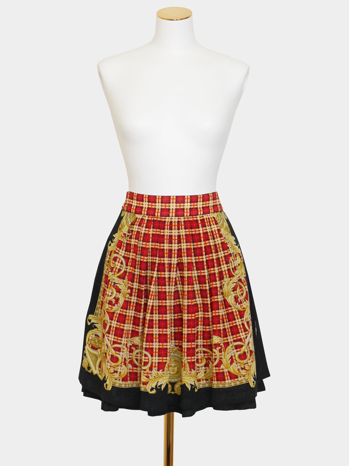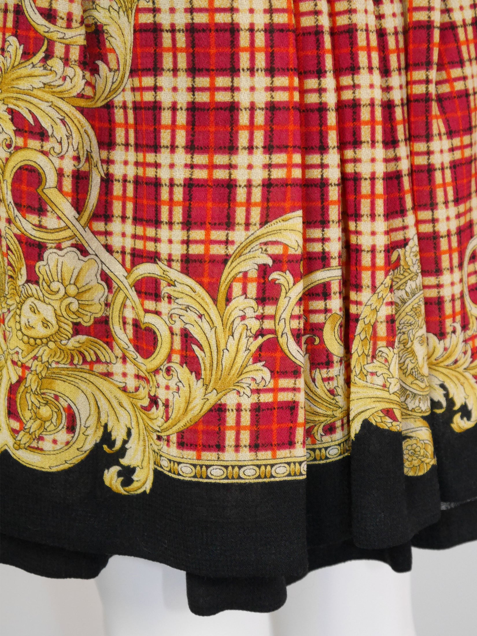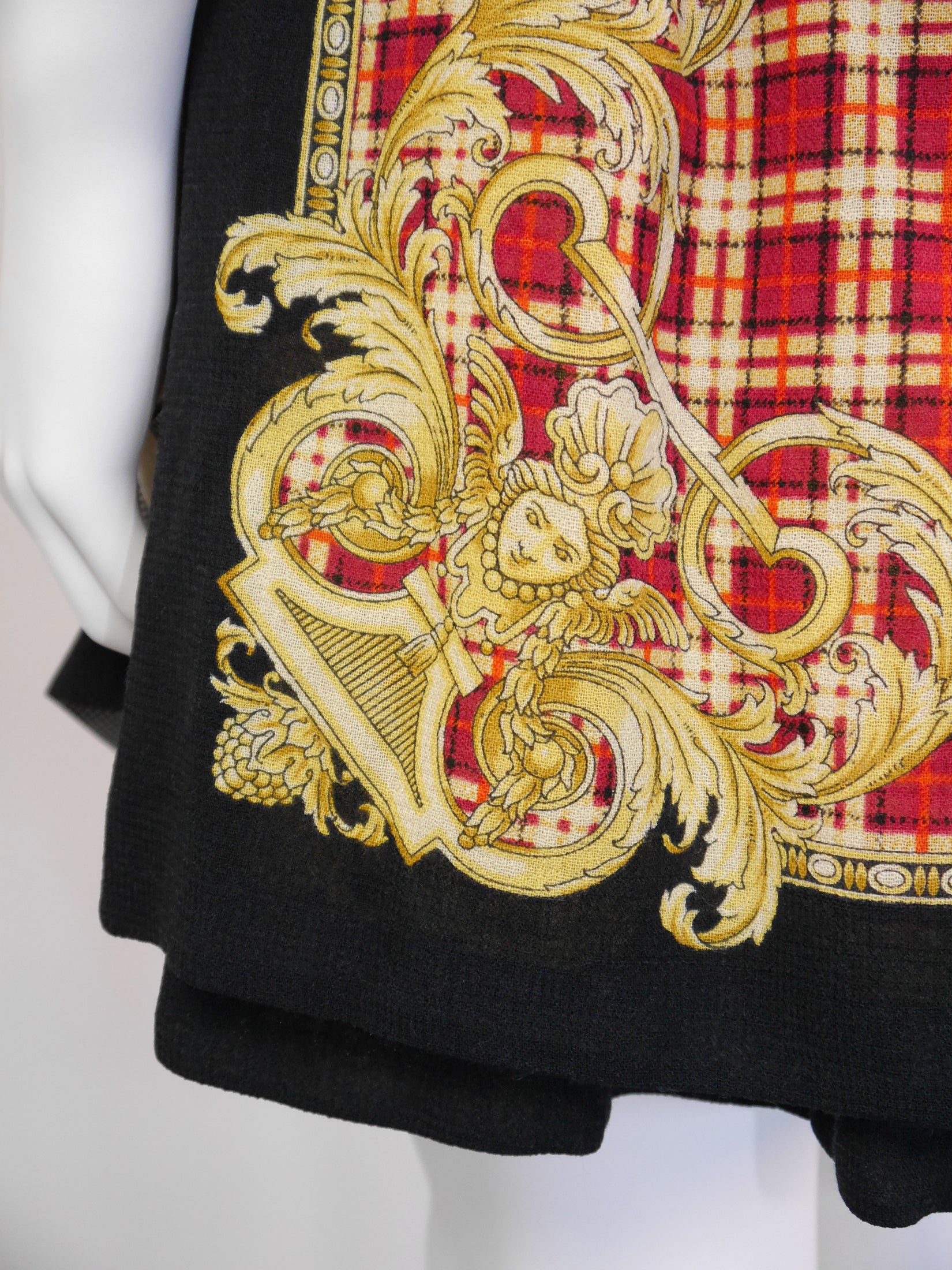 This iconic Gianni Versace Couture skirt from c. Spring 1992 is crafted from wool crêpe with an instantly recognizable baroque print and Medusa head details. The colours are black, dark red, orange and shades of golden yellow. The skirt is constructed from two layers, the bottom one slightly longer than the top layer, flared and with pleated details. The skirt finishes a few inches above the knee and closes at the side with a zipper, a hidden button and a metal hook and eye. Intriguing details such as the inner edges that are trimmed with black and white gingham fabric speak of the very high quality that is so characteristic of Gianni Versace pieces from the 1990s. A charming, fun and sexy piece that at the same time is easy to style and wear. 100% wool, lining 100% rayon. Made in Italy.