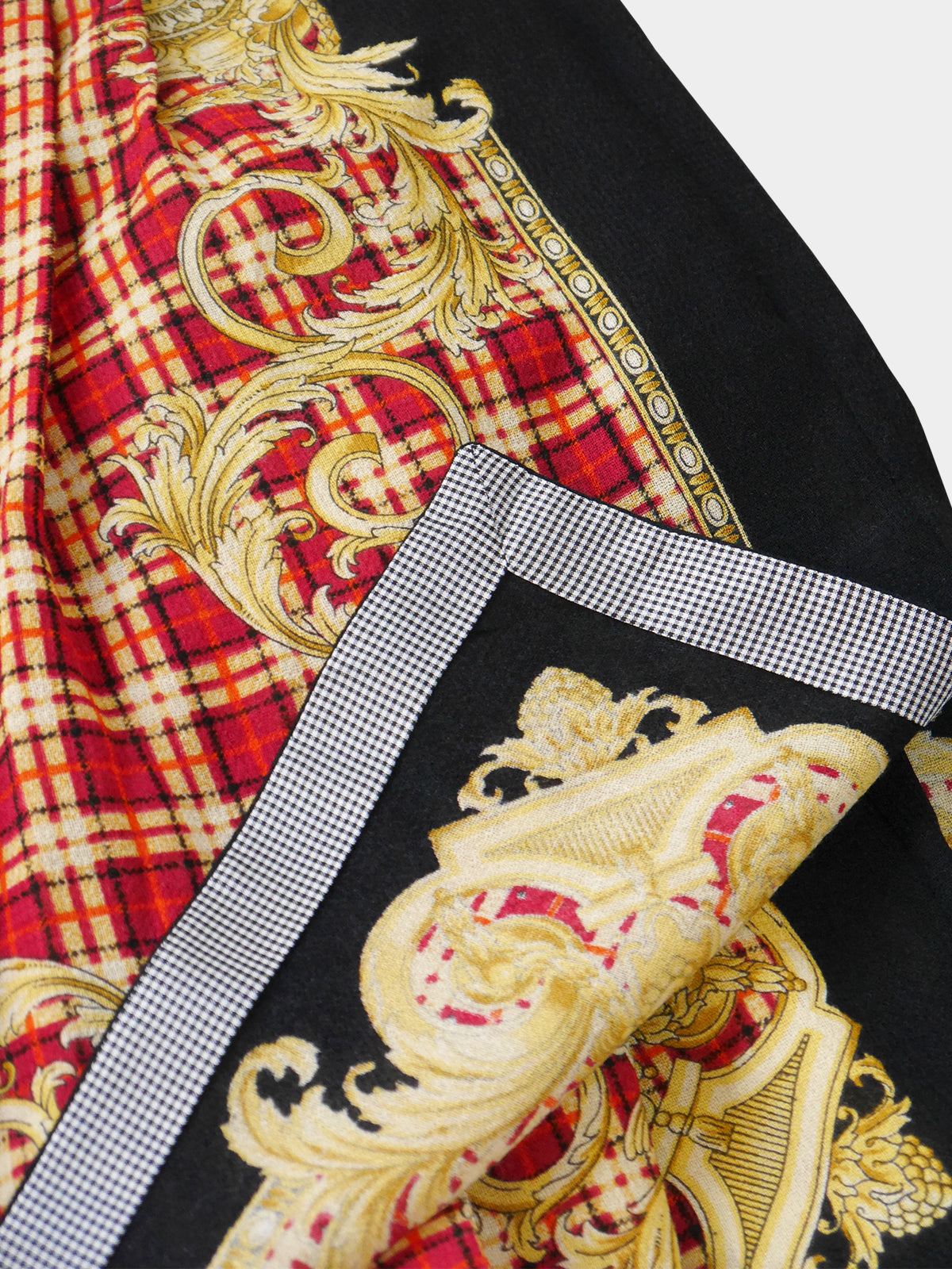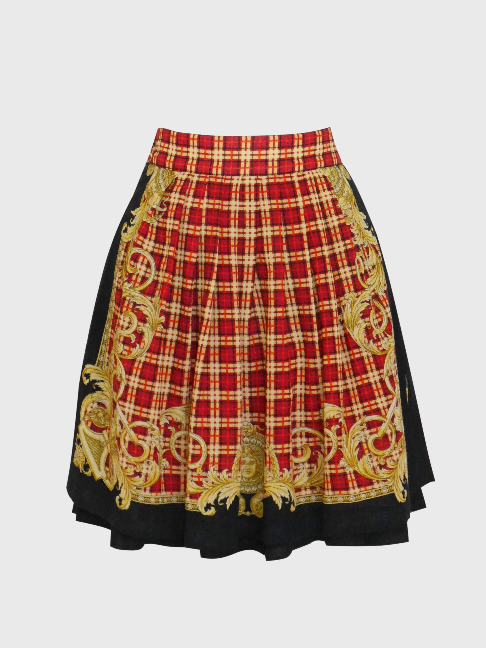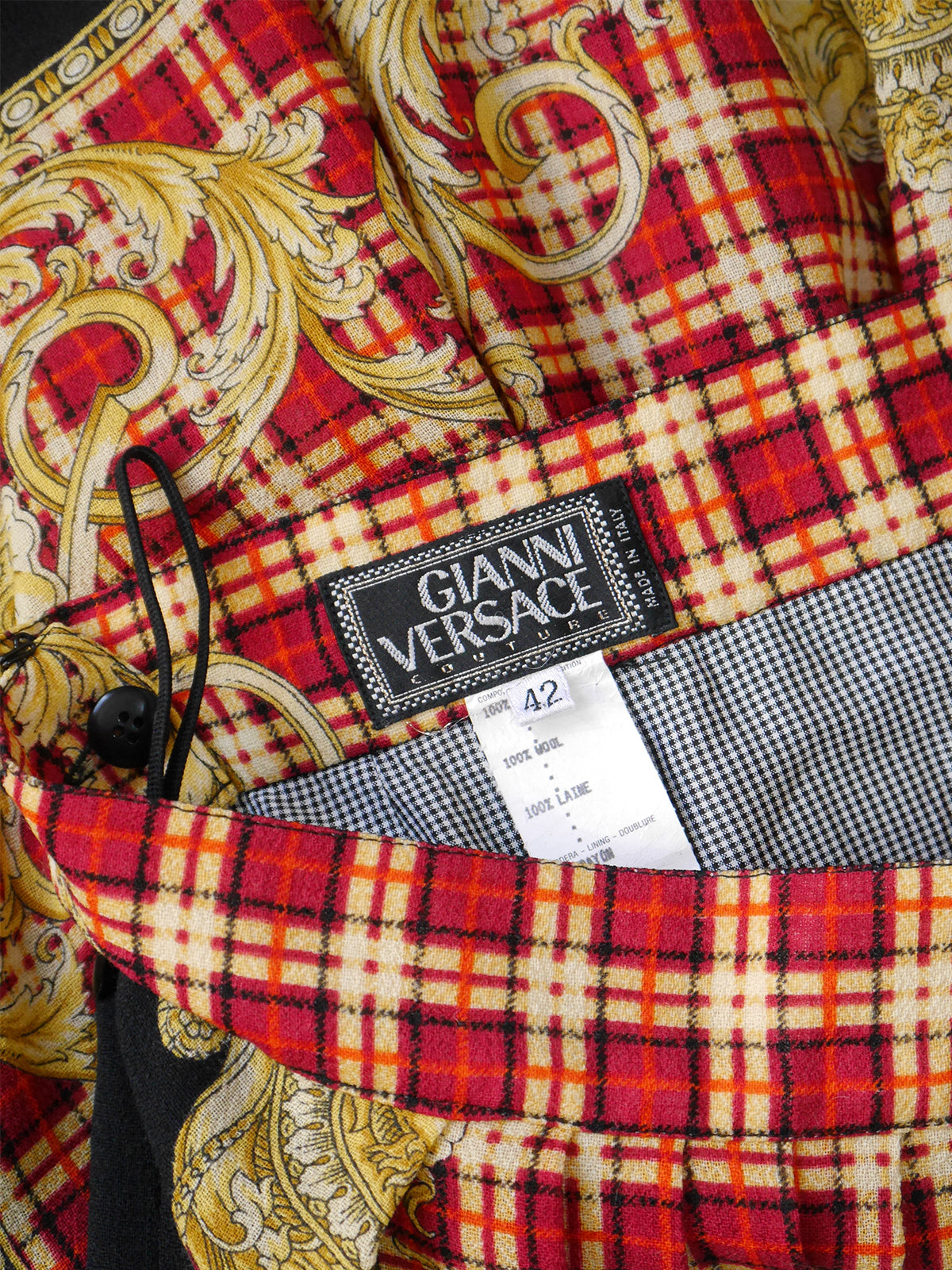 This iconic Gianni Versace Couture skirt from c. Spring 1992 is crafted from wool crêpe with an instantly recognizable baroque print and Medusa head details. The colours are black, dark red, orange and shades of golden yellow. The skirt is constructed from two layers, the bottom one slightly longer than the top layer, flared and with pleated details. The skirt finishes a few inches above the knee and closes at the side with a zipper, a hidden button and a metal hook and eye. Intriguing details such as the inner edges that are trimmed with black and white gingham fabric speak of the very high quality that is so characteristic of Gianni Versace pieces from the 1990s. A charming, fun and sexy piece that at the same time is easy to style and wear. 100% wool, lining 100% rayon. Made in Italy.