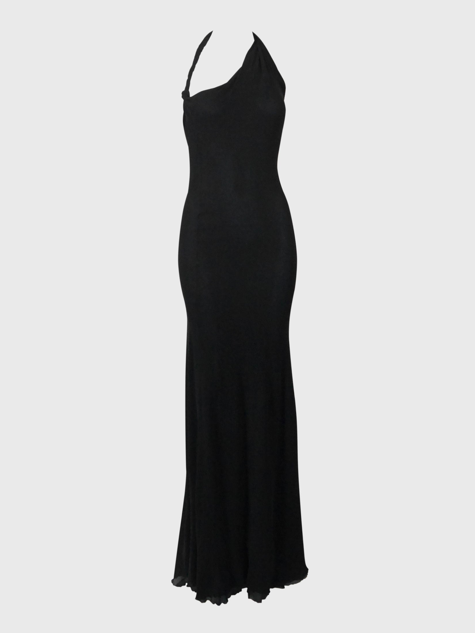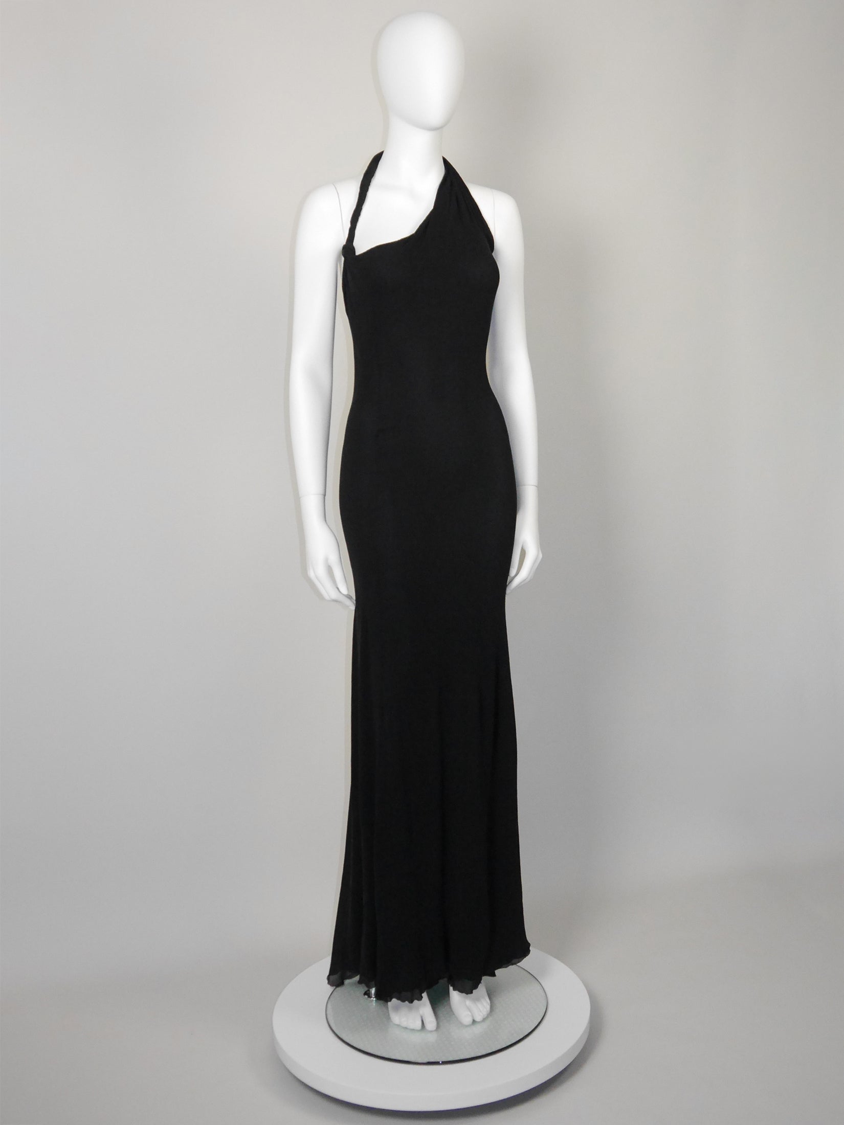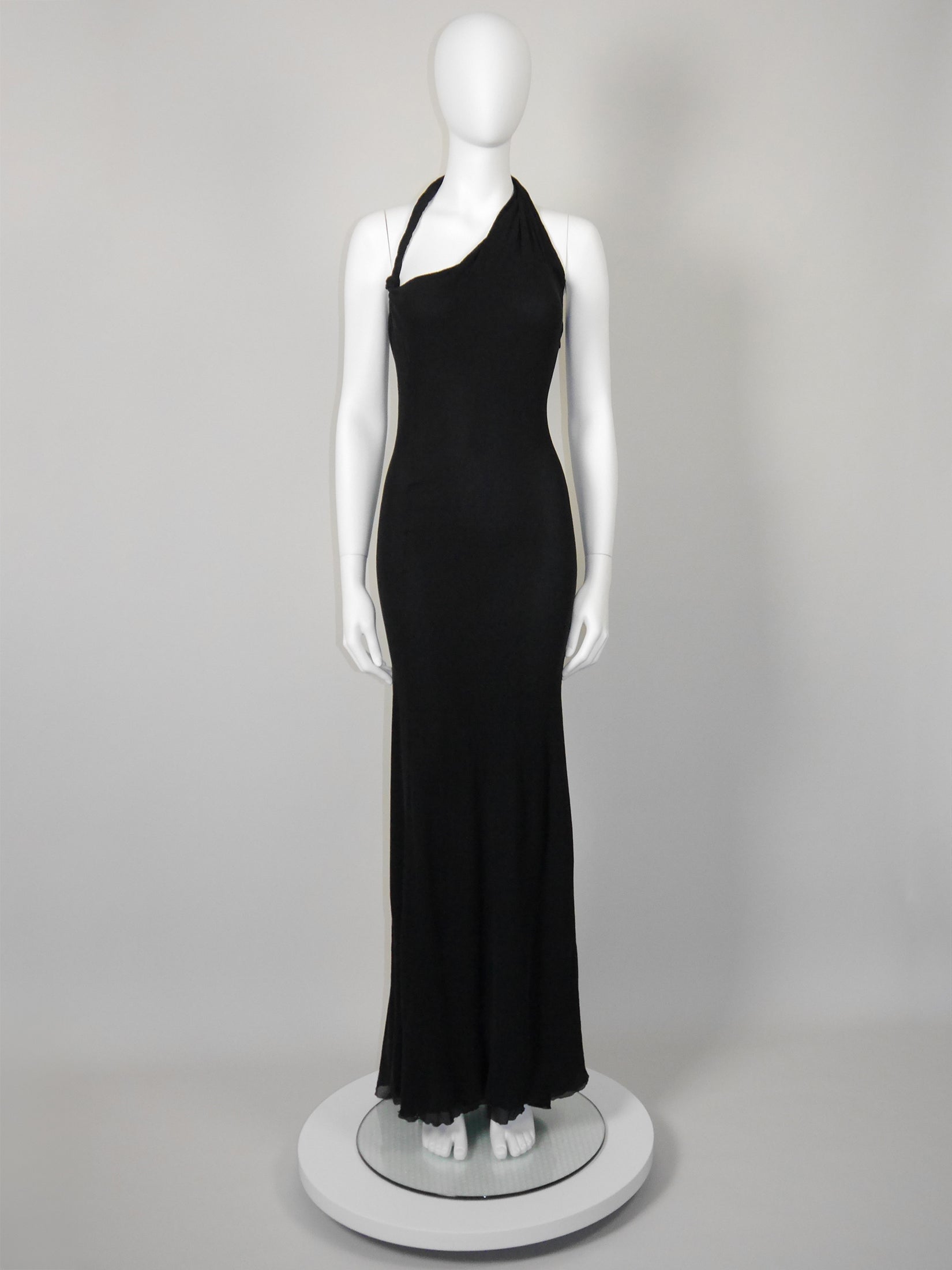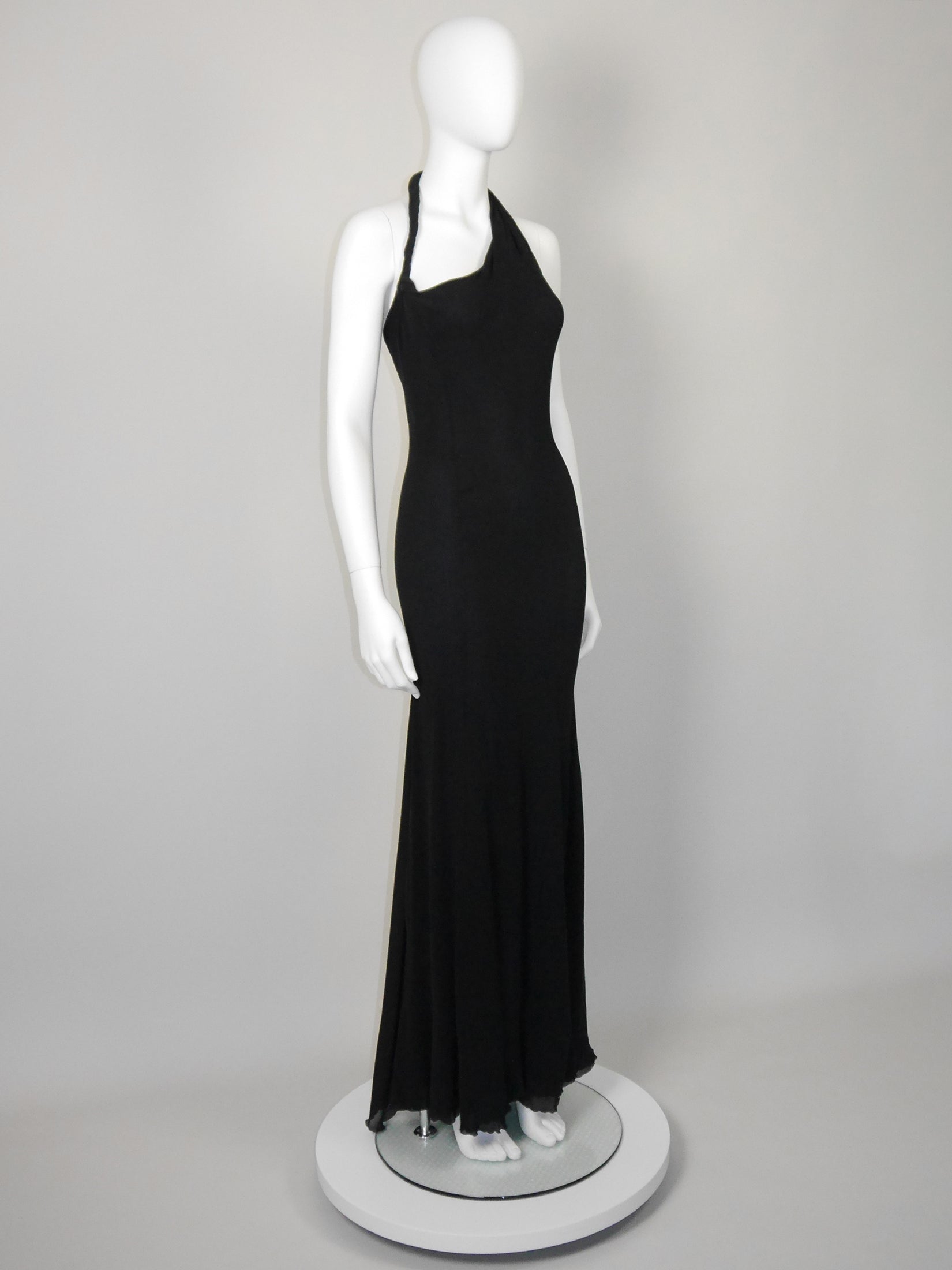 This stunning vintage Gianni Versace Couture evening dress dates back to the late 1990s or early 2000s, so probably an early design by Donatella Versace, and is made from two layers of finely crinkled black silk stretch. The dress has a figure-hugging cut, an asymmetrical halterneck and a flared, floor-length skirt with a daring high back slit and a curly hem. Closes at the side with a zipper and a metal hook and eye. No material label, probably silk with lycra, unlined. Made in Italy.
