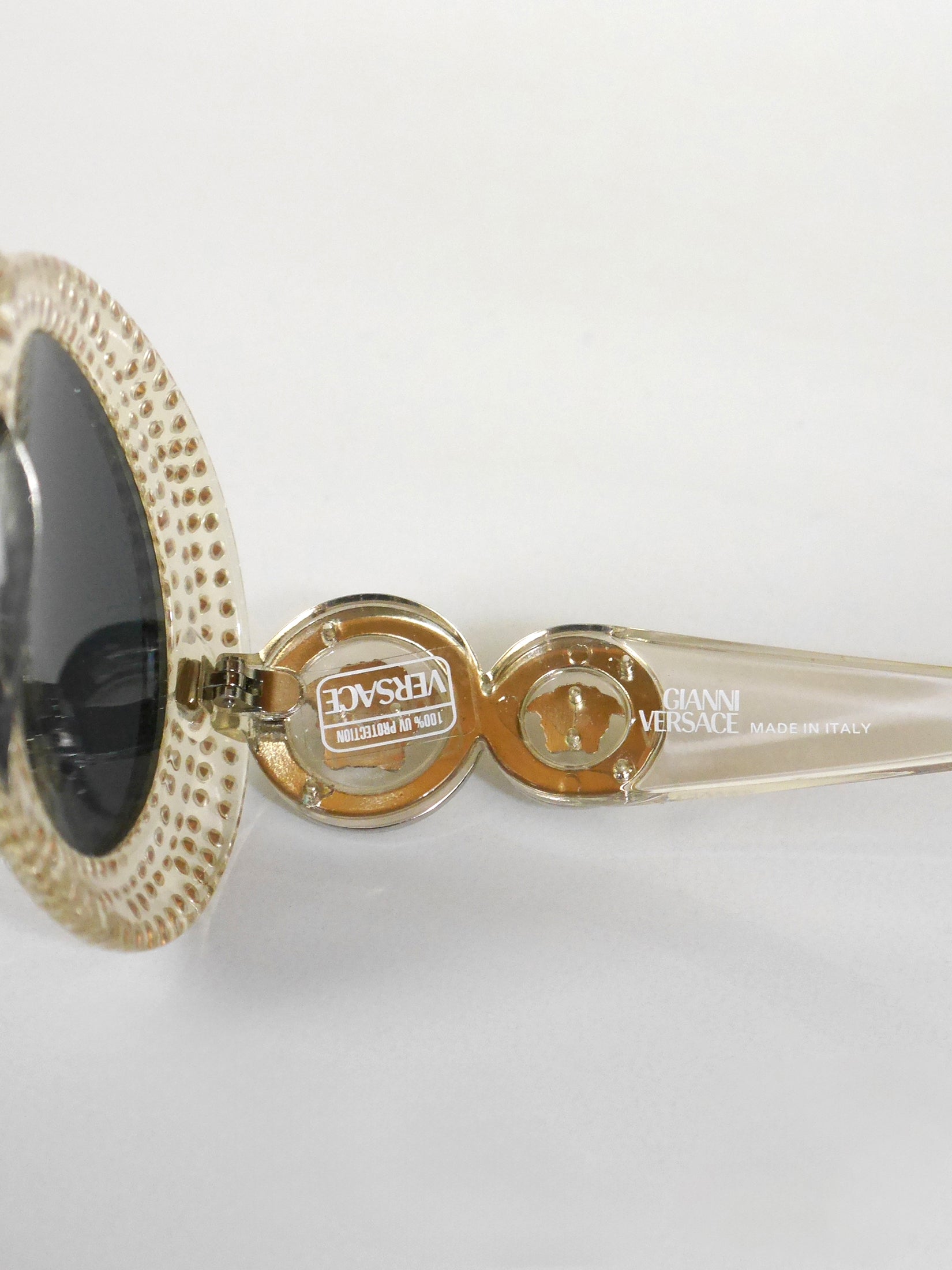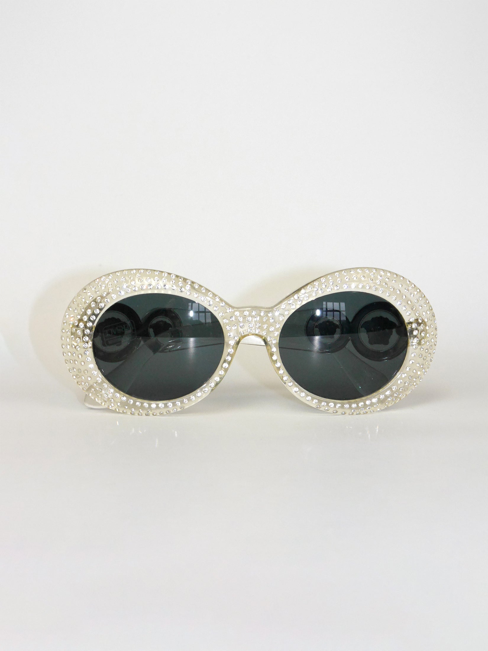 Rare and iconic round oversized sunglasses from Gianni Versace’s Fall 1996 collection. Crafted in transparent plastic and adorned with hundreds of sparkling rhinestones, these statement frames feature two silver-tone Medusa heads on each temple and grey lenses. Model 418F, Color 924. Made in Italy.