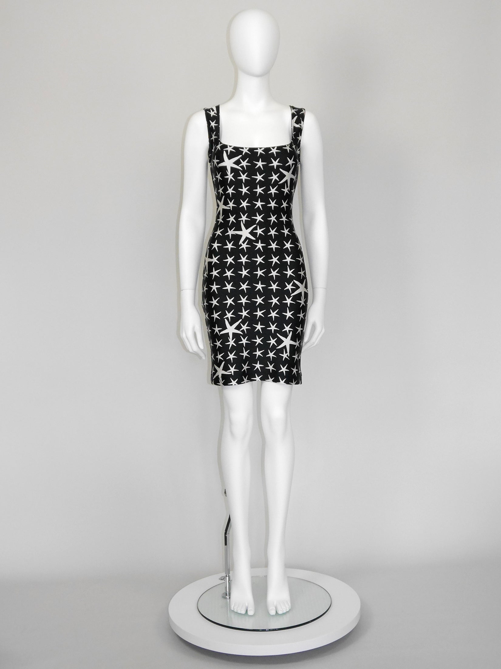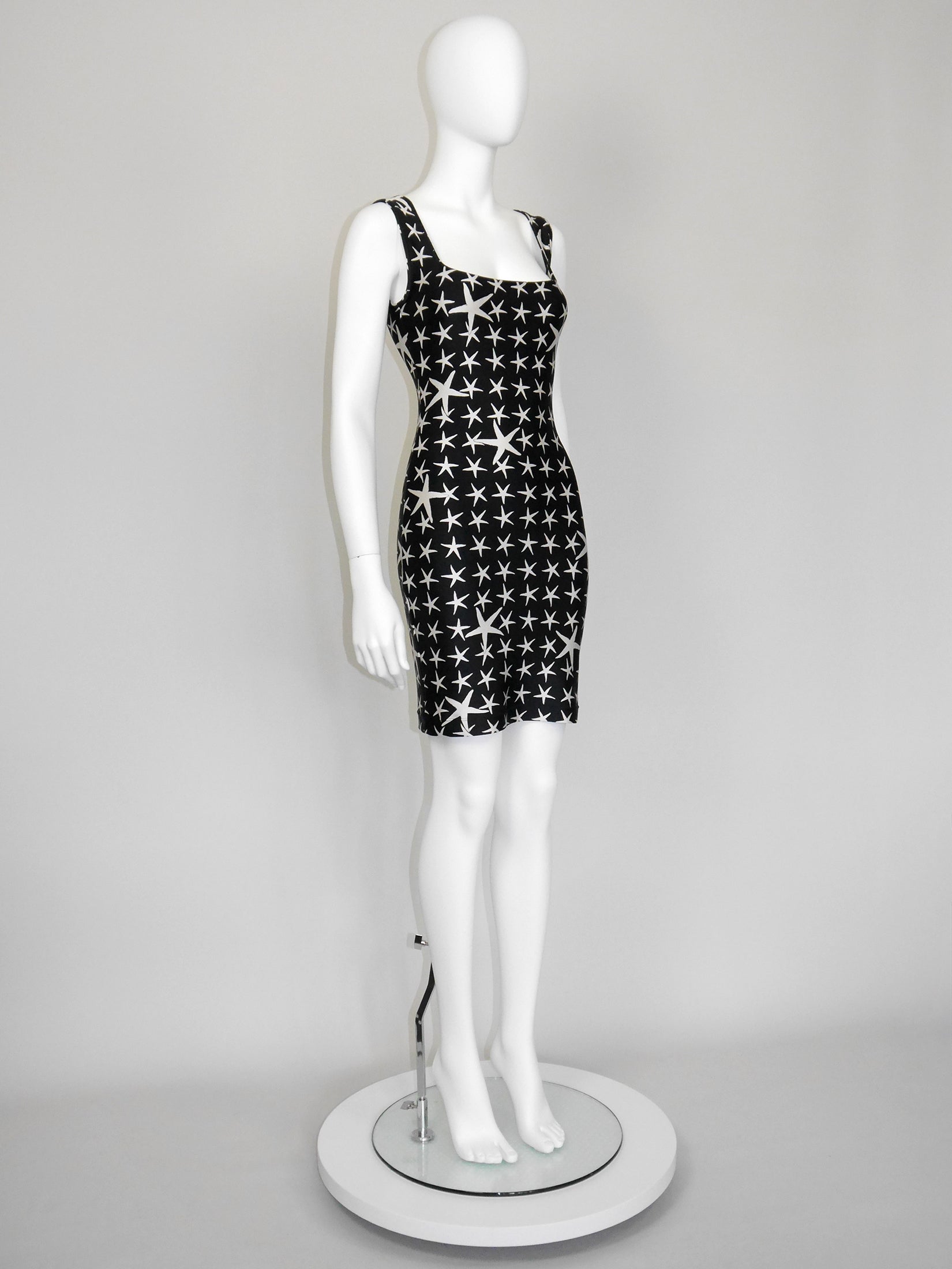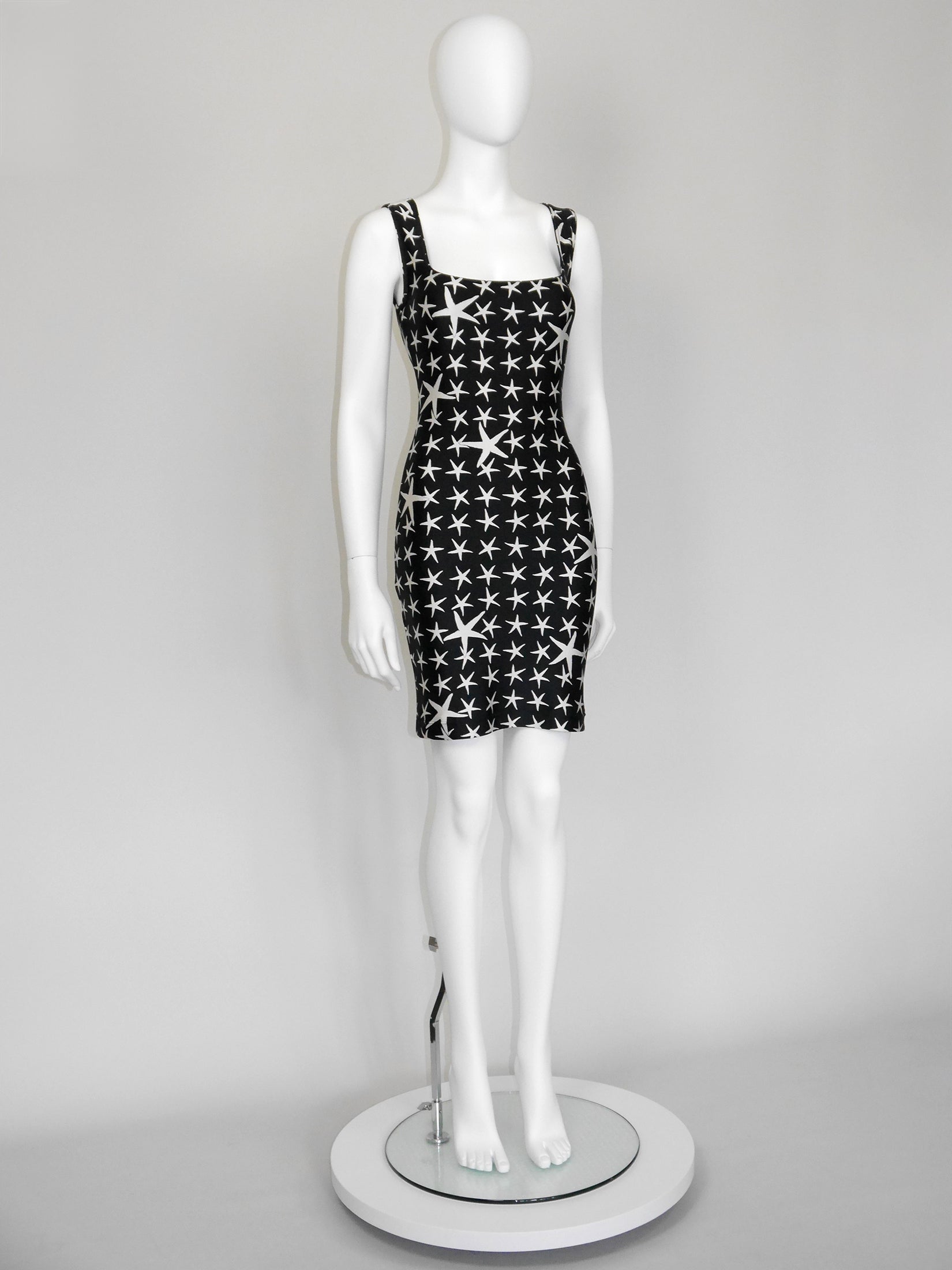 This rare and iconic vintage Gianni Versace dress from the Spring 1996 Atelier Collection is made from a velvety high-quality stretch fabric with the instantly recognizable black and white starfish pattern. The sleeveless mini dress has a sexy bodycon cut and closes with a zipper and a metal hook and eye at the back of the neck. A wonderful statement piece from the house of Versace. No material label, made of synthetics. Unlined. Made in Italy.