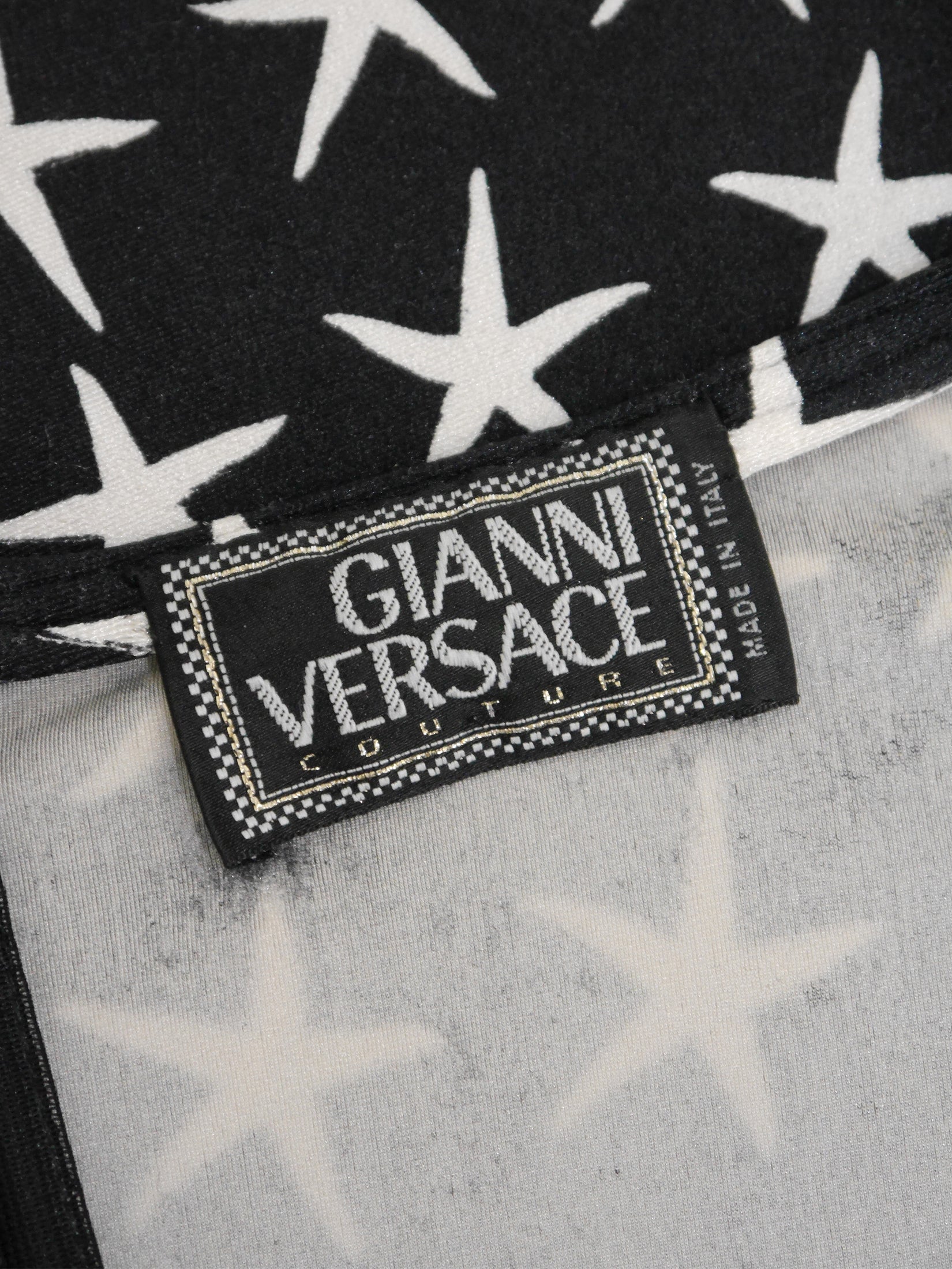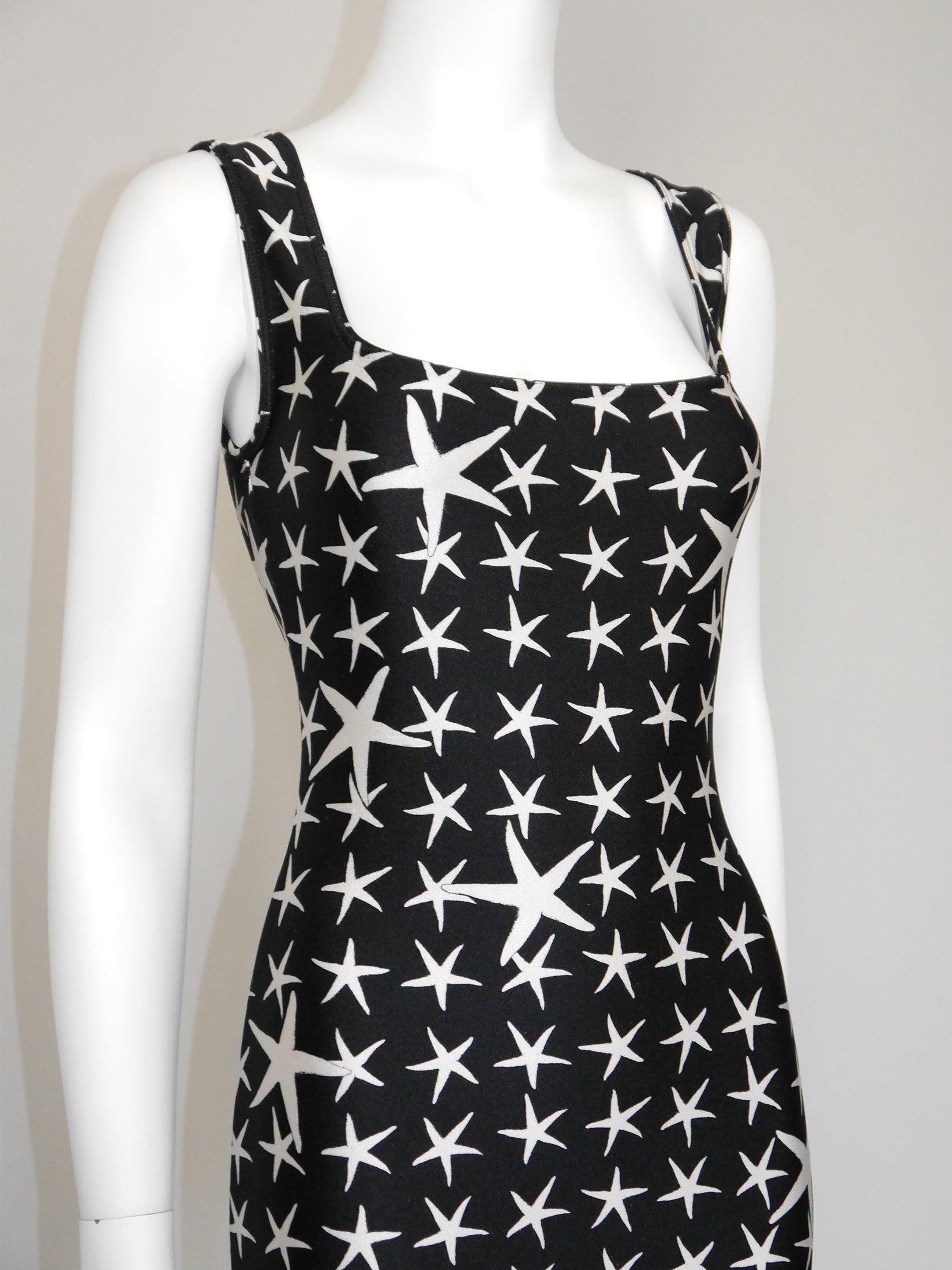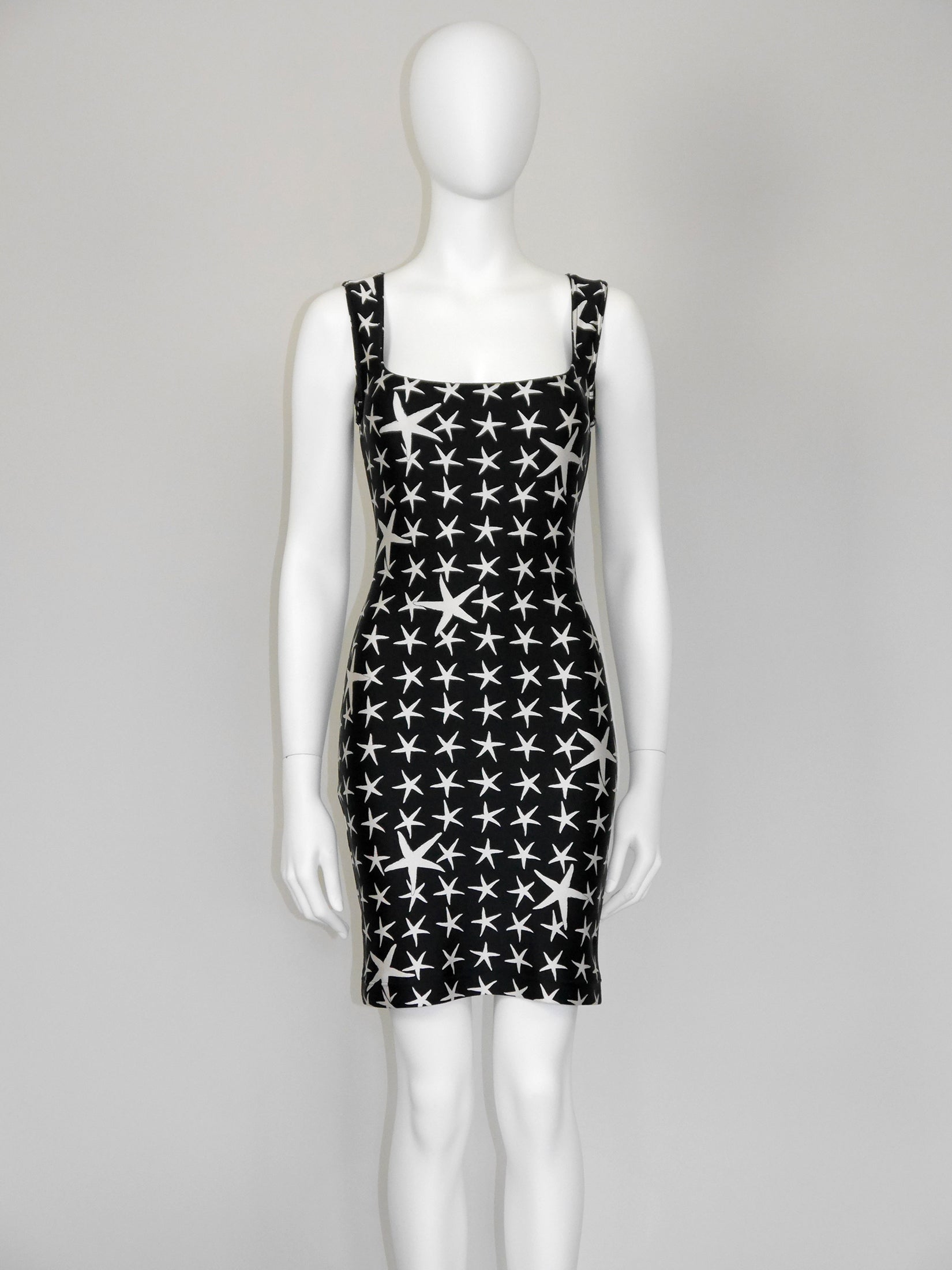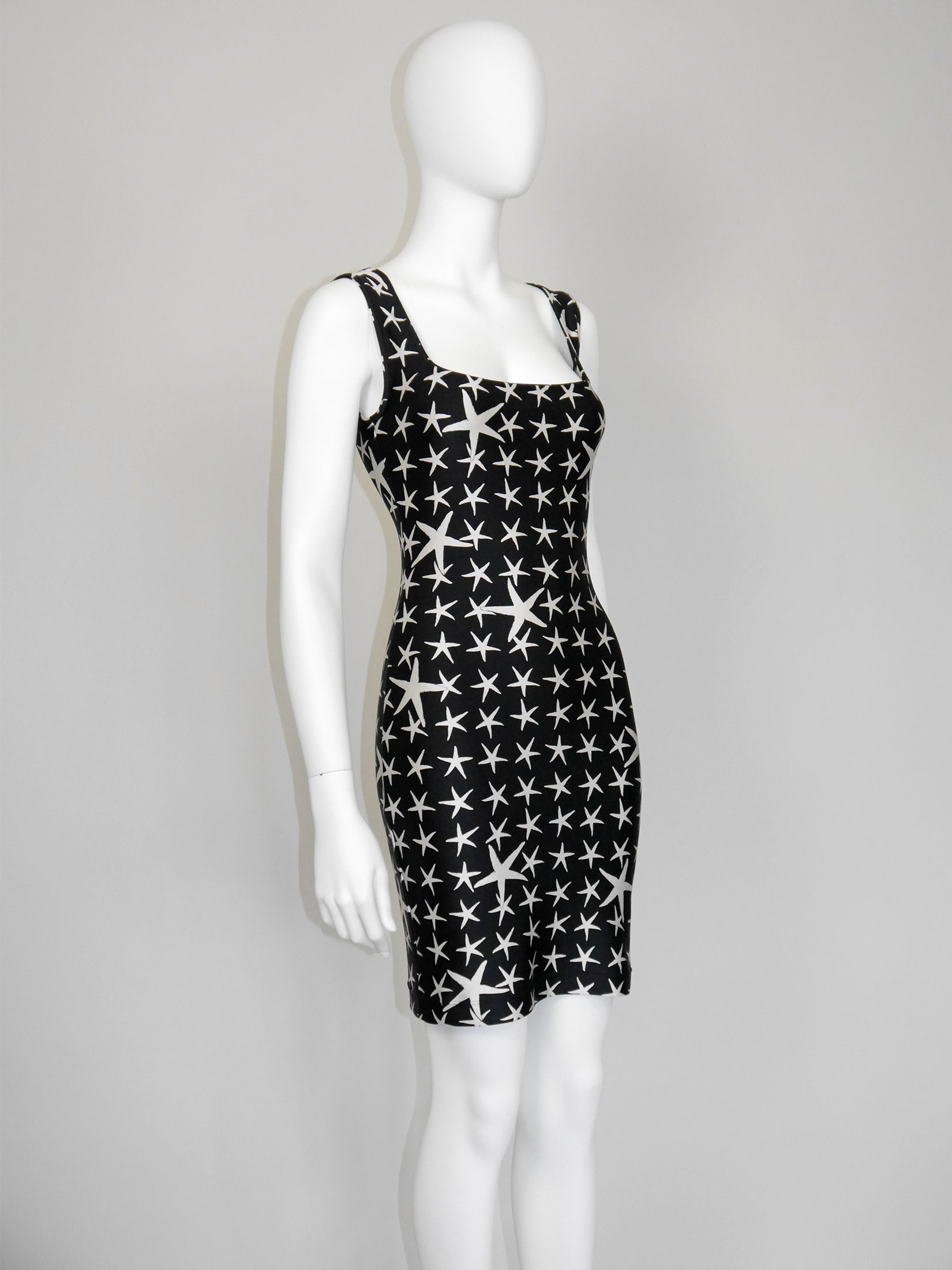 This rare and iconic vintage Gianni Versace dress from the Spring 1996 Atelier Collection is made from a velvety high-quality stretch fabric with the instantly recognizable black and white starfish pattern. The sleeveless mini dress has a sexy bodycon cut and closes with a zipper and a metal hook and eye at the back of the neck. A wonderful statement piece from the house of Versace. No material label, made of synthetics. Unlined. Made in Italy.