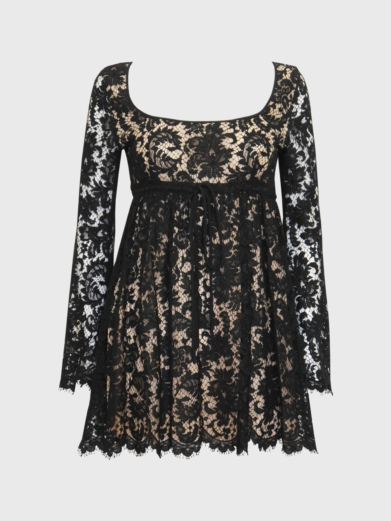 This adorable vintage Gucci babydoll dress from Tom Ford's Spring 1996 collection is made of delicate black lace with silky nude lining. The dress features a fitted bodice with a widely scooped neckline, long flared sleeves (unlined), an empire waist with a black silk drawstring that ties at center front and an ultrashort flared skirt with a scalloped hemline. Side zipper. 70% cotton, 20% rayon, 10% nylon. Lining: 82% rayon, 18% silk. Made in Italy.