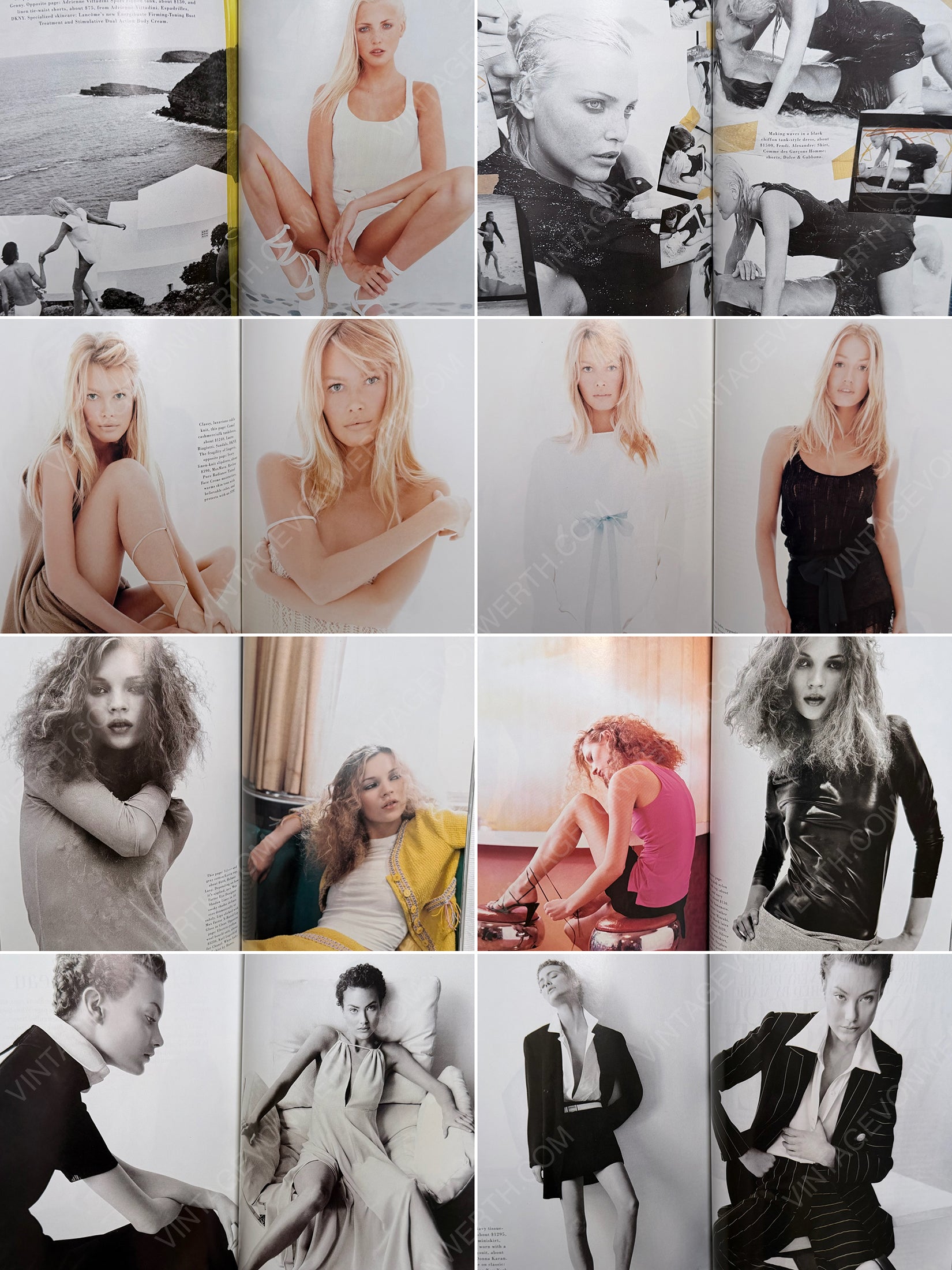It features a stunning Claudia Schiffer cover and striking campaigns from all major fashion labels including Guess with Bridget Hall, Ralph Lauren, Chanel (4 pages with Brandi Quinones and Dana Douglas), Yves Saint Laurent, Karl Lagerfeld with Nadja Auermann, Valentino with Christy Turlington, Neiman Marcus (28 pages by Richard Avedon with Nadja Auermann), Donna Karan, Bill Blass with Helena Christensen, Max Mara (4 pages with Carla Bruni), Sonia Rykiel with Nadja Auermann, Gianni Versace with Linda Evangelista, Bottega Veneta, Givenchy Couture, Chloé with Naomi Campbell, Claude Montana, Prada with Christy Turlington, Jil Sander with Amber Valletta, and Calvin Klein with Kate Moss, among many others.