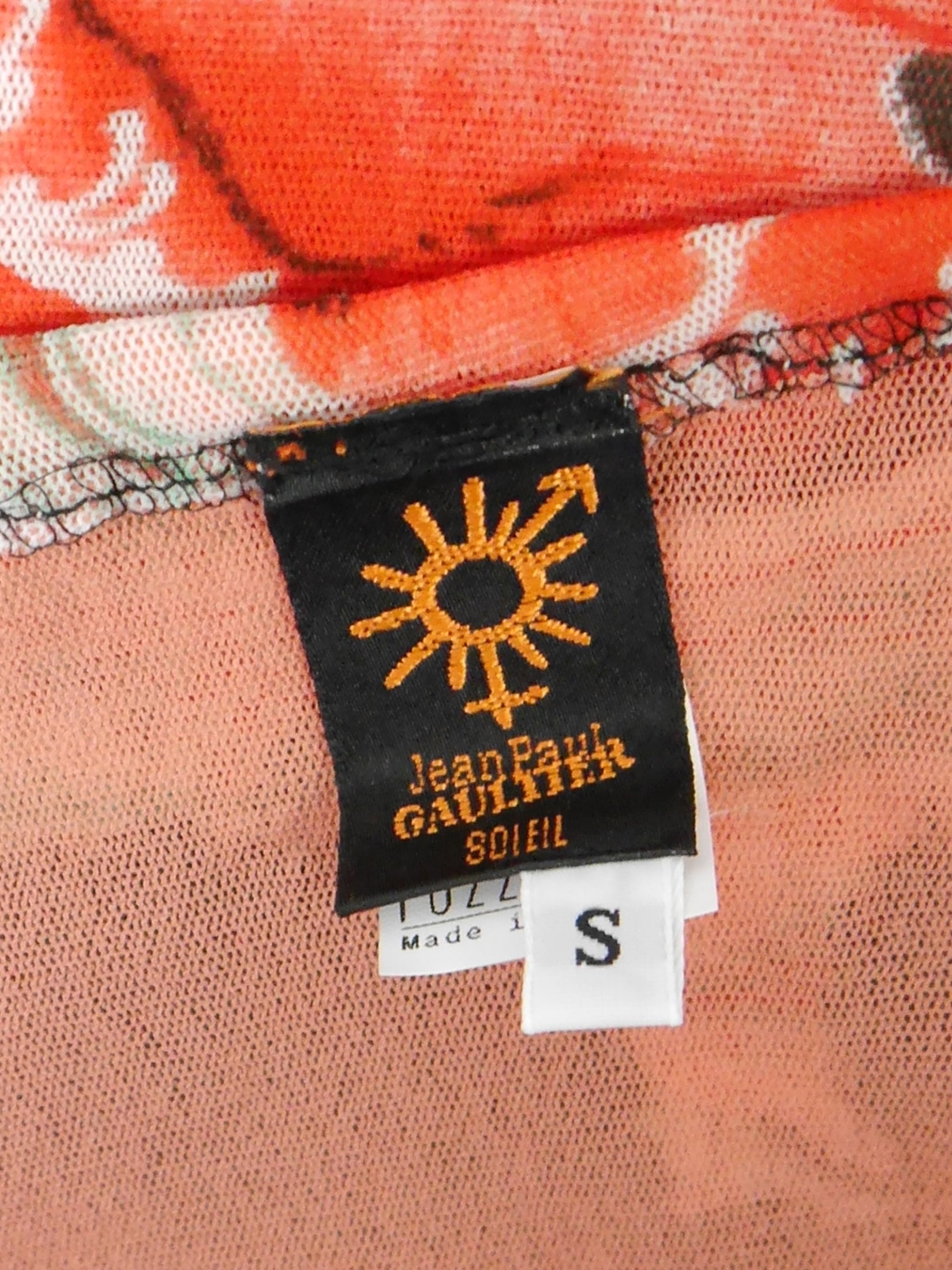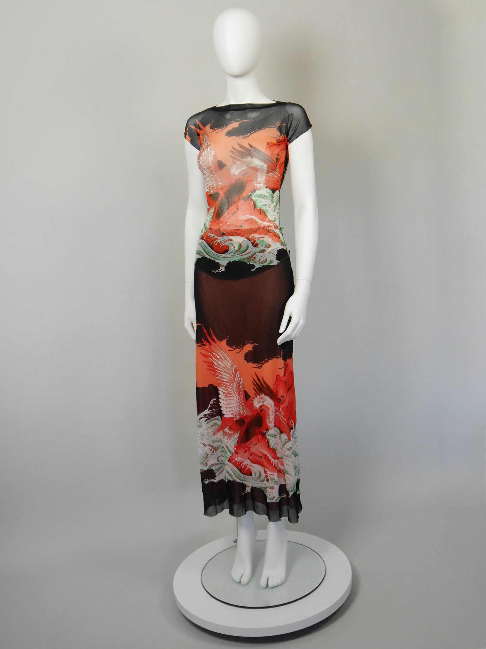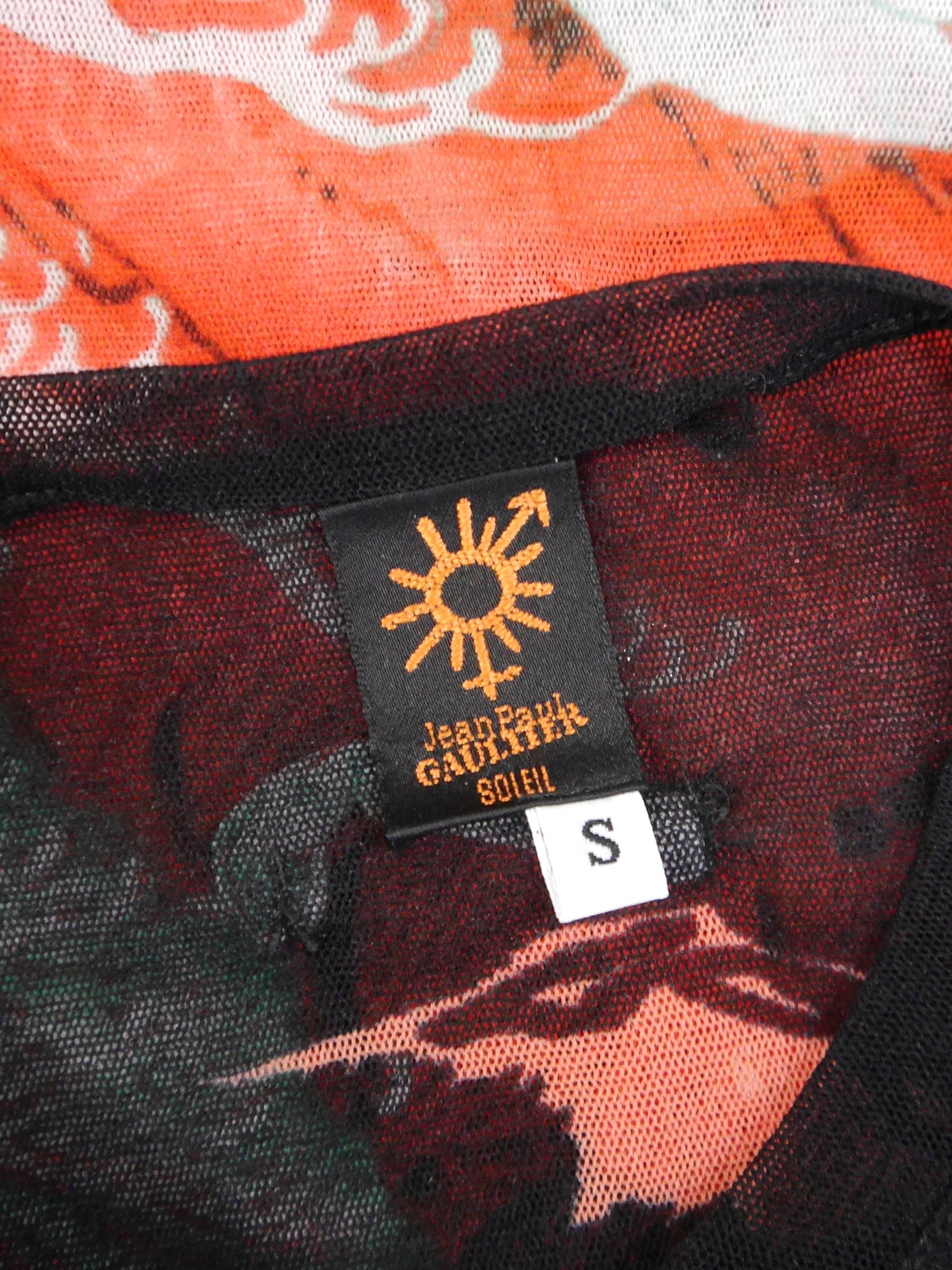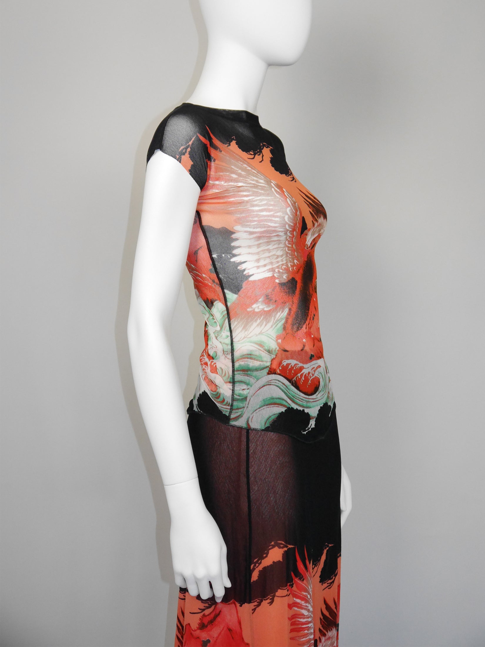 This rare and iconic vintage Jean Paul Gaultier set from the 1990s is made of the designer's fine signature mesh and features the instantly recognizable "dragon" or "eagle" print in the red colorway. The ensemble comprises a shirt and the matching maxi skirt. Both pieces slip on to wear. 100% polyamide. The skirt is lined with an additional layer of orange mesh for opacity, the shirt is unlined. Made in Italy. This set is an absolute rarity as both pieces are the same size and the delicate mesh is fully intact. Kendall Jenner famously wore an ensemble with this print in yellow (reference picture via vogue.com).