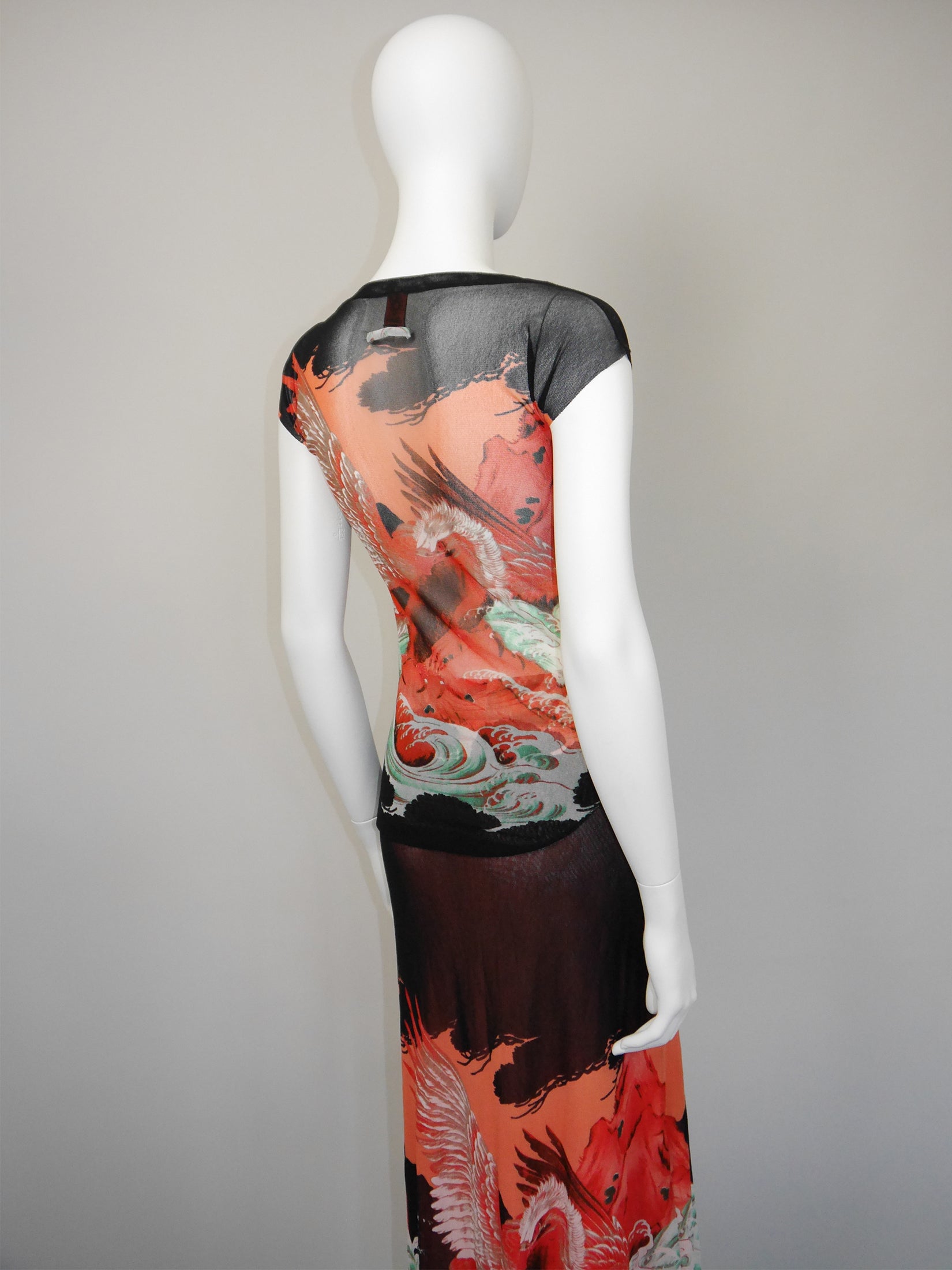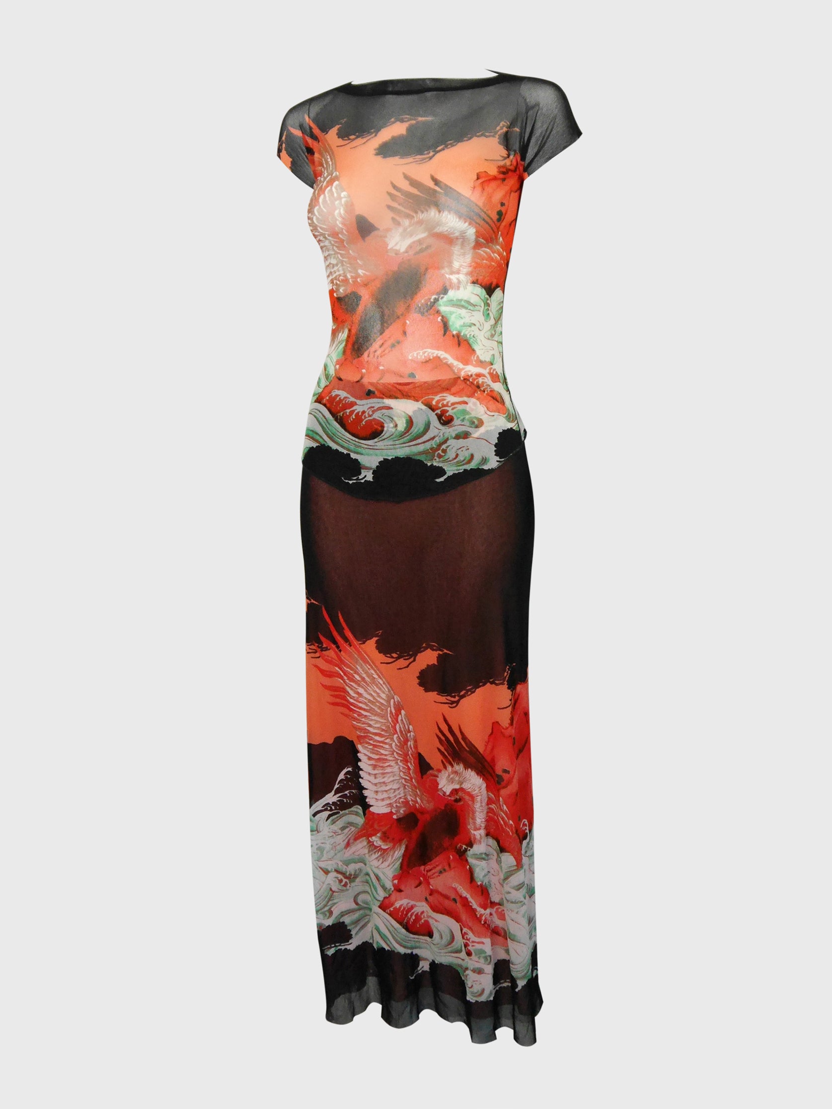 JEAN PAUL GAULTIER 1990s Vintage Mesh Shirt & Maxi Skirt Ensemble Dragon Eagle Print