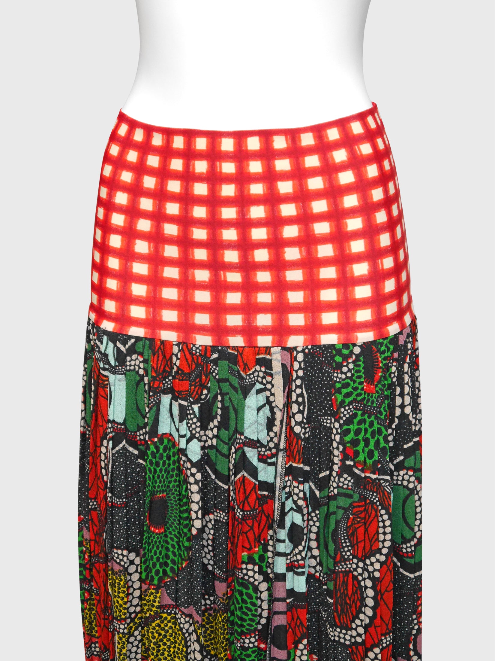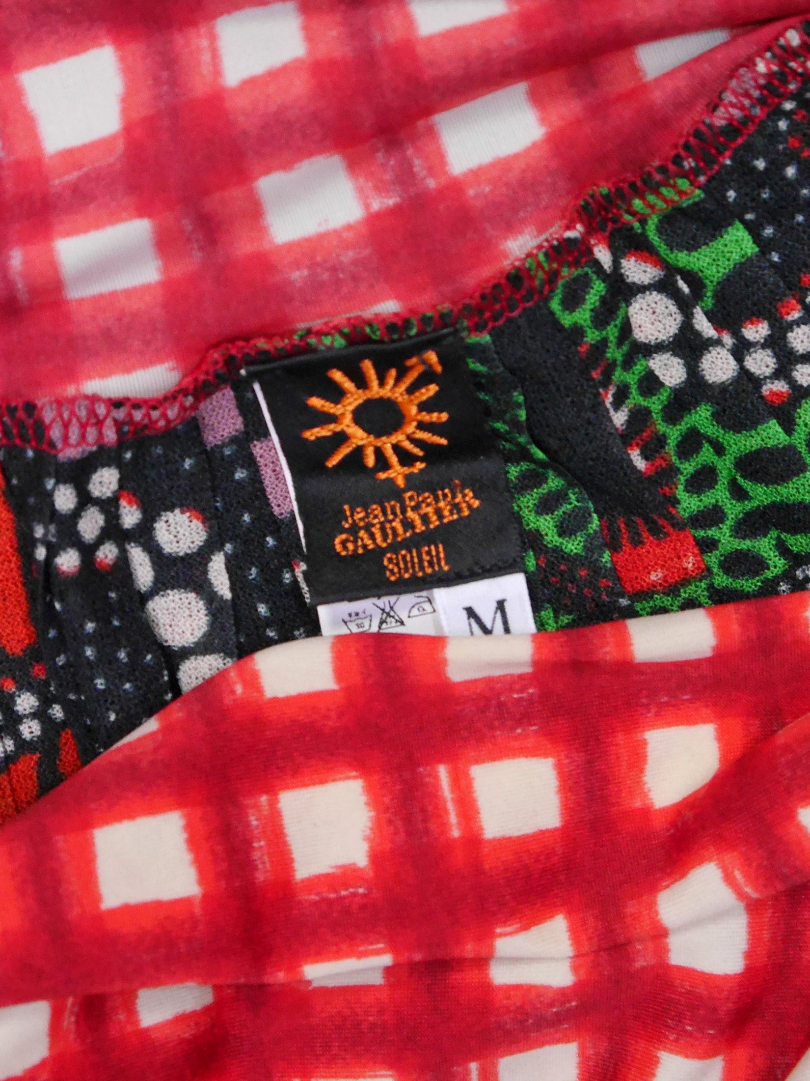 This incredible vintage Jean Paul Gaultier maxi skirt from circa 1996 - the Cyberdot/Cyberbaba era - showcases a rare, instantly recognisable op-art print in red, green, light blue, yellow, black and purple. It features a wide stretch waistband in red-and-white checkered jersey. The skirt is sharply pleated, creating a wide flare with a generous hemline and strong movement. A high front slit forms where the fabric overlaps. Versatile in styling, it can be worn lower or higher on the hips or waist, or even as a bandeau dress, as shown in the images. Slips on to wear. Composition: 46% polyester, 40% polyamide, 15% cotton. Unlined. Made in Italy.