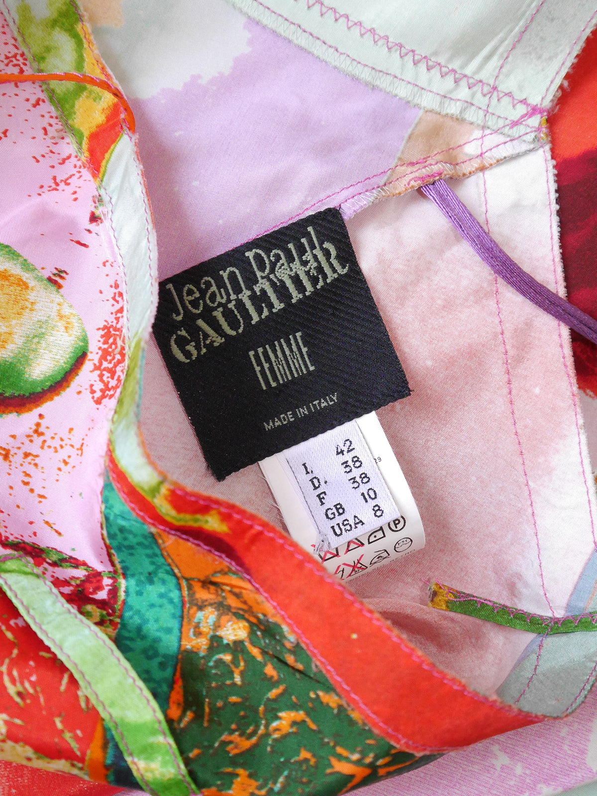 This iconic vintage slip dress by Jean Paul Gaultier from Spring 2002 features the instantly recognizable portrait print - a celebrity favourite - in bold colours and with countless Gaultier logos and signatures scattered throughout the fabric. The fabric is a tightly woven yet ultra-light viscose fabric that has a feel somewhere between silk and nylon. The dress is bias cut and simply slips on, with no closure. It ends just below the knee with a charming flounce and has delicate spaghetti straps, raw edges and decorative zigzag seams. 100% rayon, unlined. Made in Italy. The bold print in very rich, bright colours and the loose cut make this piece the ideal go-to summer dress and a perfect choice for day or night. Pieces with this Jean Paul Gaultier portrait print were recently worn by Kylie Jenner and Halsey.