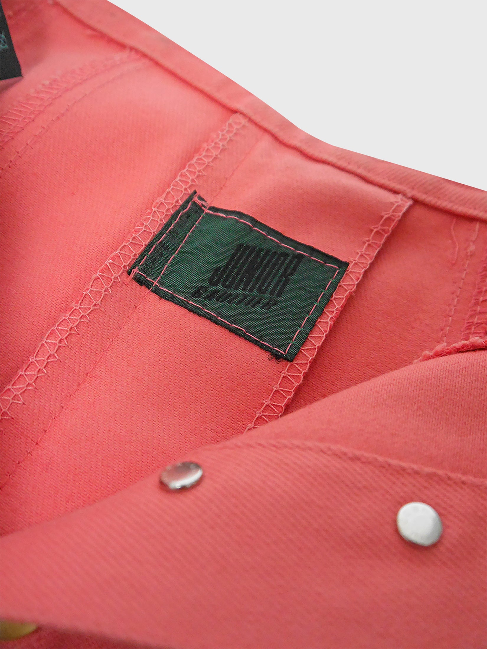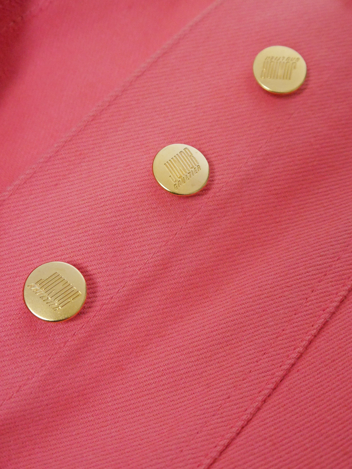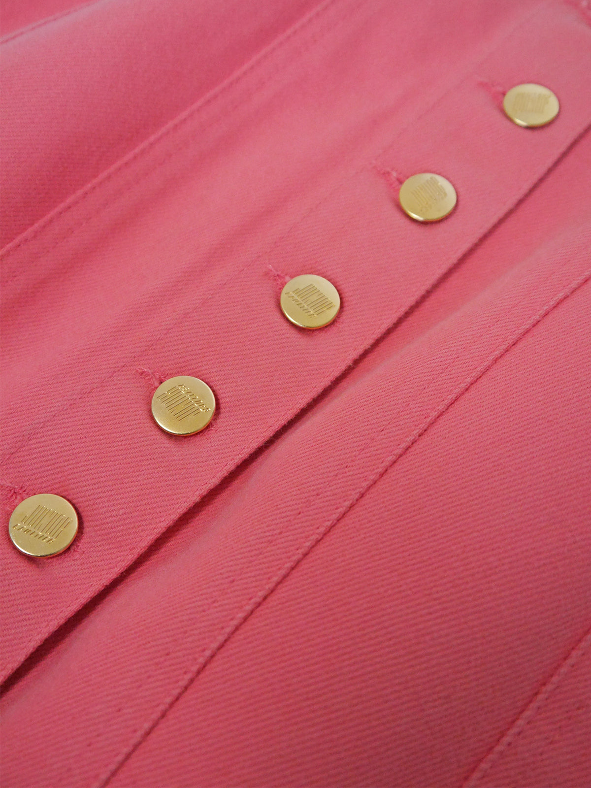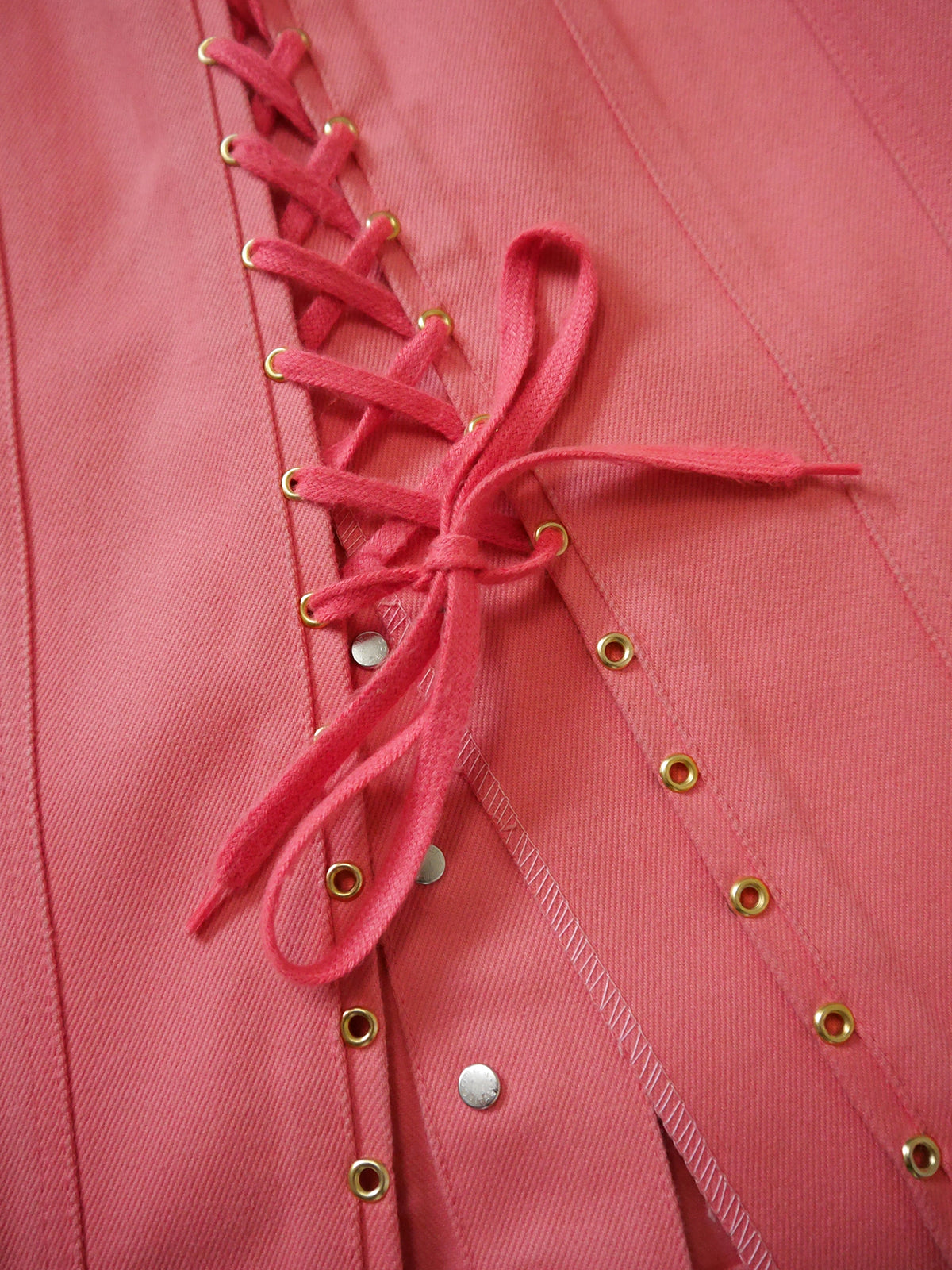 This iconic vintage Junior Gaultier skirt from the 1980s or early 1990s is made of salmon pink denim and features a very fitted, very sexy cut and sits at knee-length. Buttoned down the front with gold-tone metal Junior Gaultier signature buttons. 17-hole lacing at the back with original lace. 100% cotton, denim quality, unlined. Made in Italy.