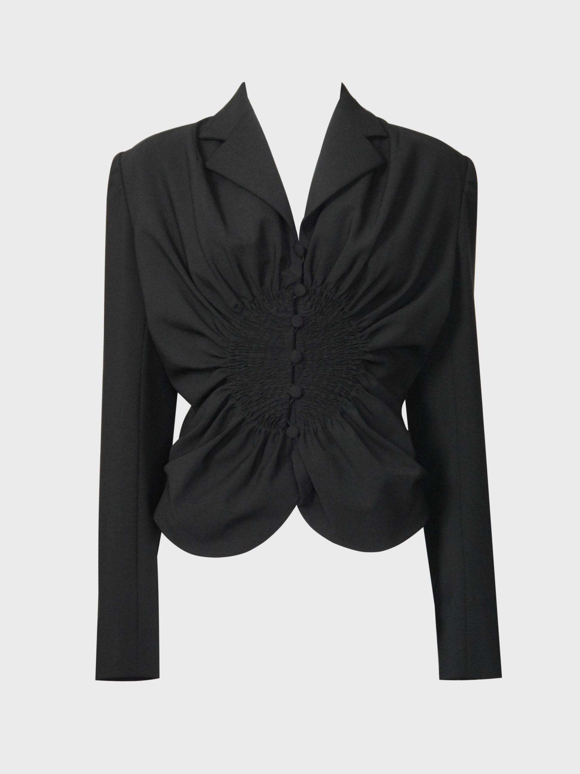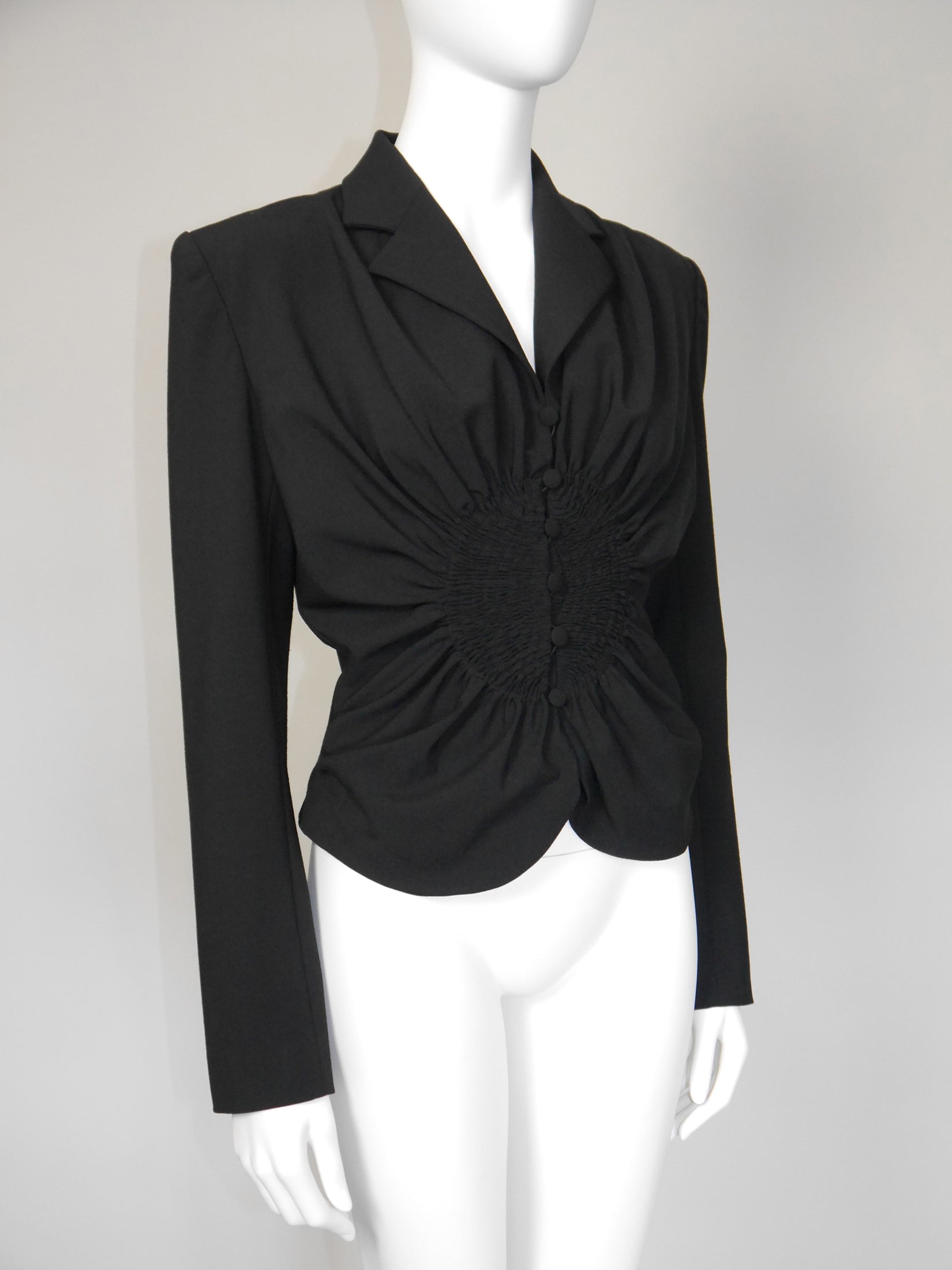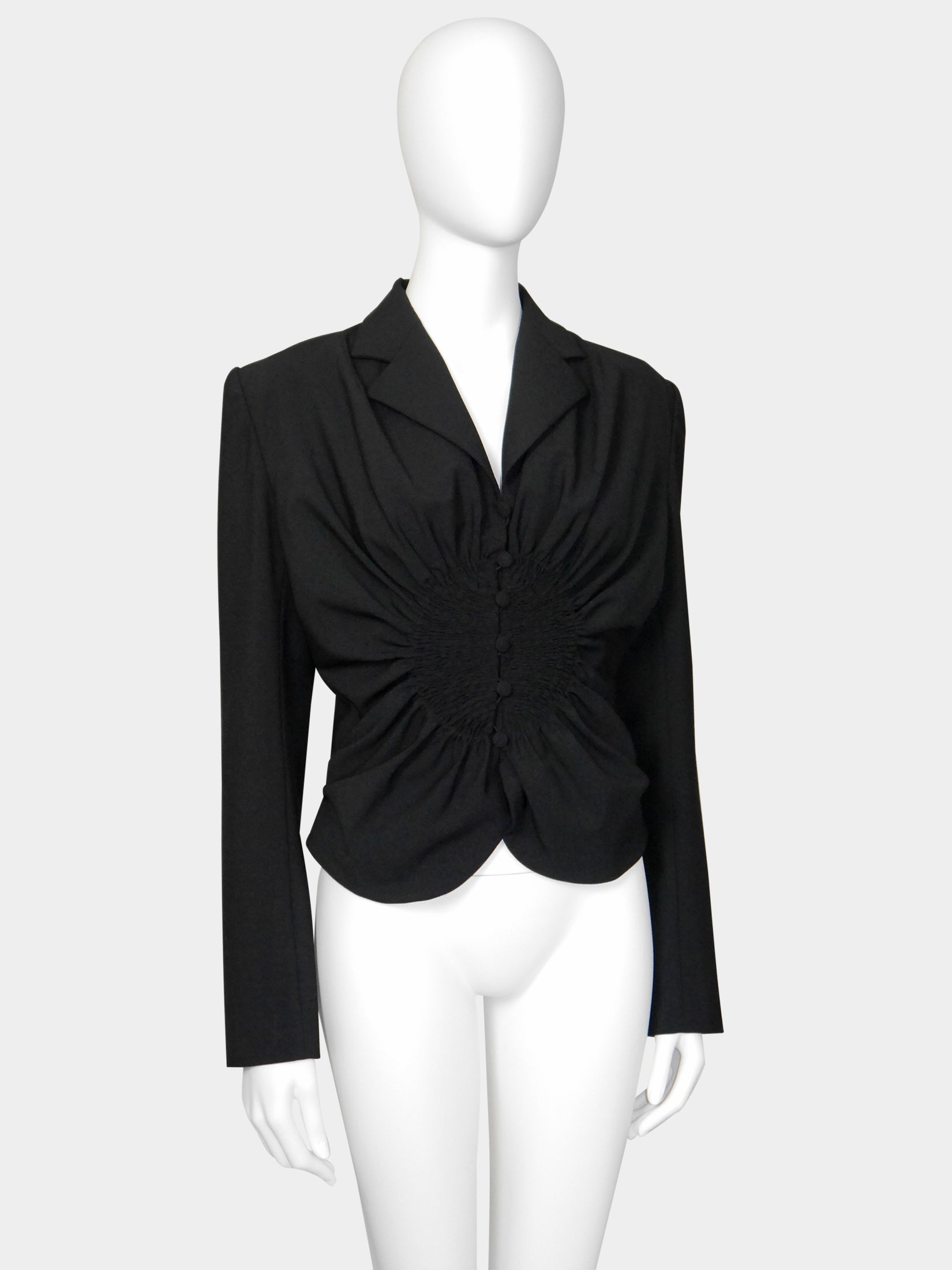 This rare and iconic vintage John Galliano jacket from Fall 1997 is crafted from a fine wool blend of ultimate quality and features an extremely refined cut with sculpted shoulders, extra long, slim sleeves and a very unique front with masterfully gathered fabric that comes together in a circular smocked detail that beautifully accentuates the waist. The jacket closes with Galliano's signature row of fabric-covered buttons and finishes with a curved hemline. 60% wool, 36% polyester, 4% elasthane. Fully lined in 97% silk, 3% elasthane. Made in France. One of the most beautiful jackets ever conceived.