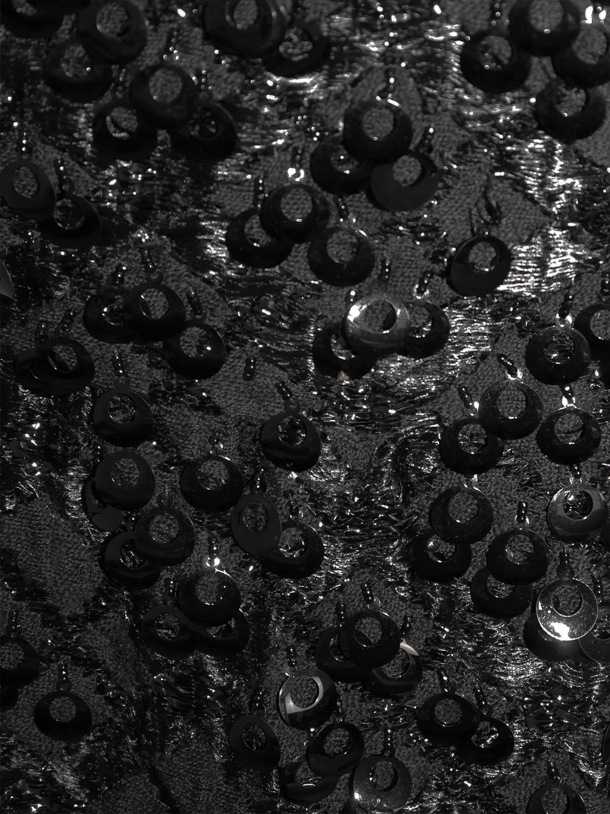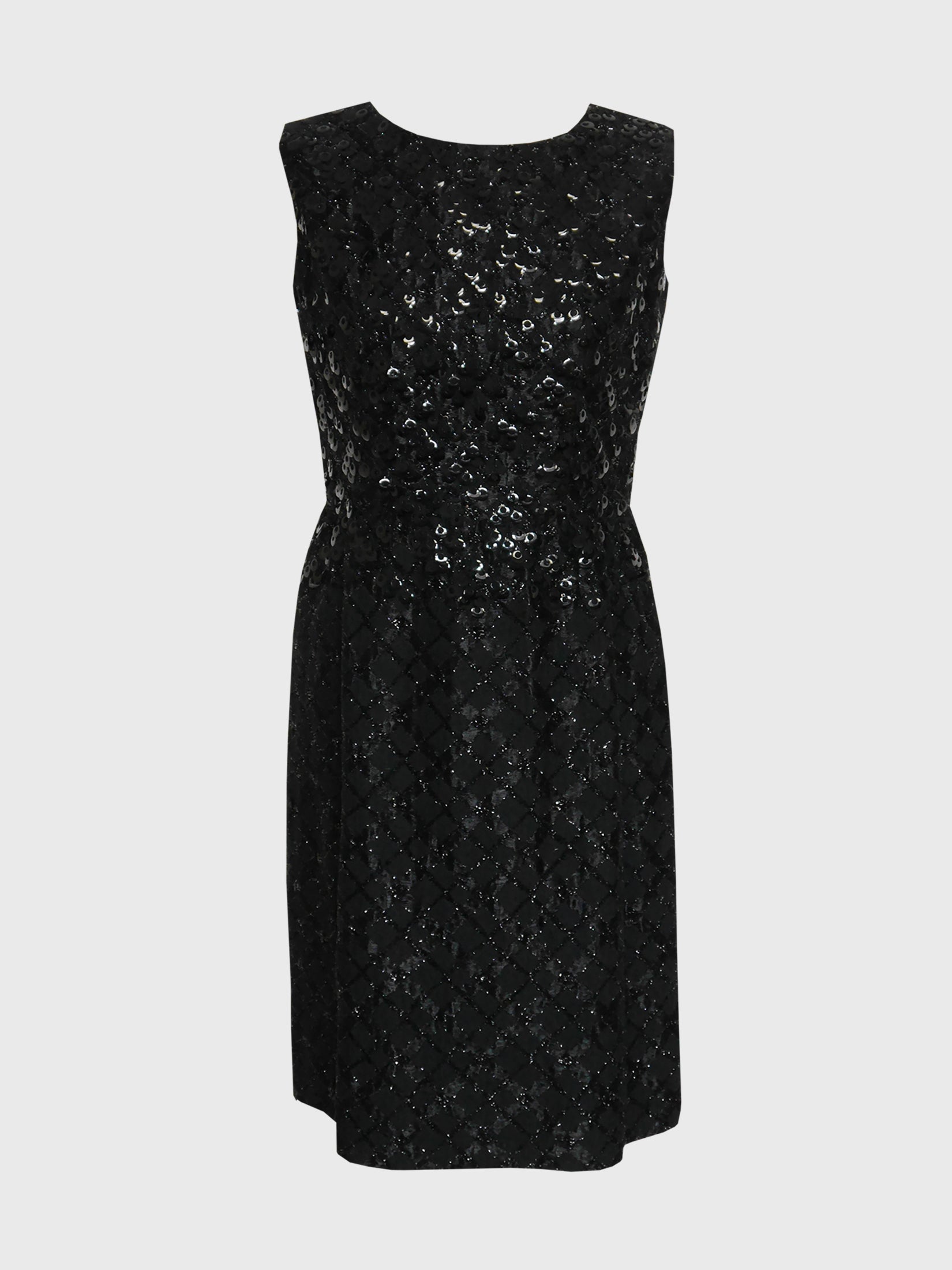 This rare Jeanne Lanvin cocktail dress from the 1960s is made of a silky soft wool jacquard in deep black with interwoven sparkling silver and black lurex threads. The bodice is adorned with large dangling sequins, each of which is fastened to a row of two or three tiny black beads. Simple sleeveless cut, knee-length. The dress closes with a back zipper and a metal hook & eye. It features an internal waist stay and is fully lined; the underskirt fastens with snap buttons. Largely done by hand. Made in France.