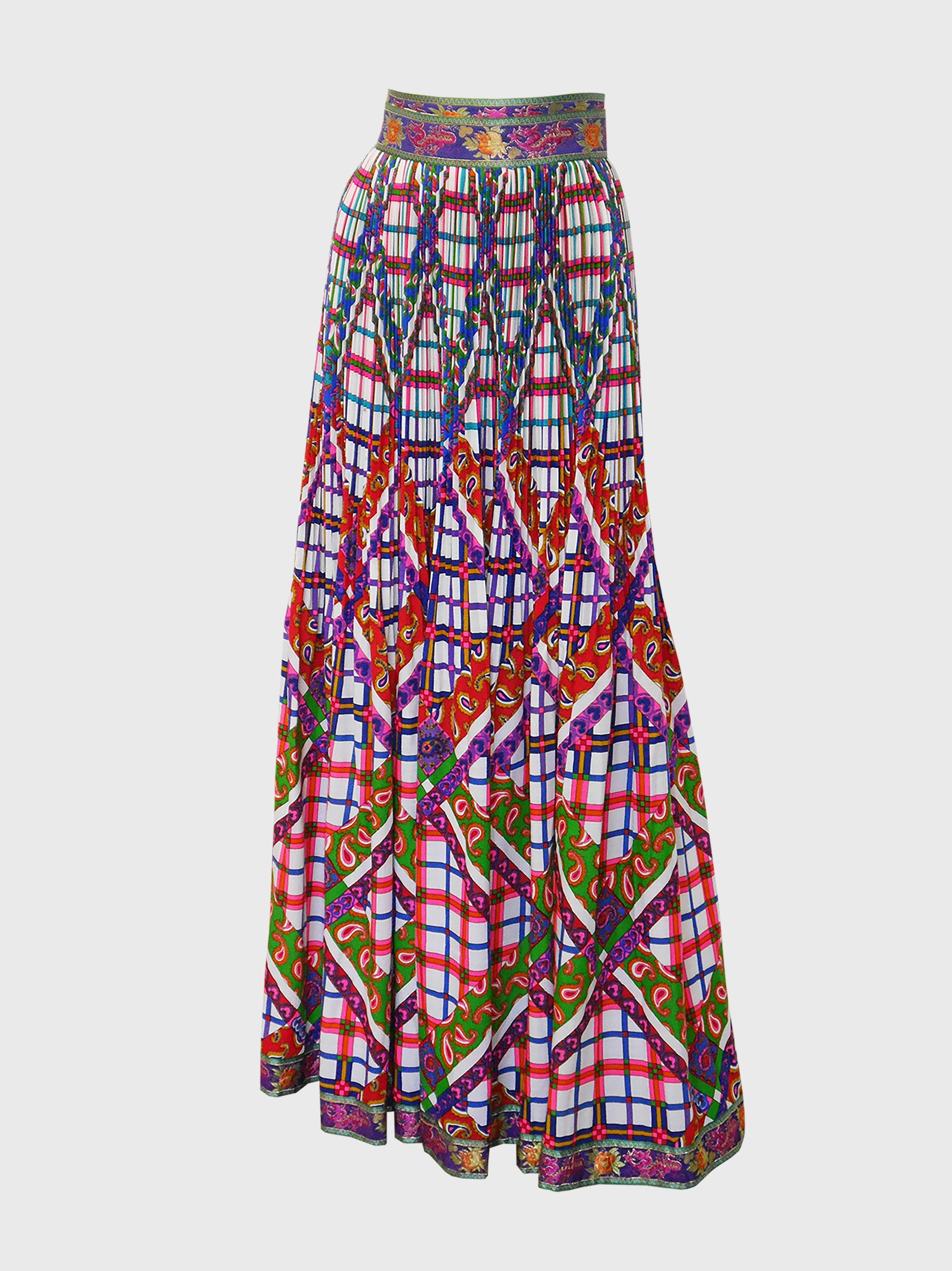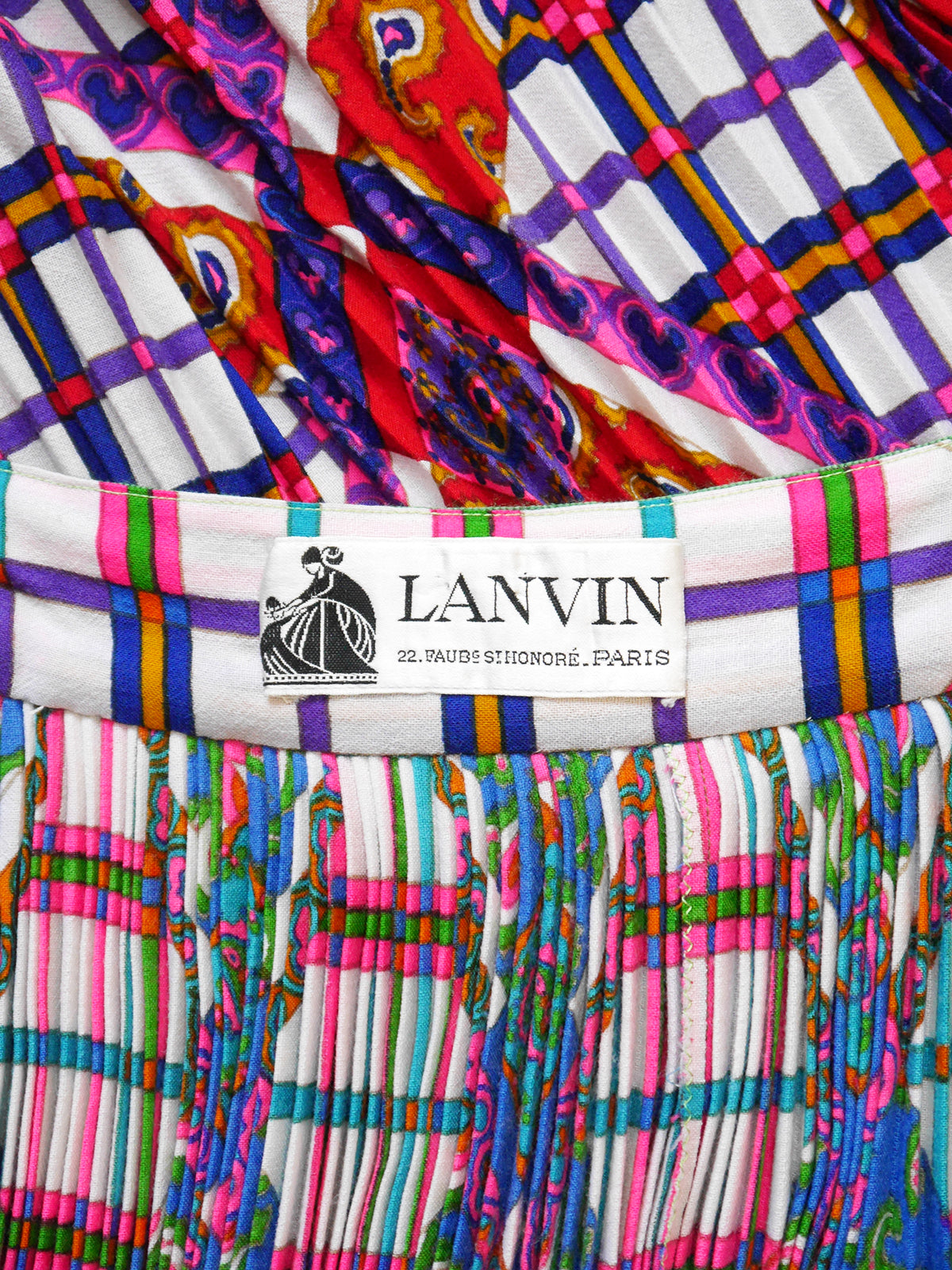 This spectacular vintage Lanvin set from the early 1970s, probably Spring 1972, comprises a maxi skirt and a large triangular stole and is crafted from a white wool crêpe with an amazing graphic and paisley print in deep and highly saturated colours, almost of a neon quality.