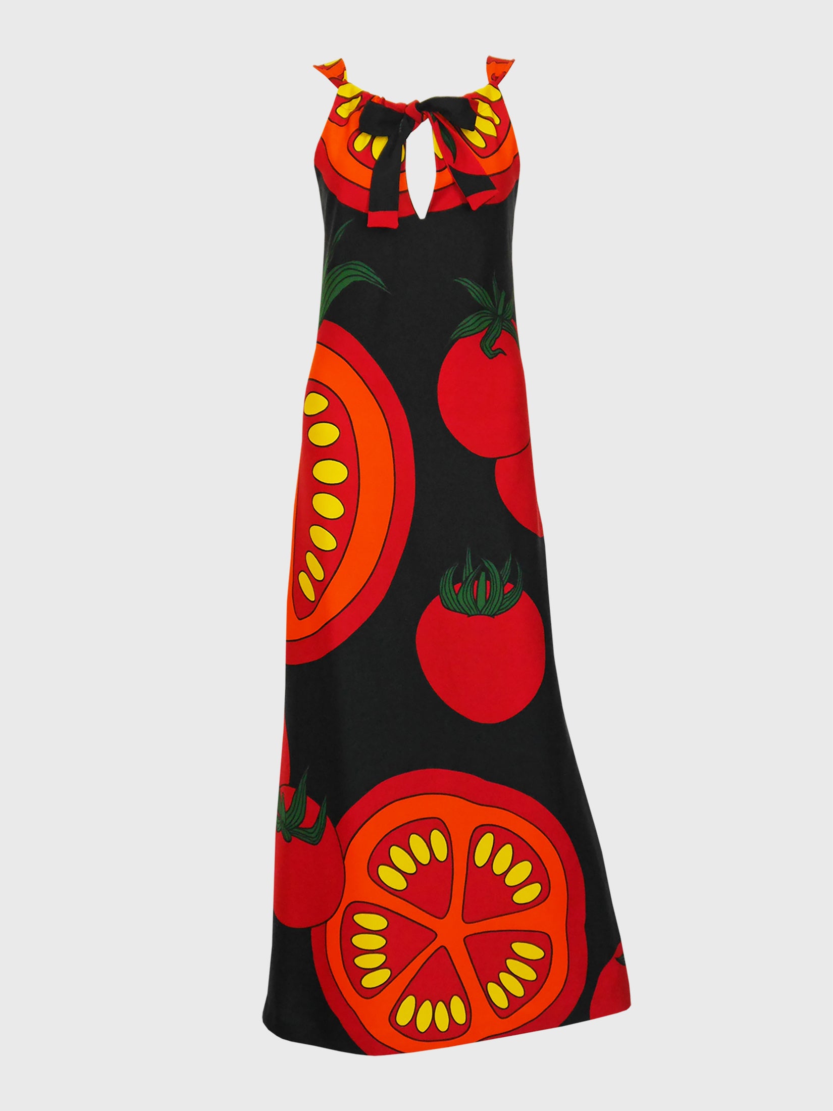 It's all about the print with this beautiful Lanvin summer maxi dress from the 1970s - a super large-scale, crazy good tomato print in red, orange, yellow and green against a black background. The dress features a simple, fitted cut with a keyhole neckline. There are two bands that are tied at the center front that serve as shoulder straps and a kind of inverted halter neck at the same time - a clever construction that allows for some flexibility in the bust area. The dress slips on to wear and is unlined. An eye-catching, fun piece, perfect for summer days and nights, lightweight and easy to travel with. No material tag, 100% synthetics. Made in France.