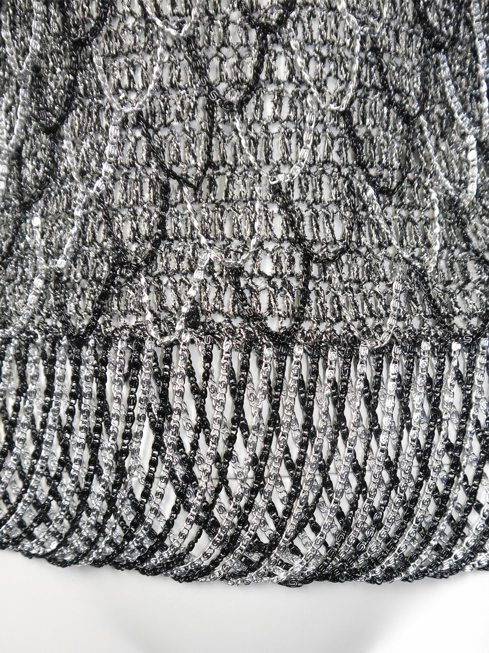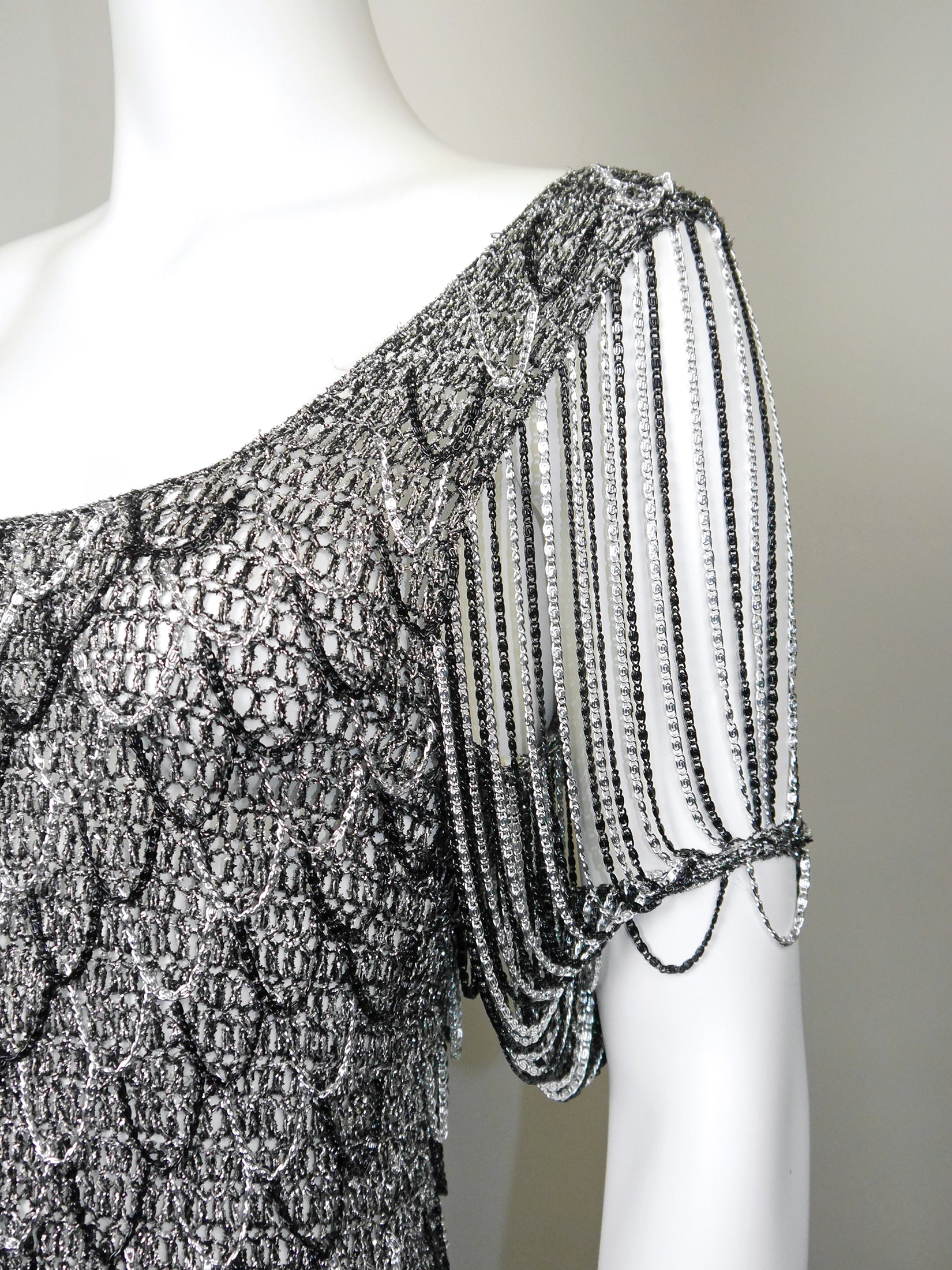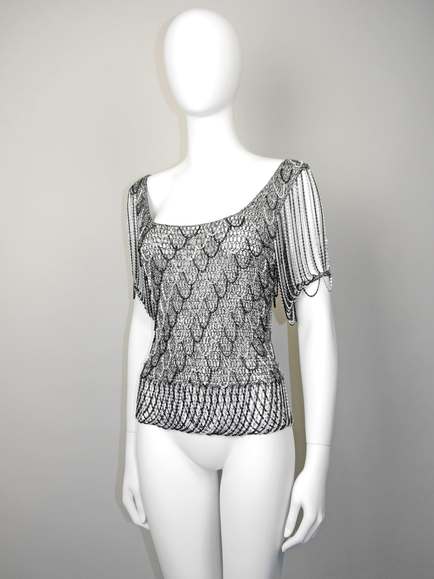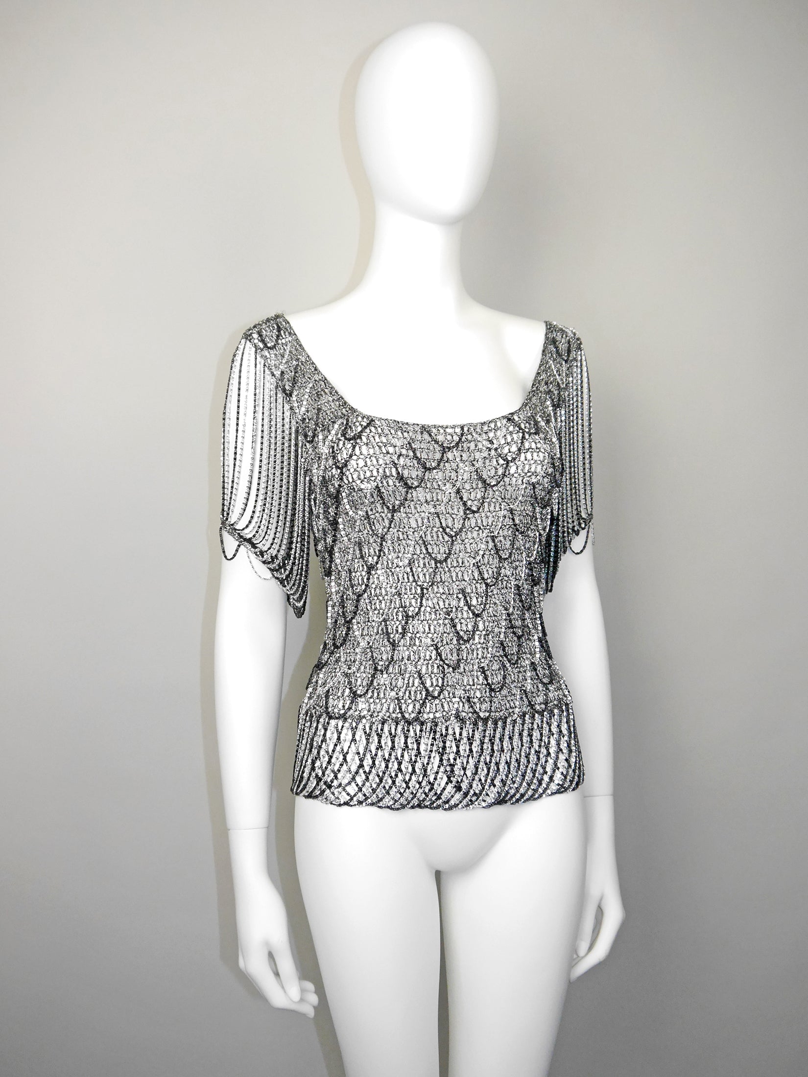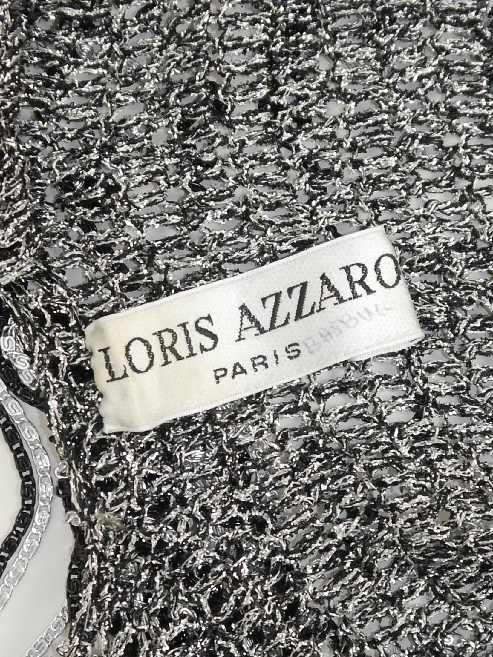 Metallic crochet tops with chainmail elements are among Loris Azzaro's iconic classics, and this exquisite piece from the early 1970s is a rare treasure. Crafted from silver metallic lurex yarn, it features striking black and silver-tone chainmail sleeves, long chainmail fringes along the hemline, and intricate chainmail embellishments throughout. Check the images to truly appreciate these fantastic details!