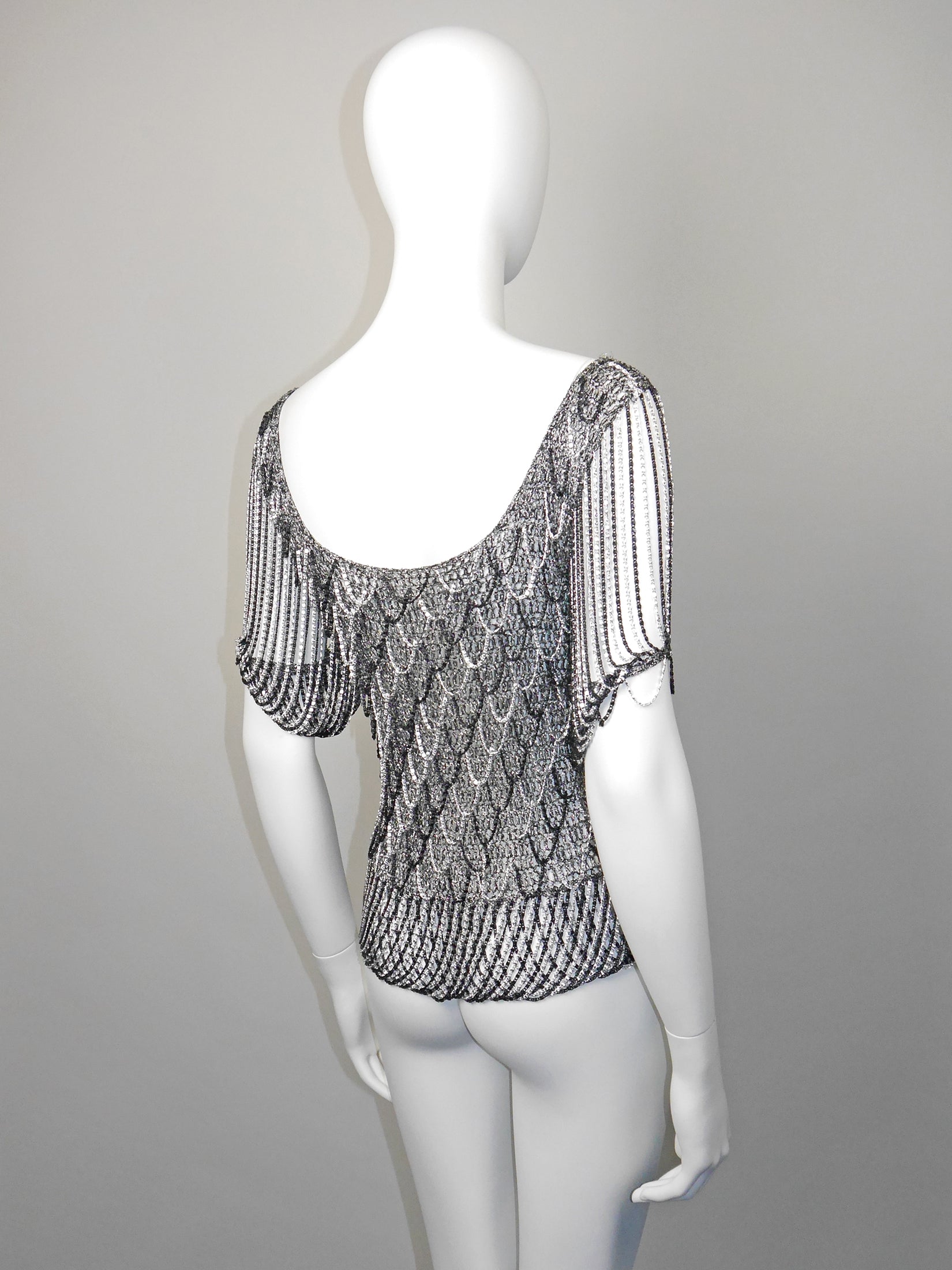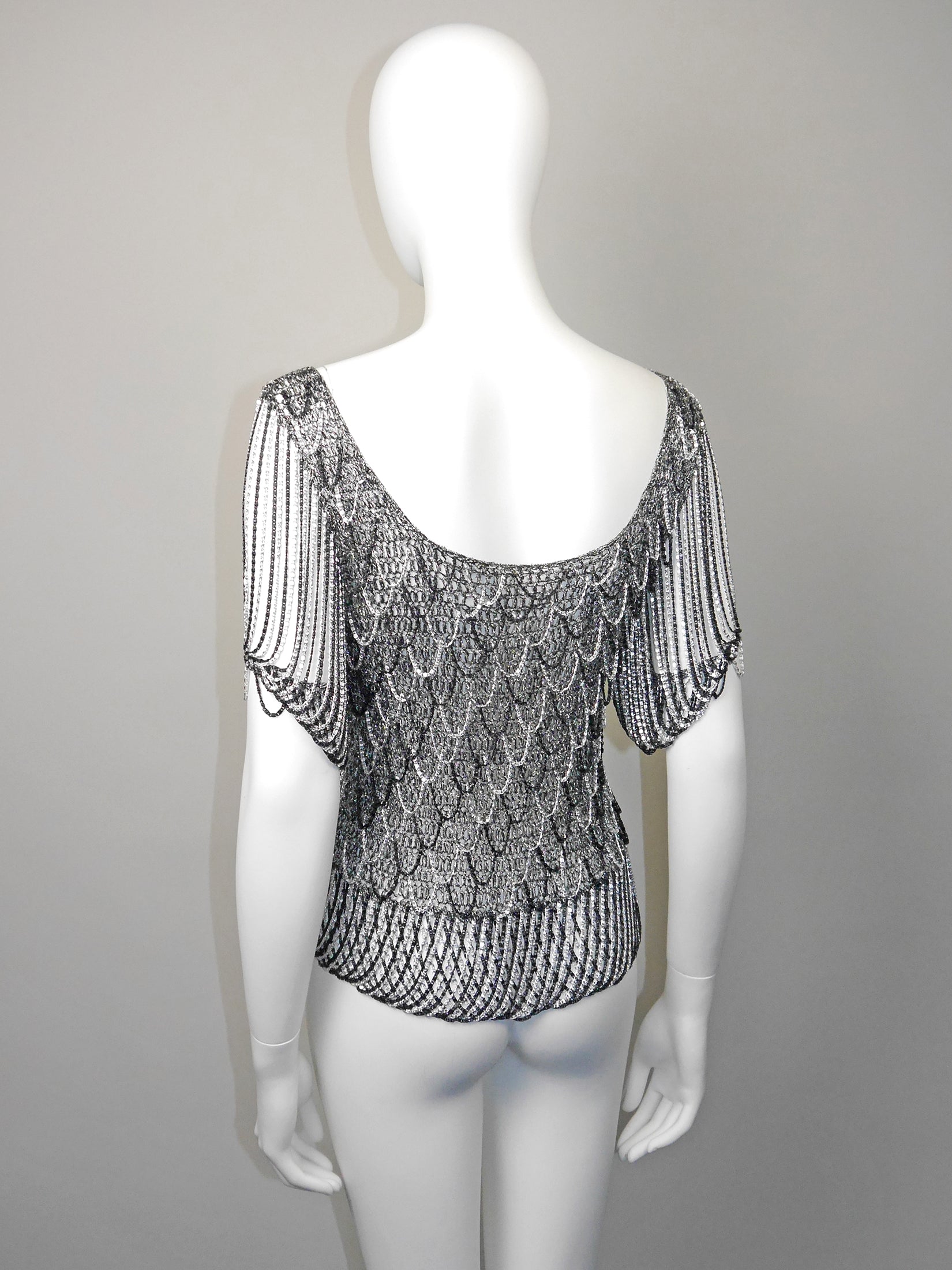 LORIS AZZARO 1970s Vintage Silver & Black Chainmail Crochet Evening Top Size S