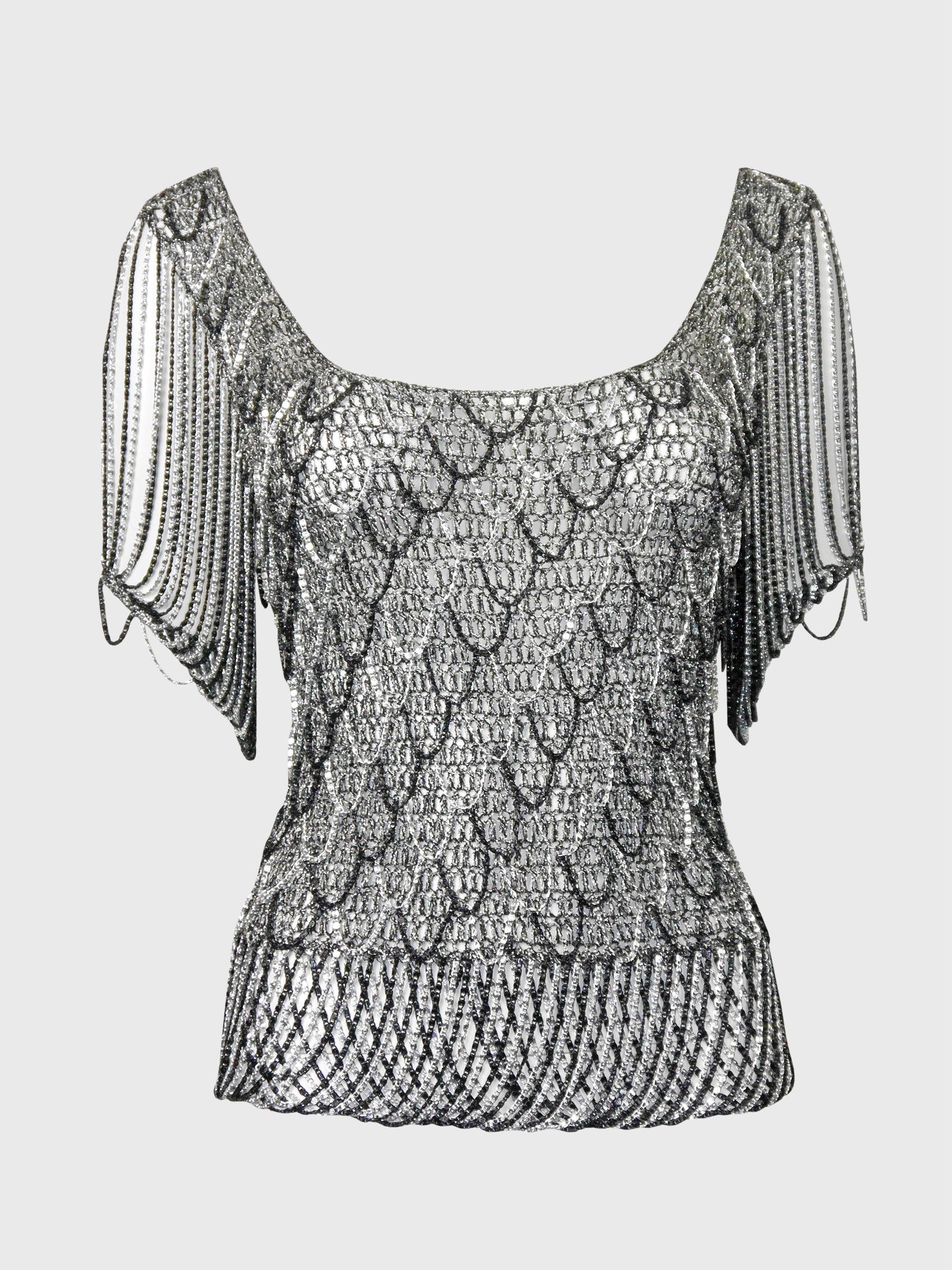 The top has a fitted silhouette with a widely scooped neckline on the front and back, paired with short sleeves. With its substantial weight from the chainmail elements, this piece makes a glamorous statement. Made in France.