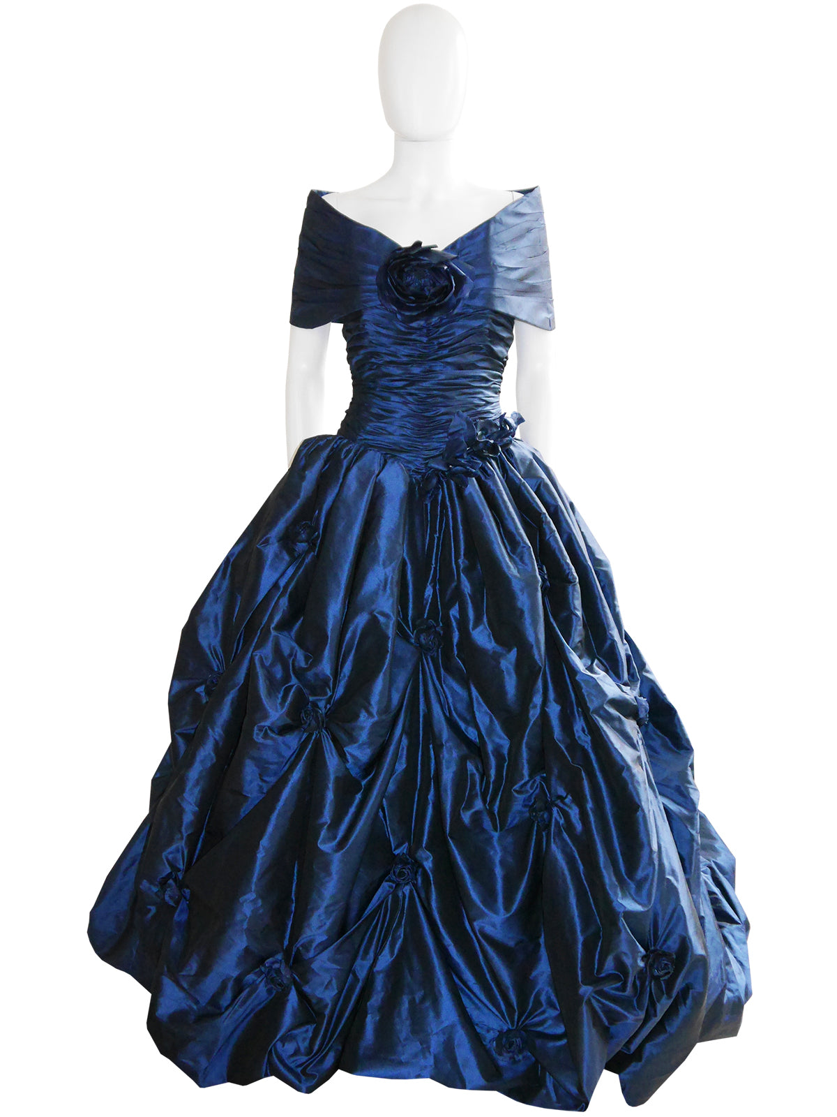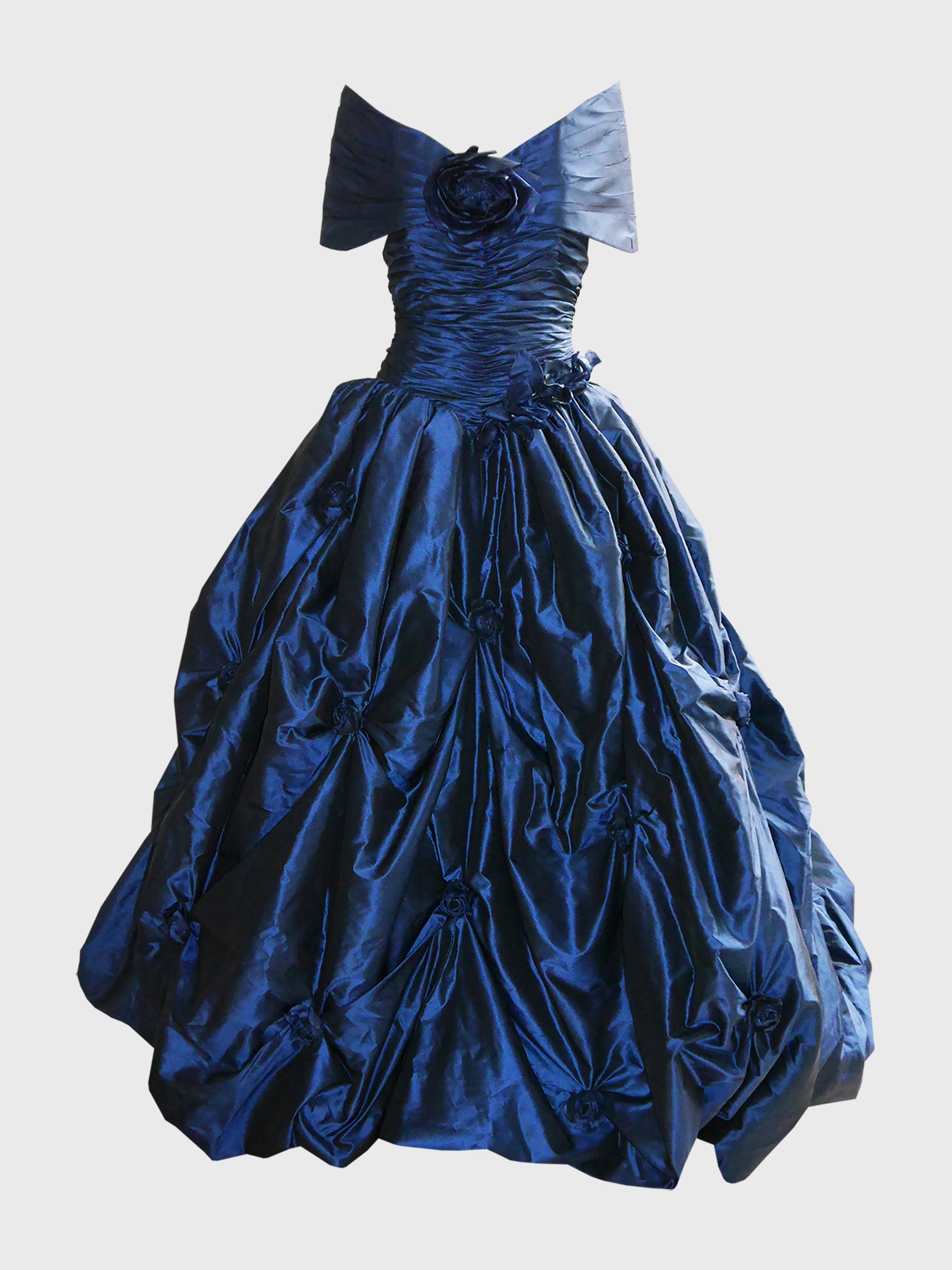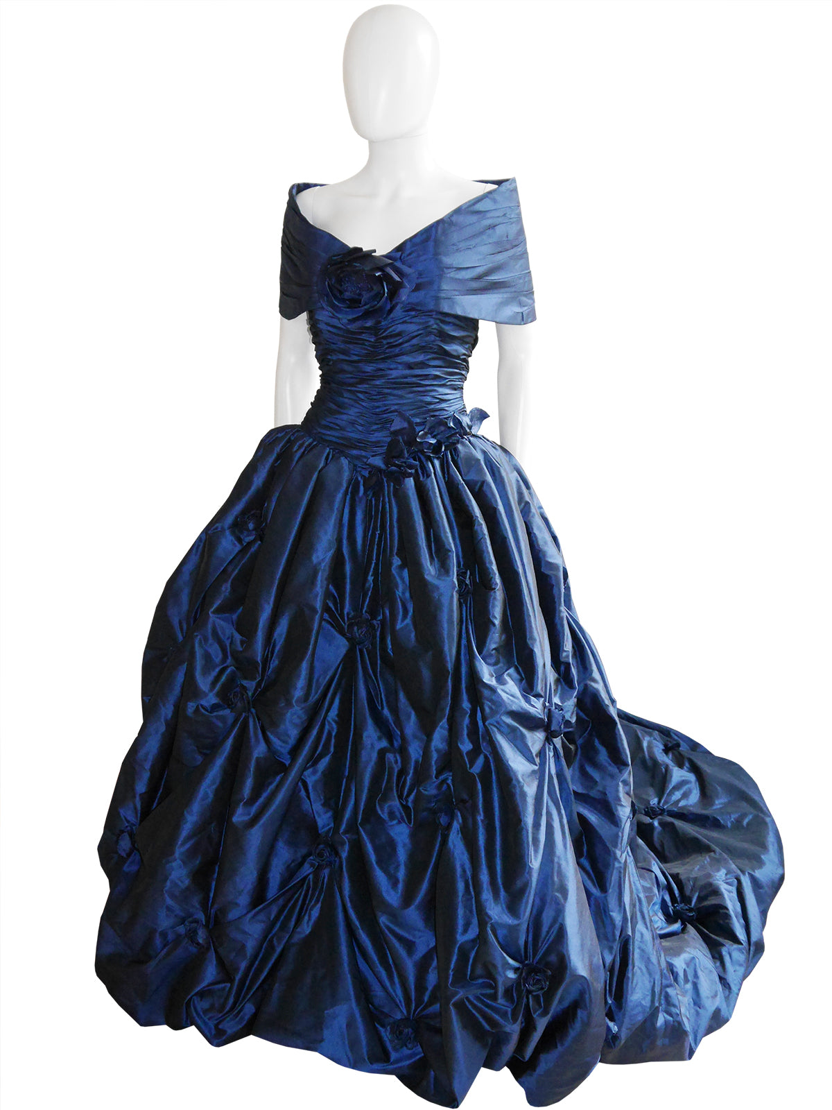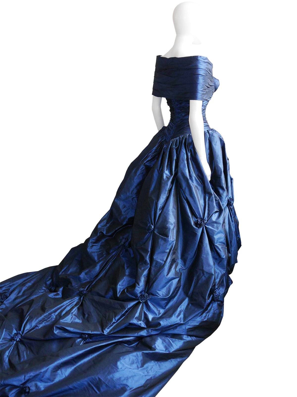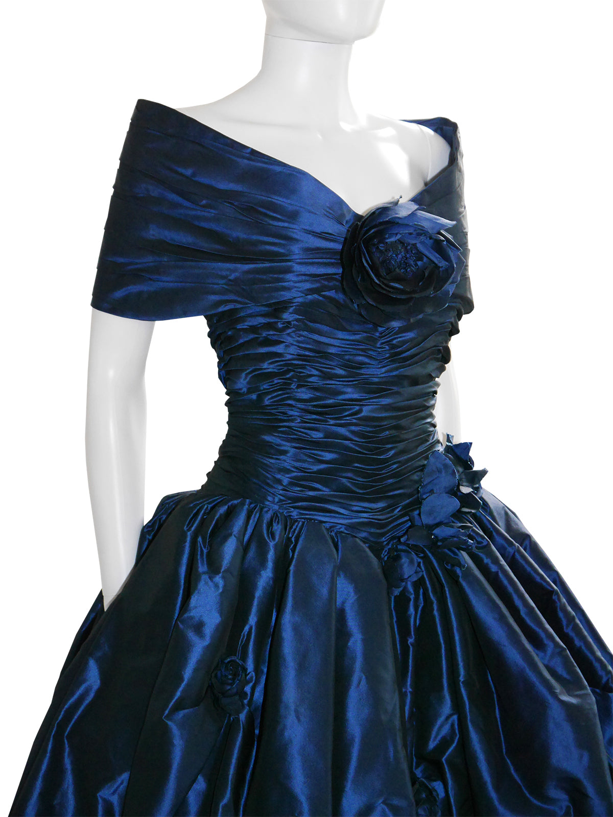 This gown is crafted from yards and yards of dark blue silk taffeta with decorative floral adornments and features a strapless fitted bustier bodice with densely gathered fabric, internal boning and a built-in wired bra. The skirt is incredibly full (it is padded with a generous amount of netting for structure and volume) and features a dramatic train. The dress closes with a back zipper and metal hooks and eyes and comes with a complementing shoulder stole with a large silk flower and a hidden hook and eye closure beneath. The dress is lined in blue silk taffeta and hand-finished. Please note that this piece is unsigned. A reference photo is available upon request.
