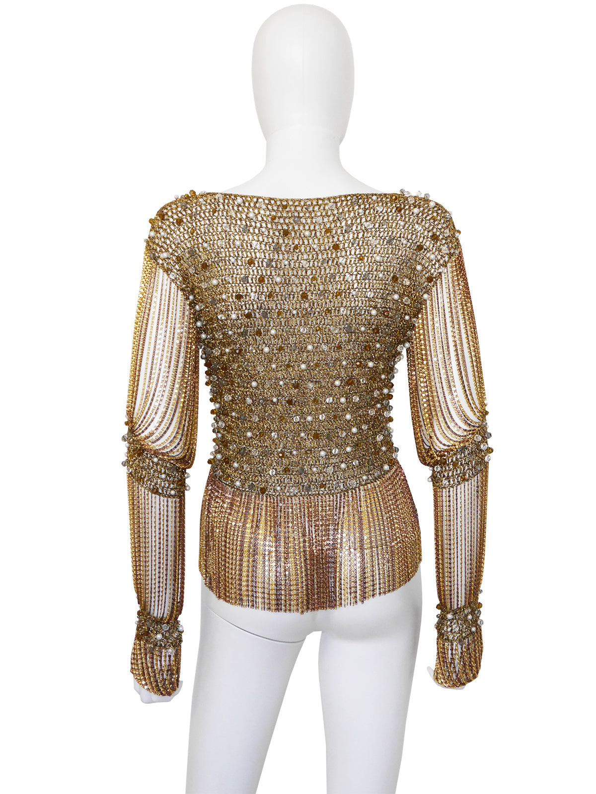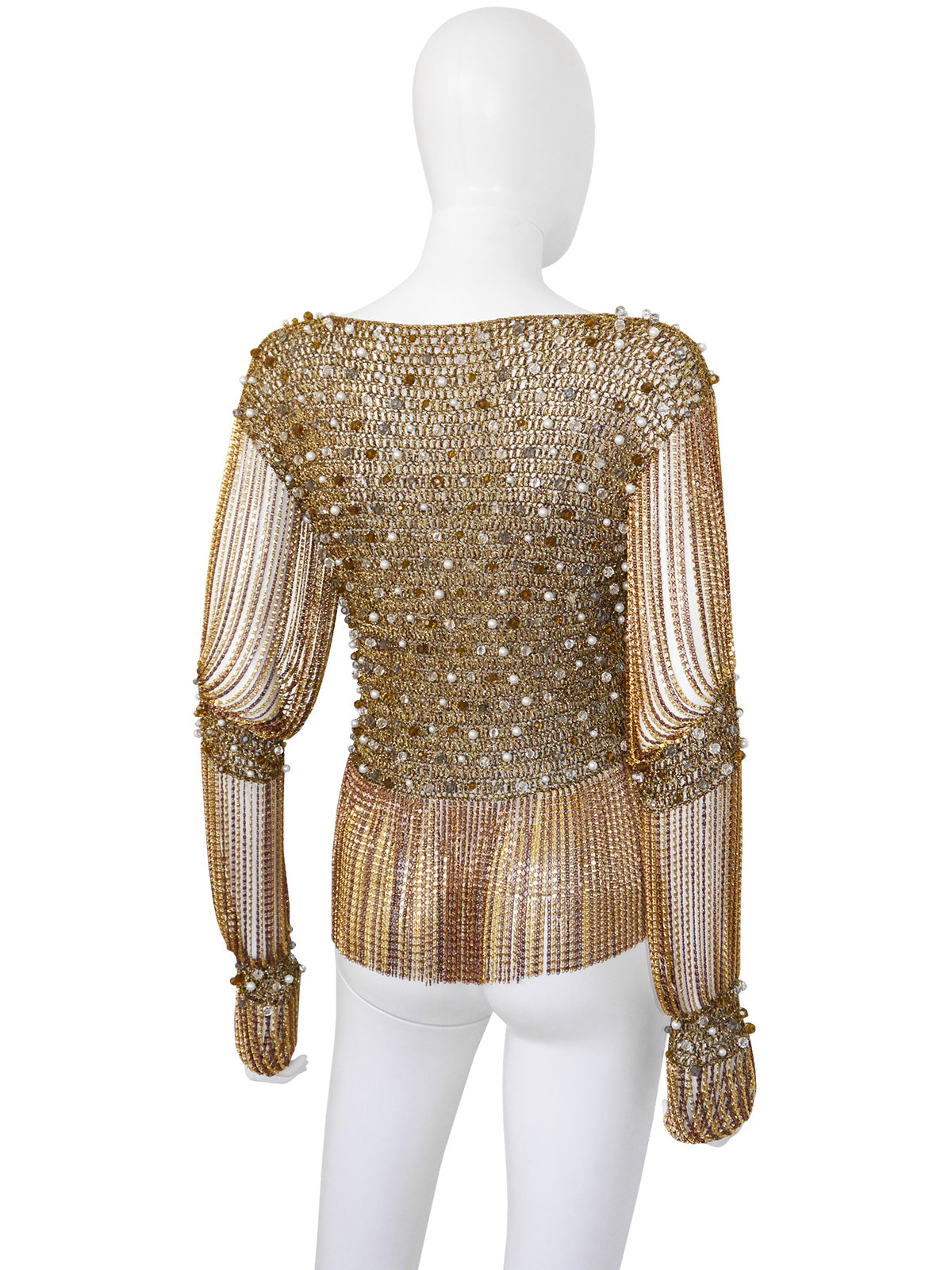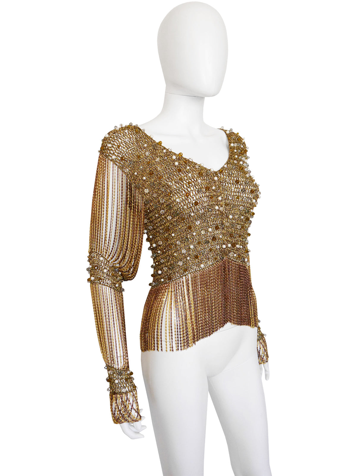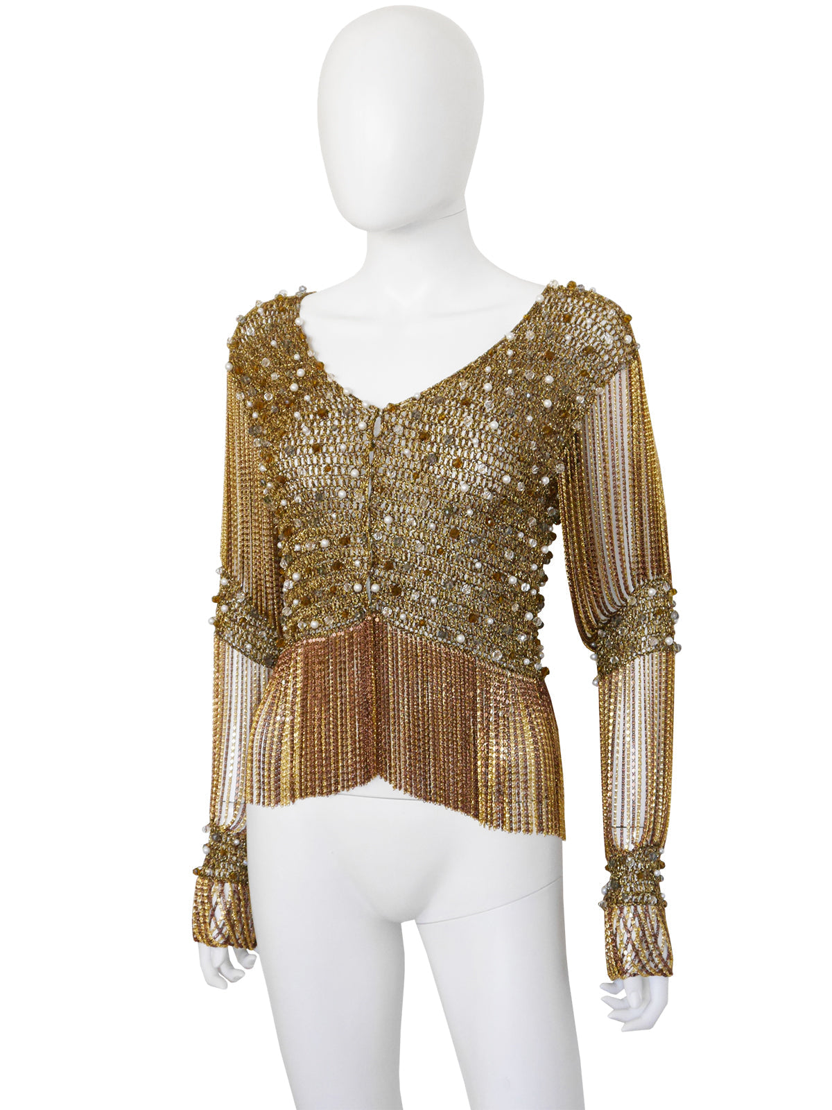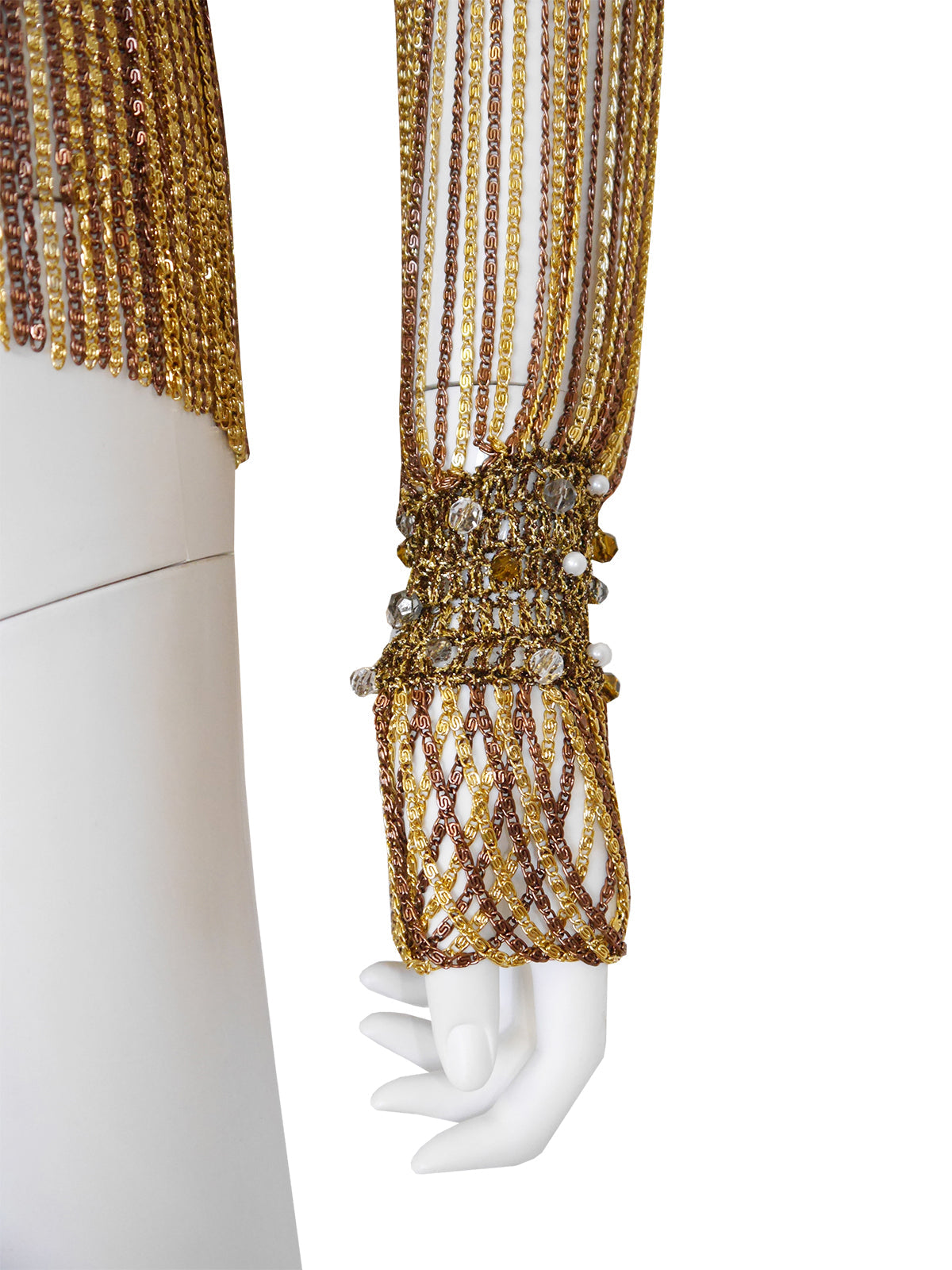 Metallic crochet tops with chainmail elements and beaded details belong to Loris Azzaro's ultimate classics, and this particular version from the early 1970s is the most intricate and elaborate one you could possibly find. The top is crocheted from a gold metallic lurex yarn with gold- and copper-tone chainmail sleeves, long chainmail fringes all around the hemline and beaded adornments all-over - please have a look at the images to get an impression of those fantastic details. The top features a fitted cut with long sleeves and closes at the center front with hidden snap buttons. It has substantial weight due to the chainmail elements and is an incredibly glamorous piece. Made in France.