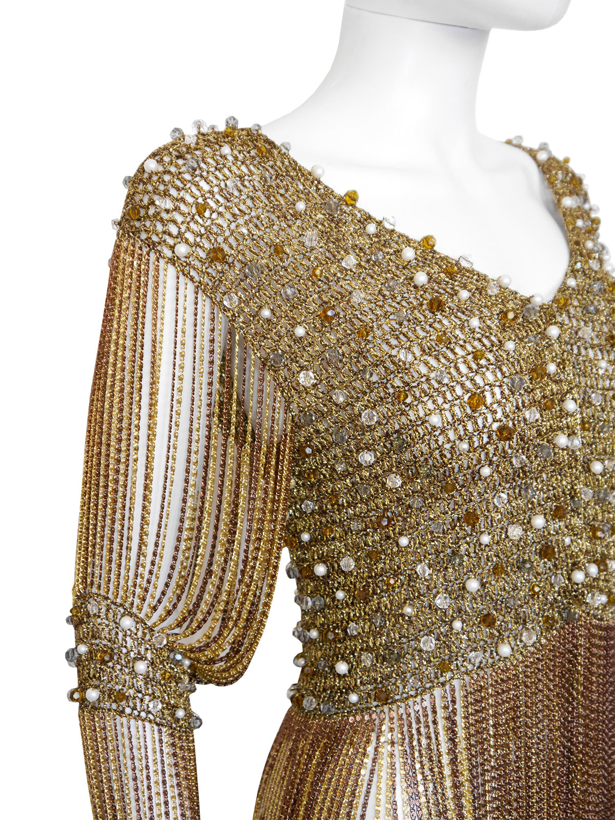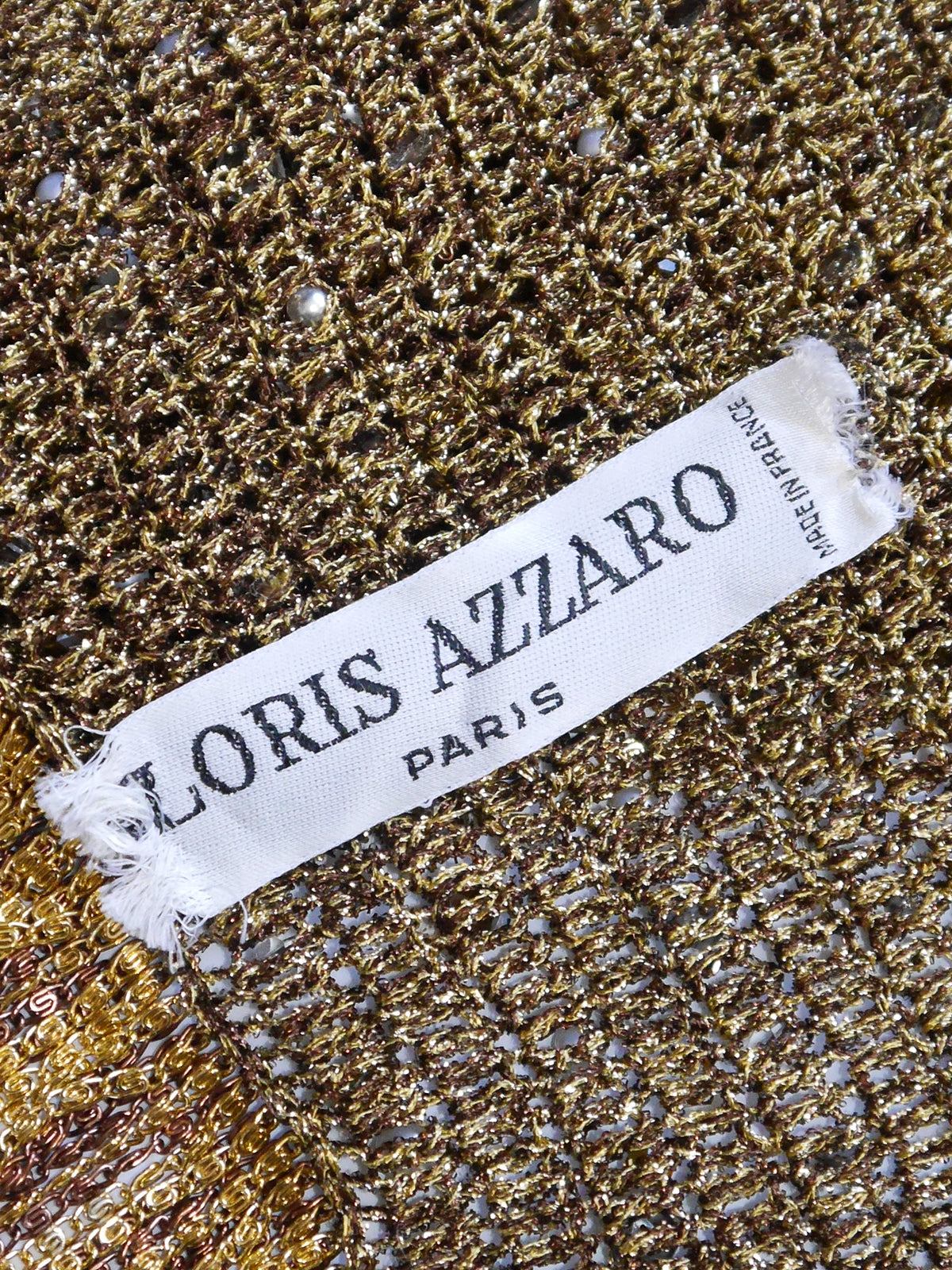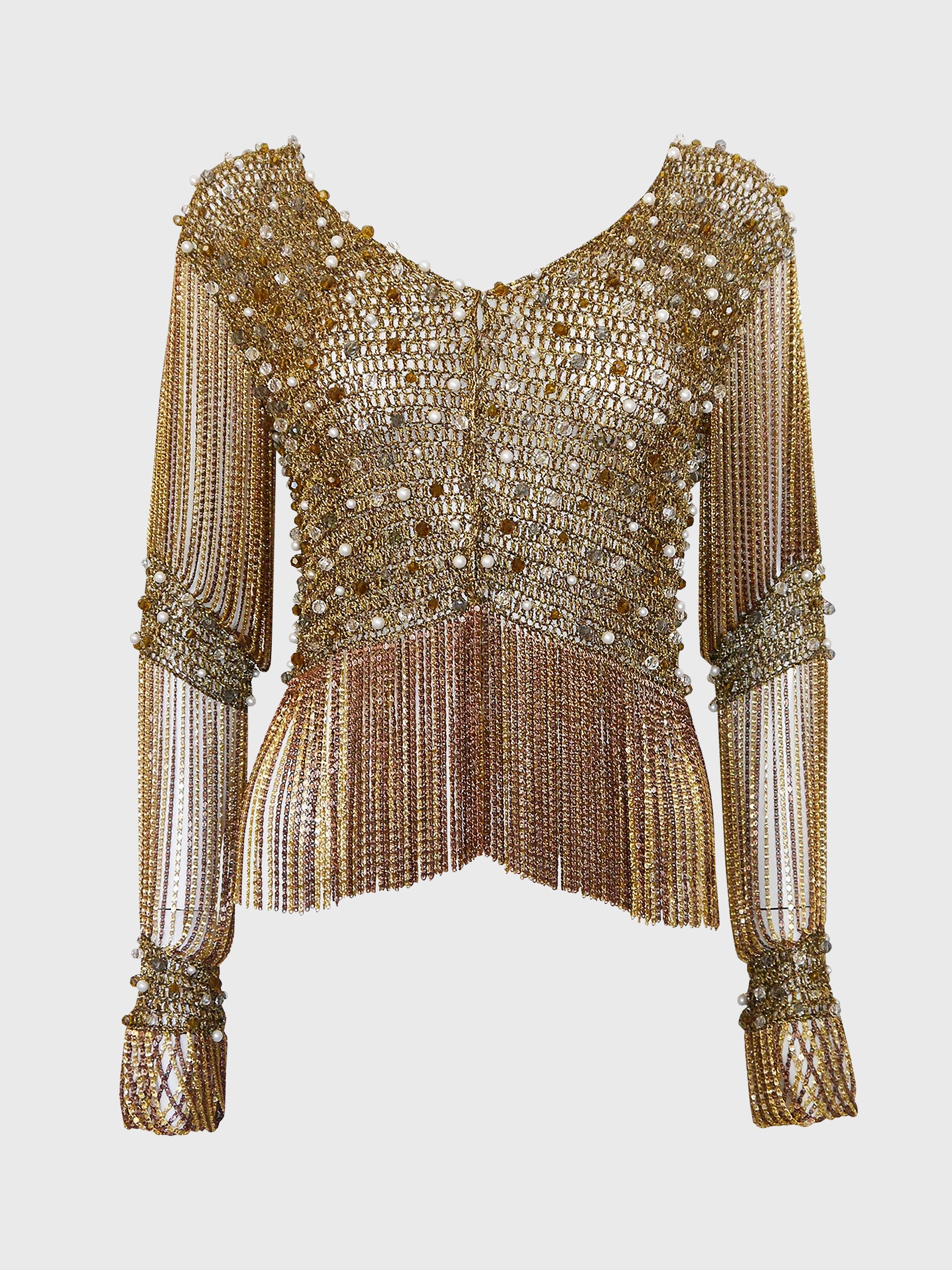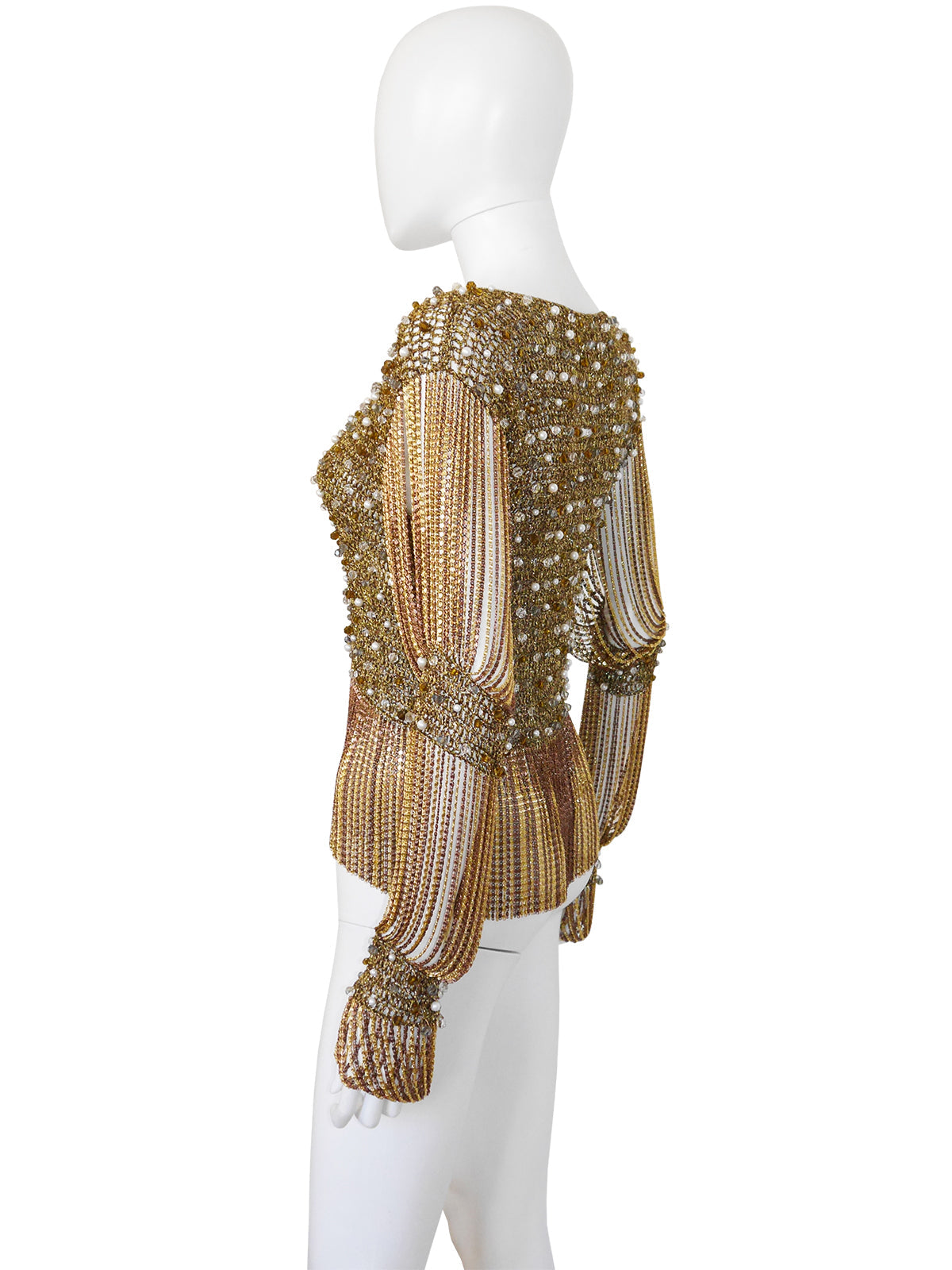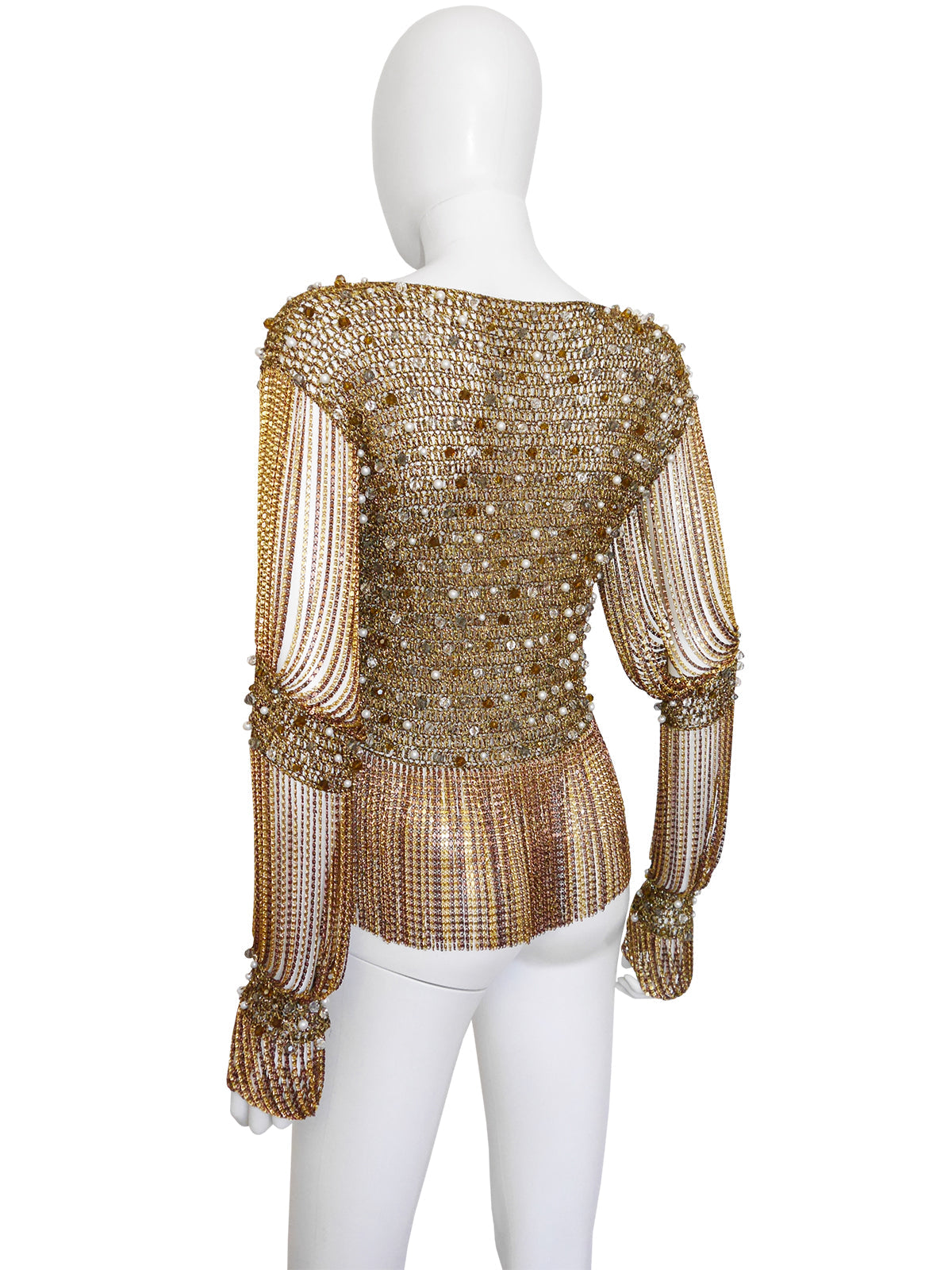 Metallic crochet tops with chainmail elements and beaded details belong to Loris Azzaro's ultimate classics, and this particular version from the early 1970s is the most intricate and elaborate one you could possibly find. The top is crocheted from a gold metallic lurex yarn with gold- and copper-tone chainmail sleeves, long chainmail fringes all around the hemline and beaded adornments all-over - please have a look at the images to get an impression of those fantastic details. The top features a fitted cut with long sleeves and closes at the center front with hidden snap buttons. It has substantial weight due to the chainmail elements and is an incredibly glamorous piece. Made in France.